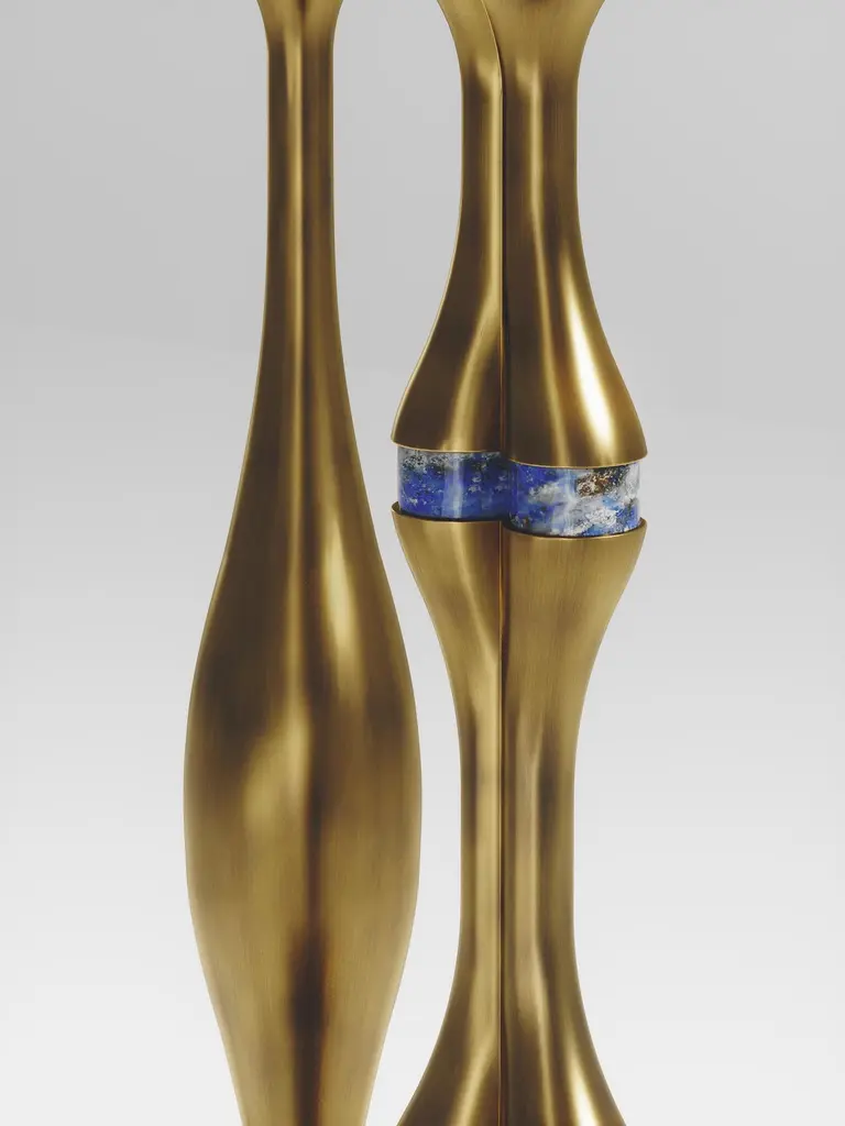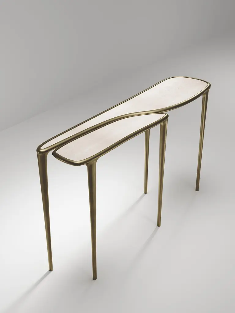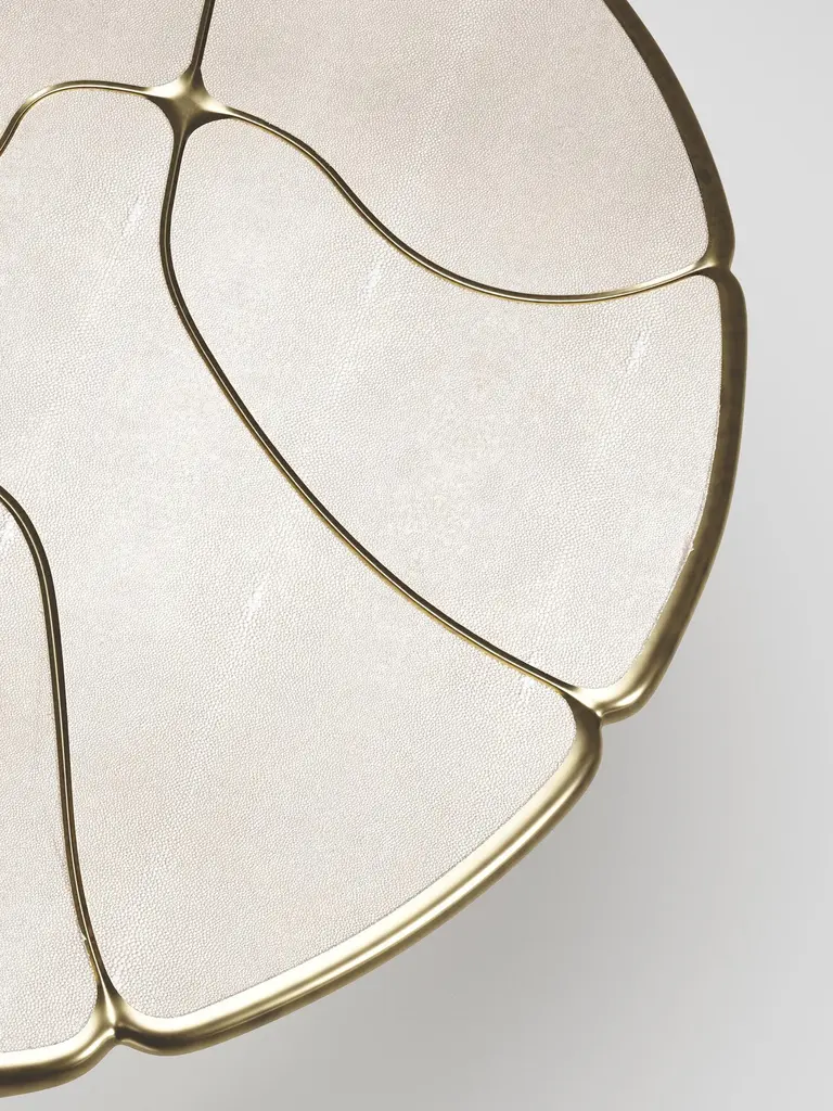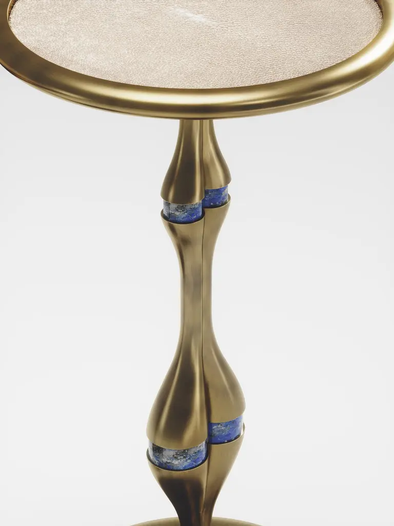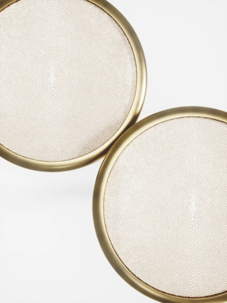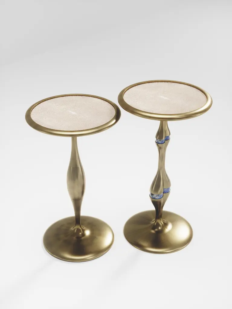 The Paris based label has distinguished themselves since their launch, with their iconic use of shagreen mixed with brass and other exotic materials. All furniture is handcrafted by skilled artisans, ultimately making each piece unique, designed in Paris and produced in the Philippines.The Frequency Nesting side tables by R & Y Augousti are sleek with a vintage-modern feel. The piece explores fluid organic lines with subtle detailing to create the signature Augousti aesthetic. The piece is inlaid in a mixture of cream shagreen and bronze patina brass. This listing is for the nesting set, the tables are available to purchase separately as well. Part of the Frequency capsule, see images at end of slide.The dimensions of this piece are :Side Table 1 - 35 dia x 63 cmSide Table 2- 35 dia x 59 cmAll R & Y Augousti pieces are handmade by artisans, ultimately making each piece unique.Wipe clean with soft dry cloth.Acclaimed design duo Ria & Yiouri Augousti have established themselves since the 1990s as pioneers of modern-vintage style through their luxurious Art Deco inspired collections.The Paris based label has distinguished themselves since their launch, with their iconic use of shagreen mixed with brass and other exotic materials. All furniture is handcrafted by skilled artisans, ultimately making each piece unique. All shagreen-covered items should be kept out of direct sunlight, color variants may occur on the stingray and other exotic finishes, but this showcases the Parisian label's commitment to creating authentic luxurious products using natural components.