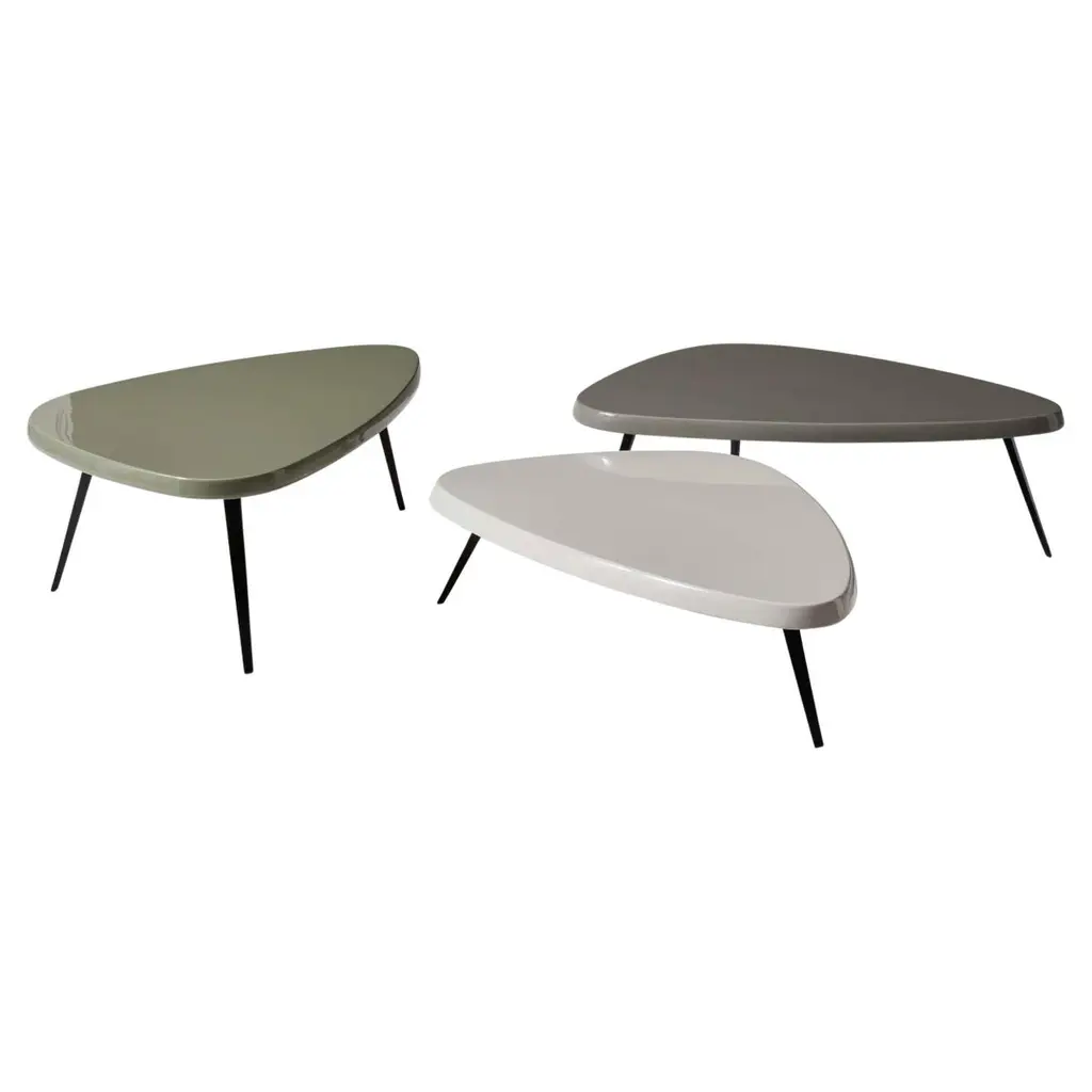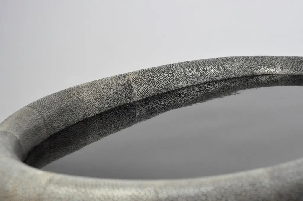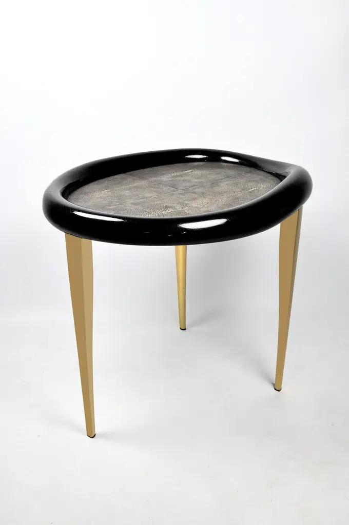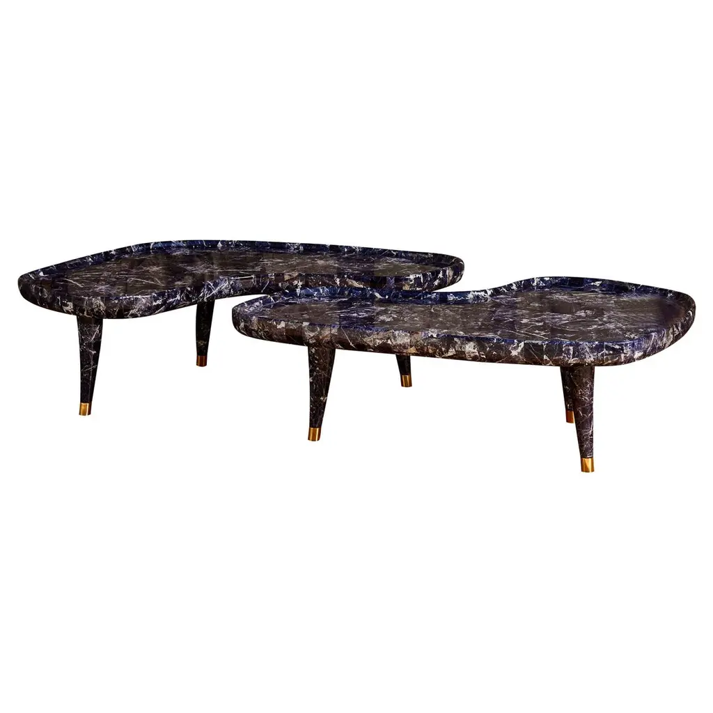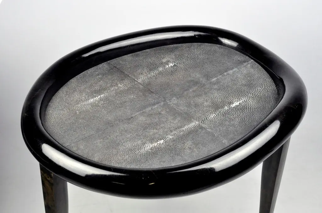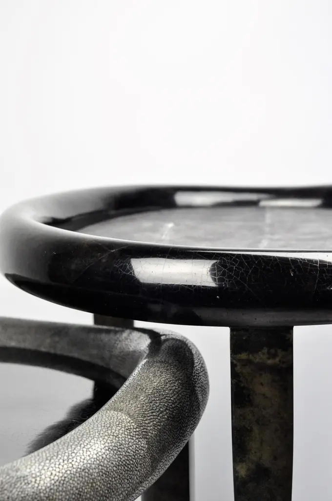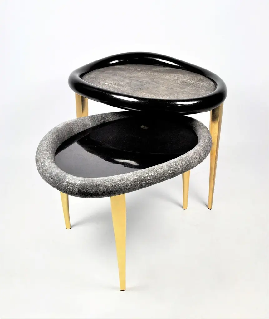 The set of 2 nesting tables is made of a nice mix of dark grey shagreen and polished black pen shell marquetry.The feet are covered with black parchment (goatskin).This nice set of organic side tables is very versatile and can be placed anywhere in both small and large rooms, as a side table or as a small coffee table.Size of the highest table: 22.8" x 17.3" x H 19.68" (58 x 44 x 50cm)Size of the lowest table: 22.8" x 17.3" x H 15.35" (58 x 44 x 39cm)We can customize these tables.You can choose a different color of shagreen and sea shell. Care instructions:To clean, simply wipe with a dry clean clothDo not use any cleaning agent on the surfaceKeep the shagreen dry and protected from direct sunlight and heat surfacesThis piece is handmade by our talented team of master craftsmen.