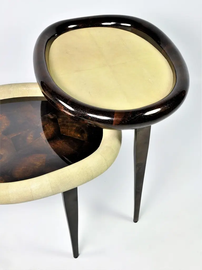 The set of 2 nesting tables is made of a nice mix of natural shagreen (ou ref ANTIC) and polished brown pen shell marquetry.The feet are covered with a brownish parchment (goatskin).This nice set of organic side tables is very versatile and can be placed anywhere in both small and large rooms, as a side table or as a small coffee table.Size of the highest table: 22.8" x 17.3" x H 19.68" (58 x 44 x 50cm)Size of the lowest table: 22.8" x 17.3" x H 15.35" (58 x 44 x 39cm)We can customize these tables.You can choose a different color of shagreen and sea shell. Care instructions:To clean, simply wipe with a dry clean clothDo not use any cleaning agent on the surfaceKeep the shagreen dry and protected from direct sunlight and heat surfacesThis piece is handmade by our talented team of master craftsmen.