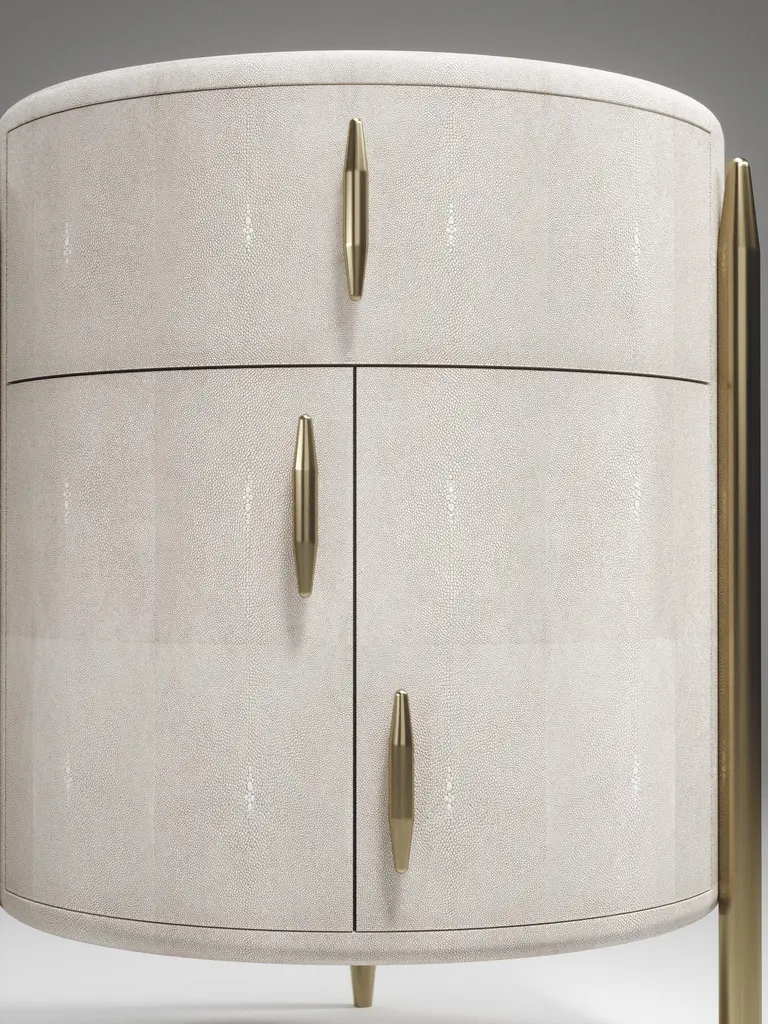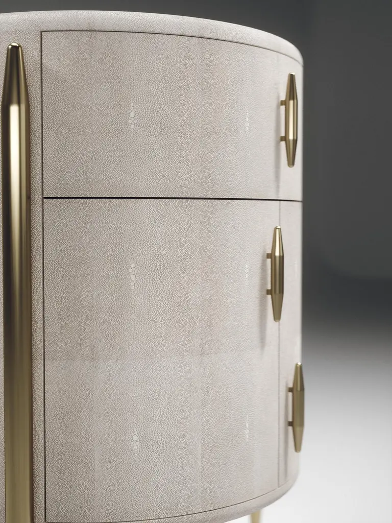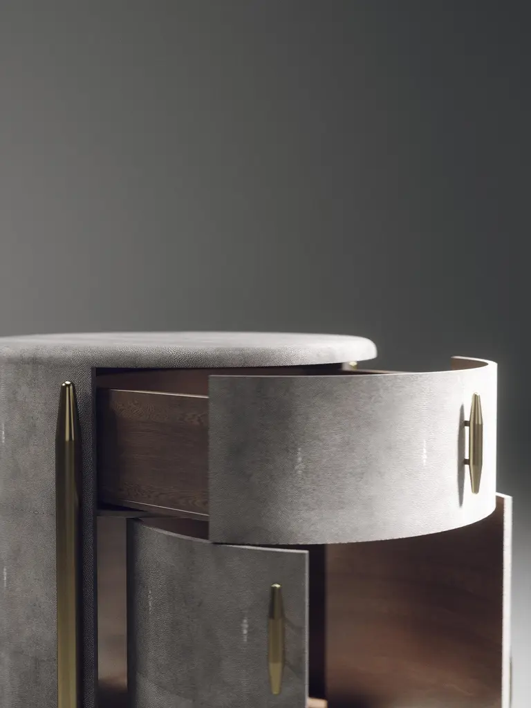 The Paris based label has distinguished themselves since their launch, with their iconic use of shagreen mixed with brass and other exotic materials. All furniture is handcrafted by skilled artisans, ultimately making each piece unique, designed in Paris and produced in the Philippines.The Dandy round bedside table by Kifu Paris is an elegant and a luxurious home accent, inlaid in light grey shagreen with bronze-patina brass details. This piece includes 1 drawer total and a cabinet below; the interiors are inlaid in gemelina wood veneer. Available in other finishes and as a square version see images at end of slide. This piece is designed by Kifu Augousti, the daughter of Ria and Yiouri Augousti. Custom sizing/finishing available on request.All shagreen pieces are hand-dyed by artisans.The dimensions of this piece are 45 dia x 60 cmAll Kifu Paris pieces are handmade by artisans, ultimately making each piece unique. Custom color or sizing available on request. Wipe clean with soft dry cloth.Although inspired by her parents, her collection of home accessories and furniture is a distinct identity of its own. Kifu uses handmade techniques of elaborate inlay patterns of shagreen, shells, semi-precious stones, materials she experienced as a child growing up in her parent’s studio, but interpreted in a younger quirkier way reflecting her youth. From her "jewelry inspired knobs" on decorative boxes, gold bar boxes and an extravagant inlay pattern mix of shagreen and shell inspired by galactic constellations, as seen on her enormous round mirror is refreshing to see. Kifu embodies whimsical elements throughout her collection and is not afraid to be daring and unexpected in her approach to design.All shagreen-covered items should be kept out of direct sunlight, color variants may occur on the stingray and other exotic finishes, but this showcases the Parisian label's commitment to creating authentic luxurious products using natural components.For all pieces inlaid with stone and semi-precious stones, due to the natural quality of the material color tonality and pattern placement may differ slightly per piece.