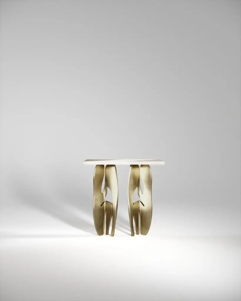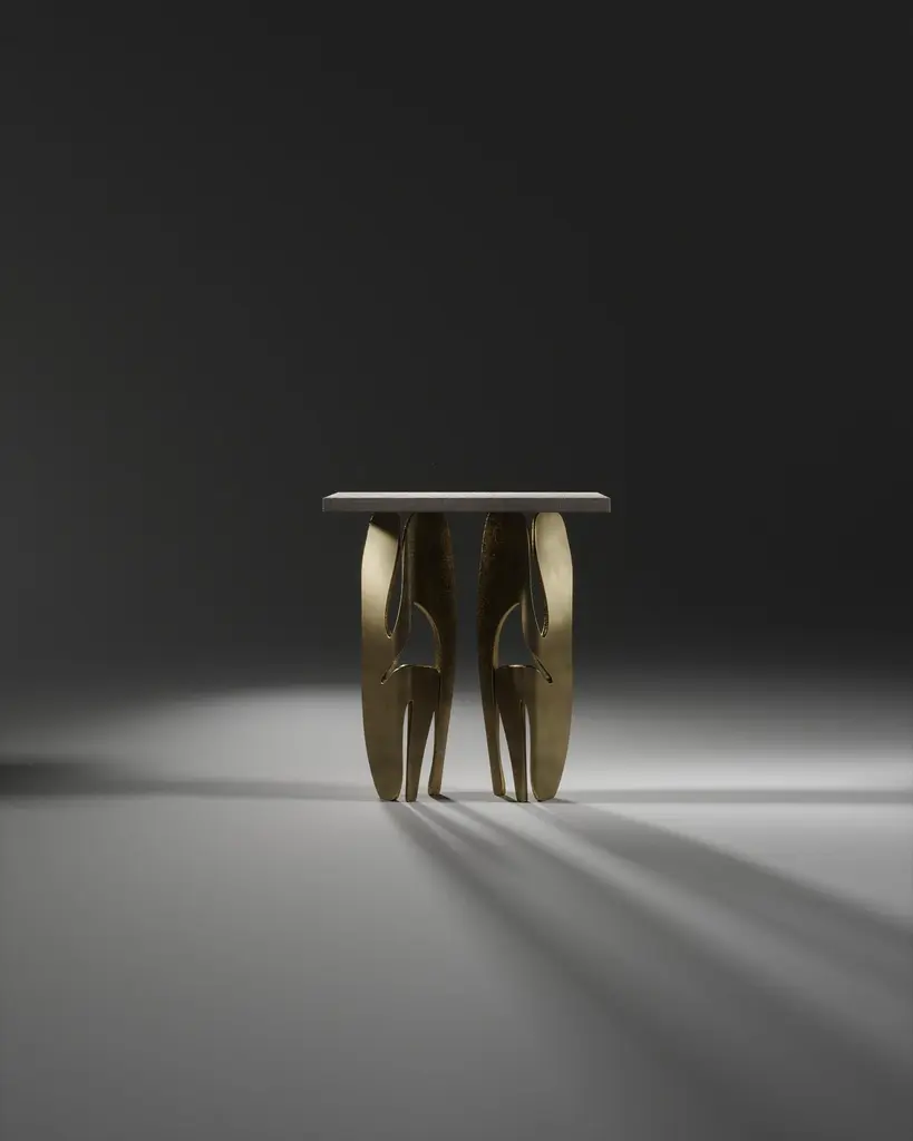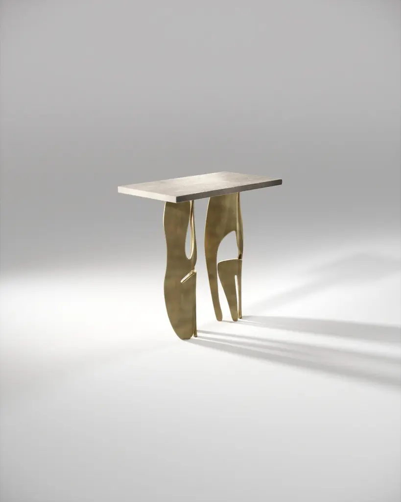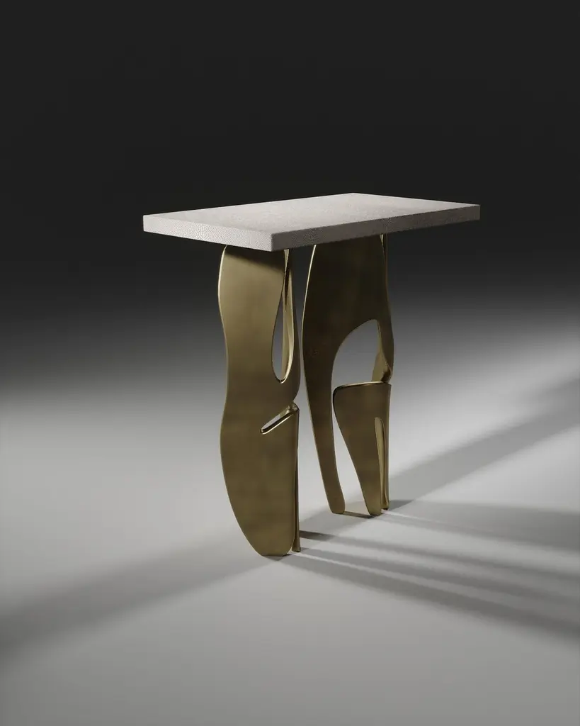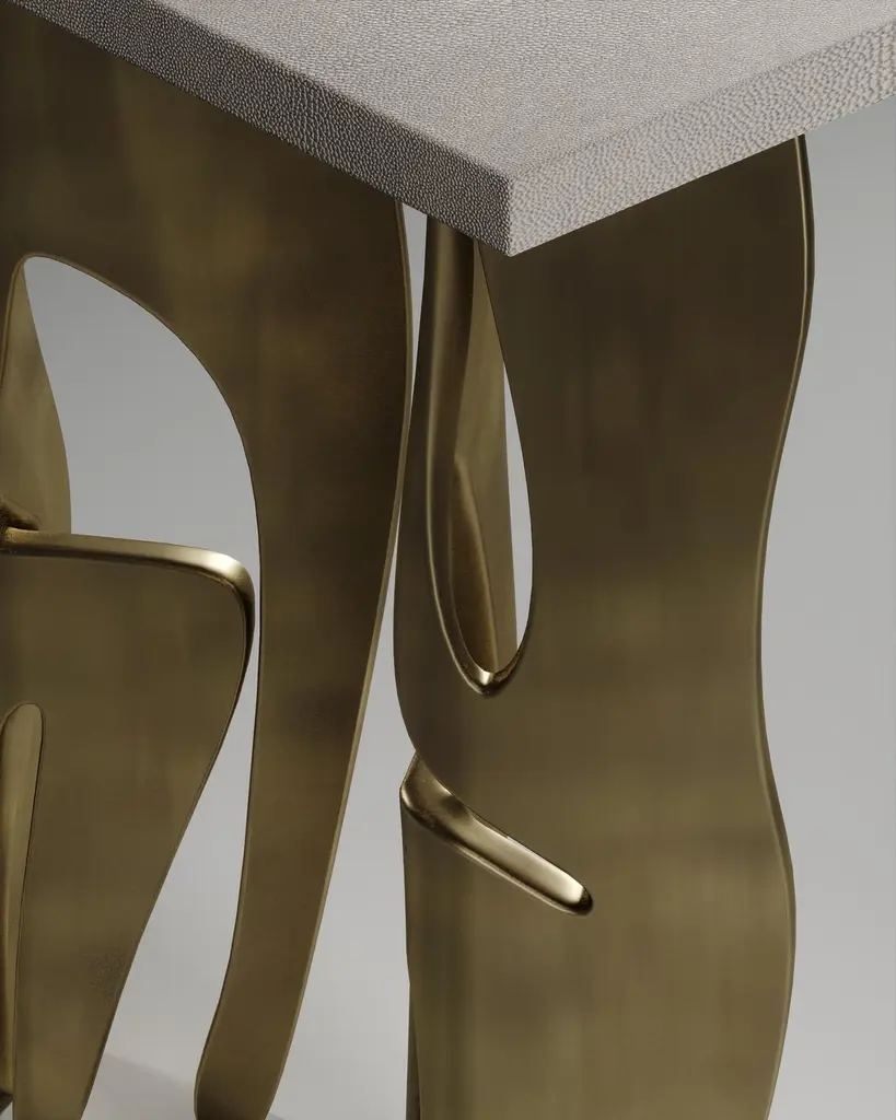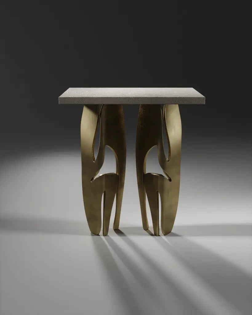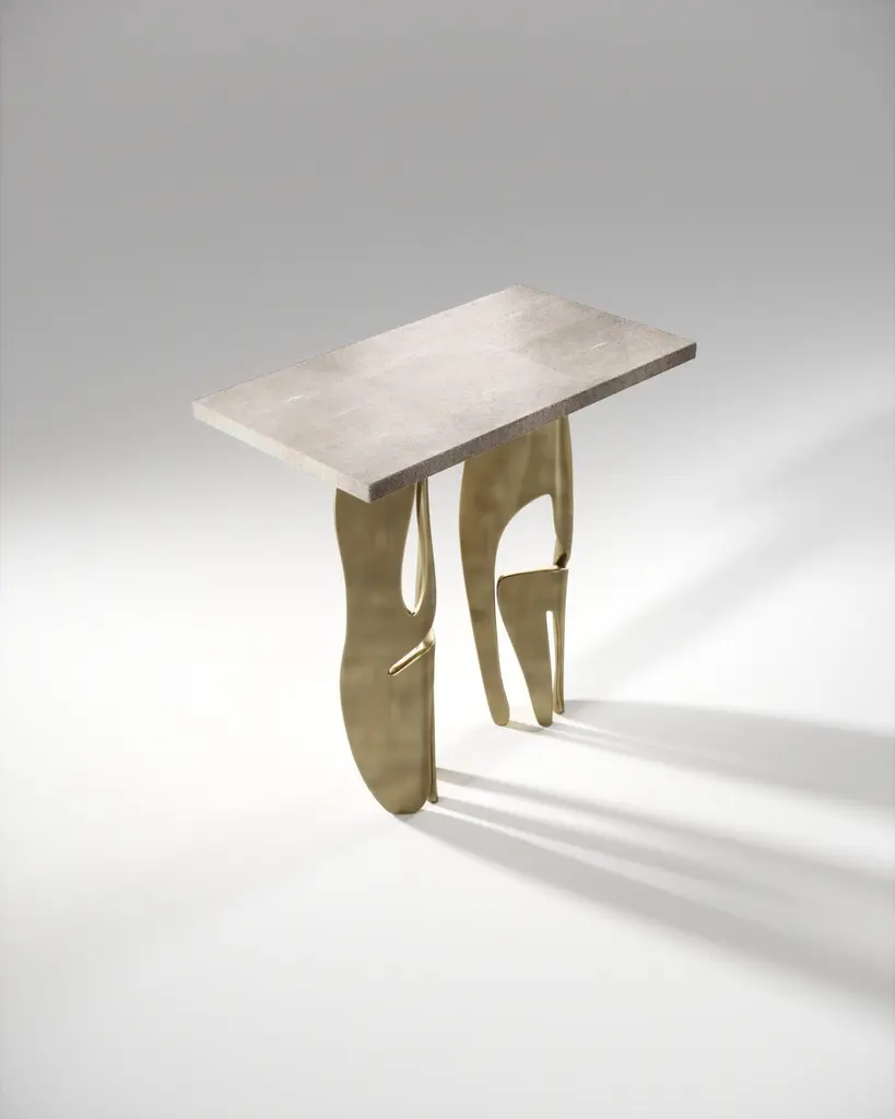 The Paris based label has distinguished themselves since their launch, with their iconic use of shagreen mixed with brass and other exotic materials. All furniture is handcrafted by skilled artisans, ultimately making each piece unique, designed in Paris and produced in the Philippines.The metropolis rectangle side table by R&Y Augousti is both dramatic and organic it’s unique design. The cream shagreen inlaid top sits on a pair of ethereal and sculptural bronze-patina brass legs. This piece makes for the perfect end table and is originally inspired by the metropolis console, see image at end of slide. The dimensions of this piece are 60 x 35 x 65 cmThe shagreen is hand-dyed by artisans and the designer calls this finish 'antique natural' shagreen.All R&Y Augousti pieces are handmade by artisans, ultimately making each piece unique. Custom color/sizing available on request. Wipe clean with soft dry cloth.Acclaimed design duo Ria & Yiouri Augousti have established themselves since the 1990s as pioneers of modern-vintage style through their luxurious Art Deco inspired collections.The Paris based label has distinguished themselves since their launch, with their iconic use of shagreen mixed with brass and other exotic materials. All furniture is handcrafted by skilled artisans, ultimately making each piece unique.All shagreen-covered items should be kept out of direct sunlight, color variants may occur on the stingray and other exotic finishes, but this showcases the Parisian label's commitment to creating authentic luxurious products using natural components.