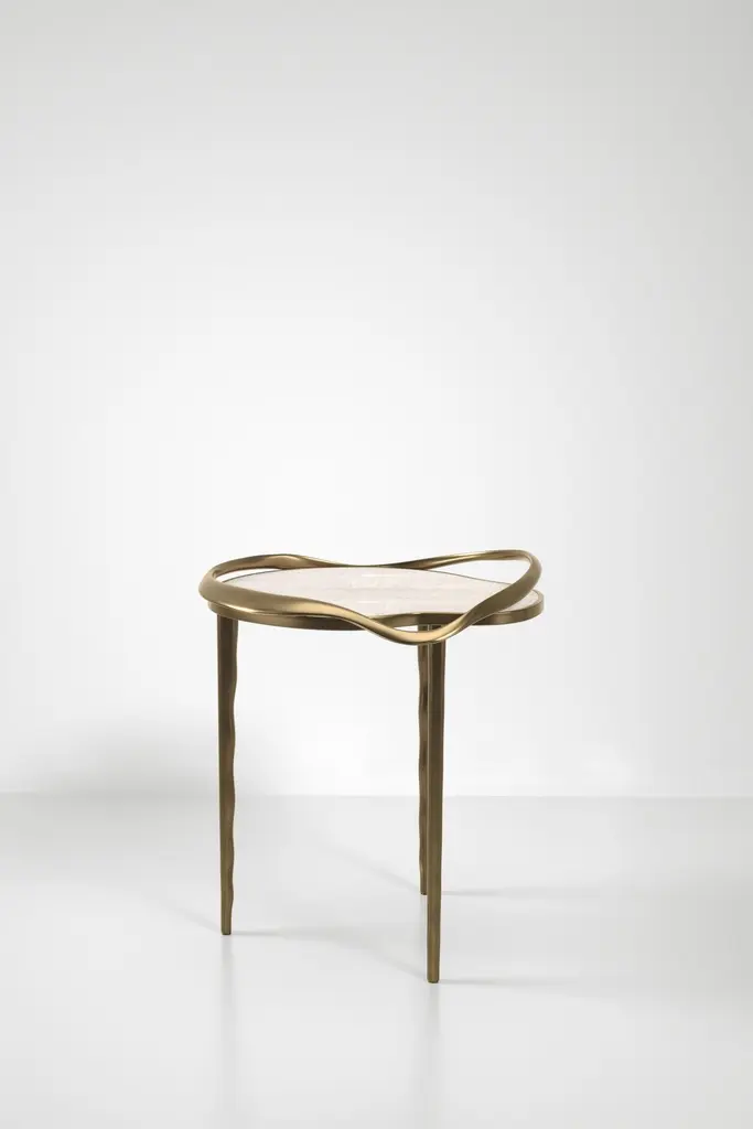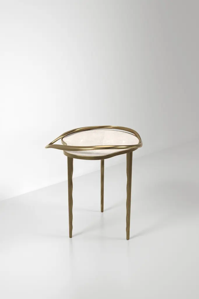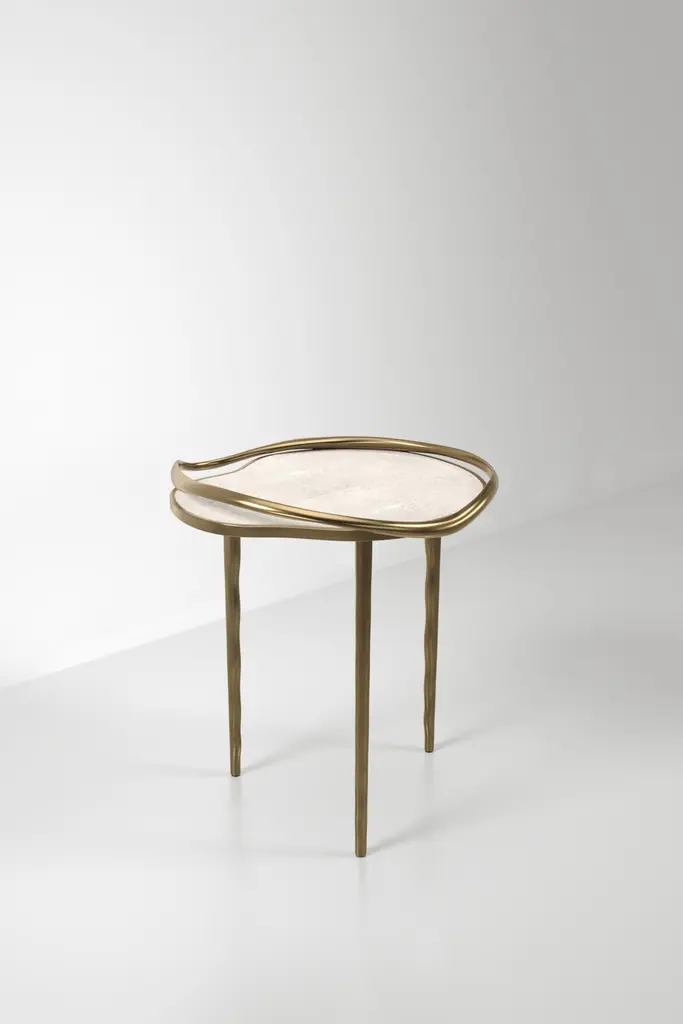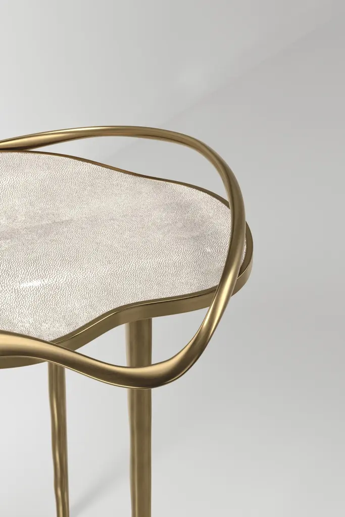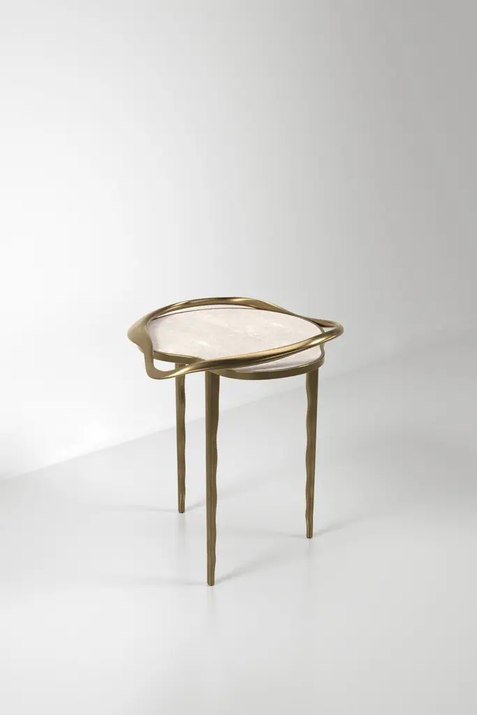The Paris based label has distinguished themselves since their launch, with their iconic use of shagreen mixed with brass and other exotic materials. All furniture is handcrafted by skilled artisans, ultimately making each piece unique, designed in Paris and produced in the Philippines.The Ripple side table by KIFU PARIS is a refined piece, balancing elegance and luxurious craftmanship. The black shagreen inlaid amorphous top is nestled within an organic shaped bronze-patina brass frame, and sits on top of three melting legs; a signature design detail of the Augousti brand. Available in other finishes see images at end of slide, custom finishing and sizing available on request.The finish of the shagreen is authentic as it is hand-dyed and the designer calls the finish look: "coal black shagreen."The dimensions of this piece are 54 x 58 x 65 cmAll KIFU PARIS pieces are handmade by artisans, ultimately making each piece unique.Custom color/sizing available on request.Wipe clean with soft dry cloth.The Paris based label has distinguished themselves since their launch, with their iconic use of shagreen mixed with brass and other exotic materials. All furniture is handcrafted by skilled artisans, ultimately making each piece unique. All shagreen-covered items should be kept out of direct sunlight, color variants may occur on the stingray and other exotic finishes, but this showcases the Parisian label's commitment to creating authentic luxurious products using natural components.