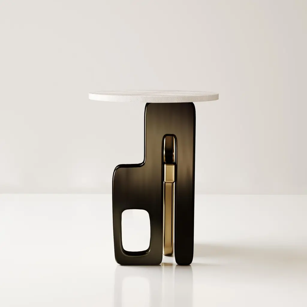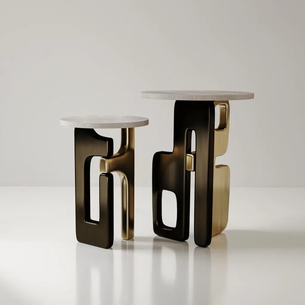 The Paris based label has distinguished themselves since their launch, with their iconic use of shagreen mixed with brass and other exotic materials. All furniture is handcrafted by skilled artisans, ultimately making each piece unique, designed in Paris and produced in the Philippines.The Apoli sidee table by Kifu Paris is both dramatic and organic it’s unique design. The cream shagreen inlaid top sits on an ethereal geometric and sculptural bronze-patina brass base. This piece is designed by Kifu Augousti the daughter of Ria and Yiouri Augousti. Part of the Apoli Capsule Series, see images of collection at end of slide.The finish of the shagreen is authentic as it is hand-dyed and the designer calls the finish look: "antique natural shagreen."The dimensions of this piece are 35 dia x 50 cmAll Kifu Paris pieces are handmade by artisans, ultimately making each piece unique.Custom color/sizing available on request.Wipe clean with soft dry cloth.Although inspired by her parents, her collection of Home Accessories and Furniture is a distinct identity of its own. Kifu uses handmade techniques of elaborate inlay patterns of shagreen, shells, semi-precious stones, materials she experienced as a child growing up in her parent’s studio, but interpreted in a younger quirkier way reflecting her youth. From her "jewelry inspired knobs" on decorative boxes, gold bar boxes and an extravagant inlay pattern mix of shagreen and shell inspired by galactic constellations, as seen on her enormous round mirror, is refreshing to see. Kifu embodies whimsical elements throughout her collection and is not afraid to be daring and unexpected in her approach to design.All shagreen-covered items should be kept out of direct sunlight, color variants may occur on the stingray and other exotic finishes, but this showcases the Parisian label's commitment to creating authentic luxurious products using natural components.