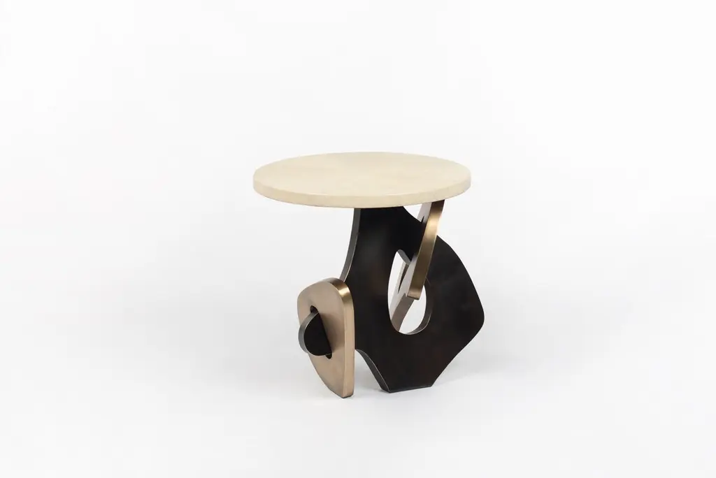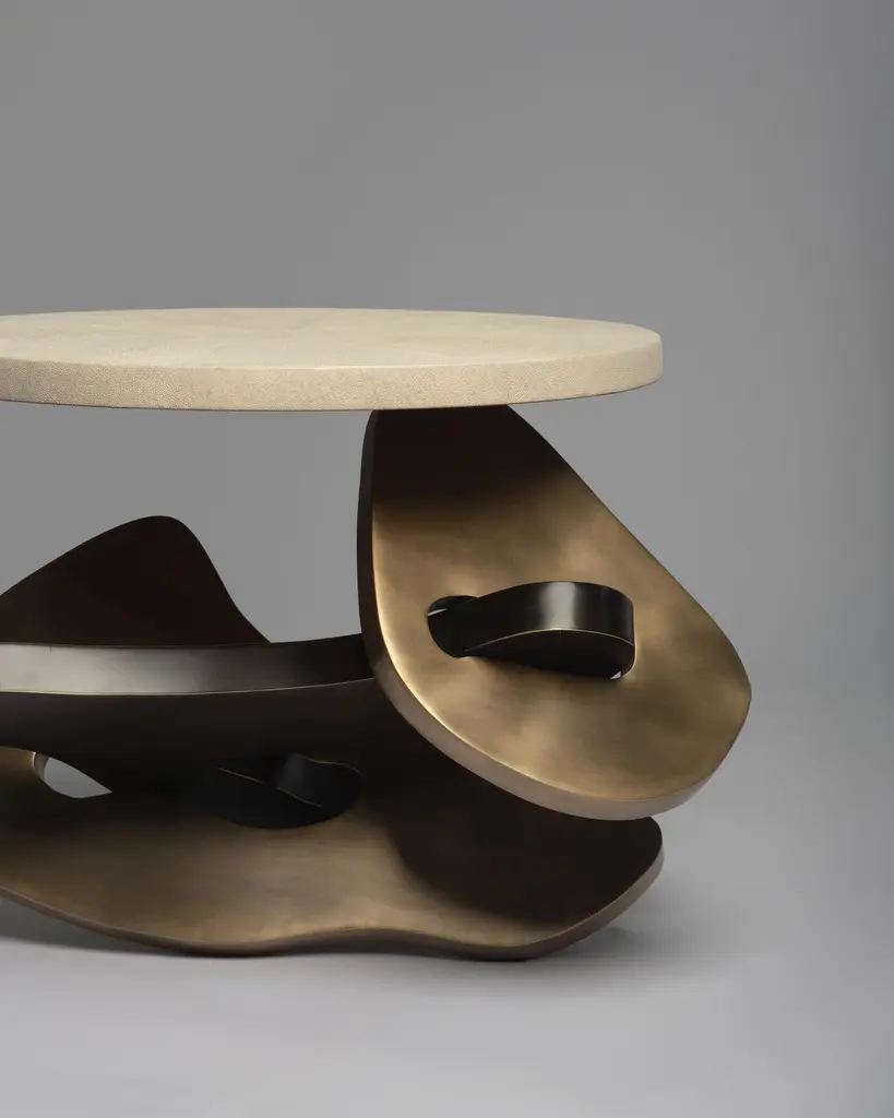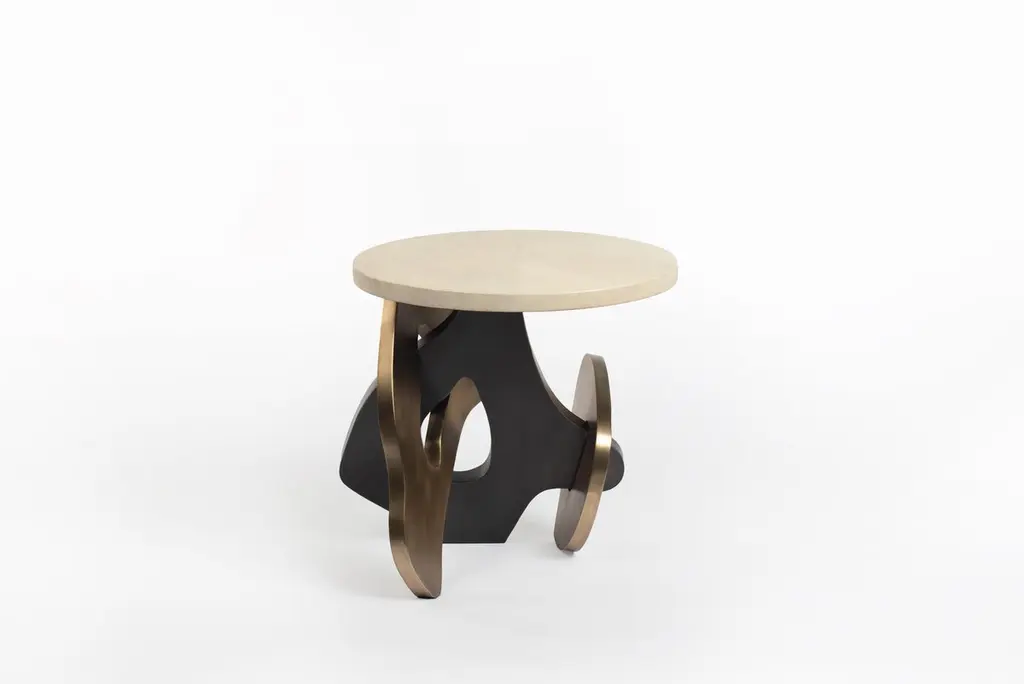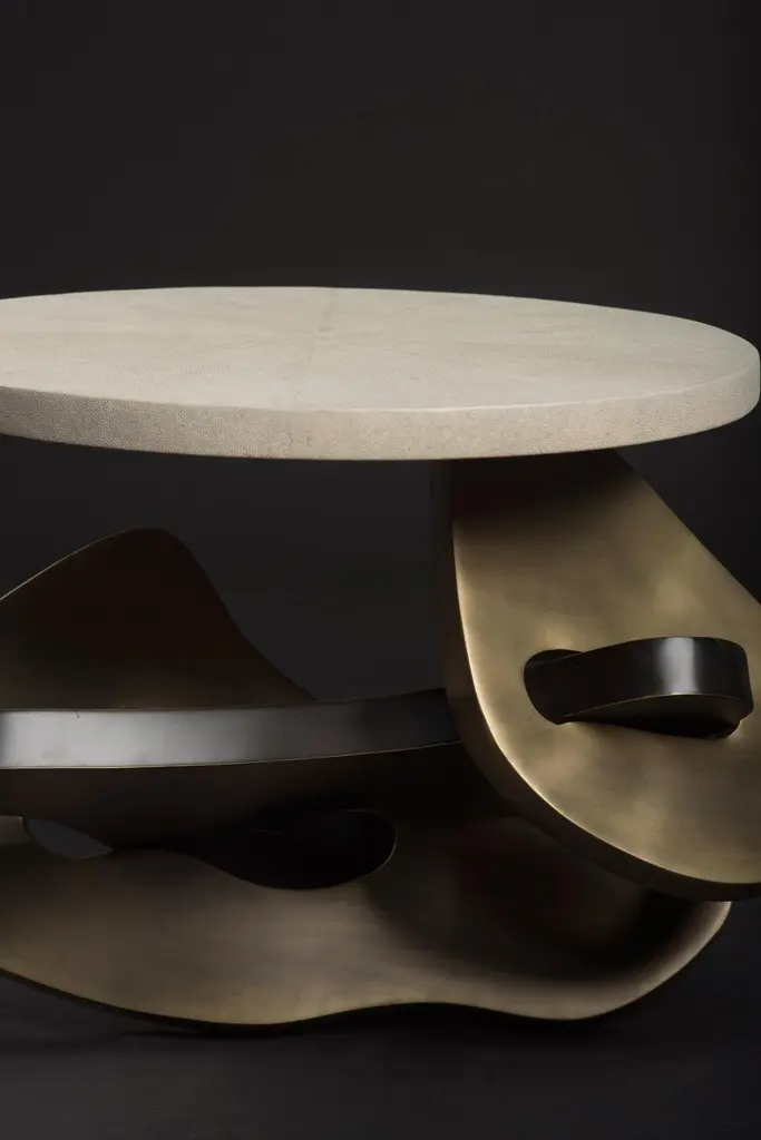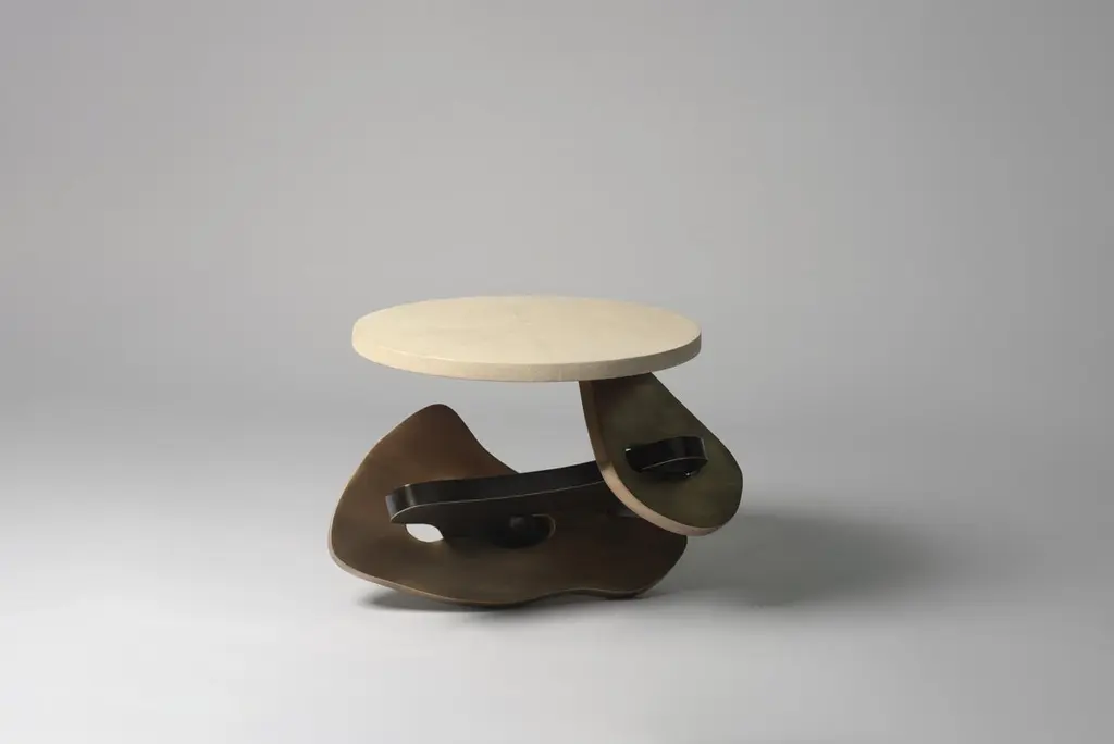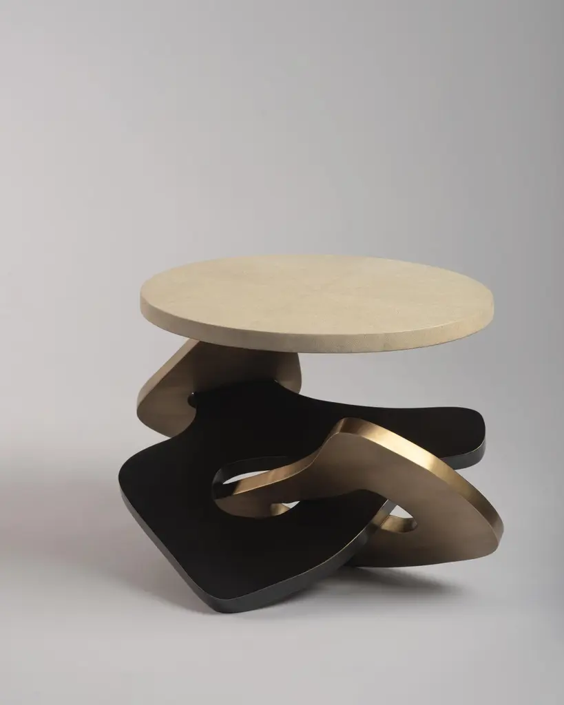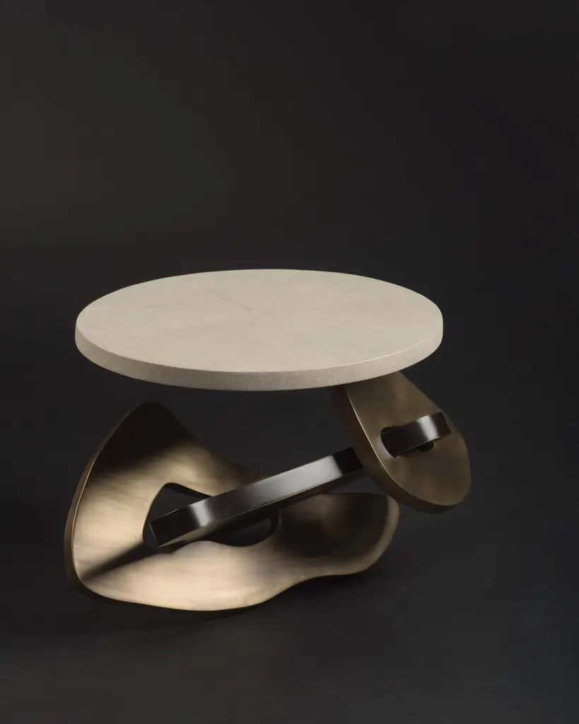 The Paris based label has distinguished themselves since their launch, with their iconic use of shagreen mixed with brass and other exotic materials. All furniture is handcrafted by skilled artisans, ultimately making each piece unique, designed in Paris and created in the Philippines.The Apoli II Side Table by Kifu Paris is an extension of the original Apoli collection. The cream shagreen inlaid top sits on an ethereal geometric and sculptural two tone bronze-patina brass base, each part interlocking with one another in a unique way. This piece is designed by Kifu Augousti the daughter of Ria and Yiouri Augousti. The finish of the shagreen is authentic as it is hand-dyed and the designer calls the finish look: "antique natural shagreen."The dimensions of this piece are 60 x 55 x 60 cmAll Kifu Paris pieces are handmade by artisans, ultimately making each piece unique.Custom color/sizing available on request.Wipe clean with soft dry cloth.Although inspired by her parents, her collection of Home Accessories and Furniture is a distinct identity of its own. Kifu uses handmade techniques of elaborate inlay patterns of shagreen, shells, semi-precious stones, materials she experienced as a child growing up in her parent’s studio, but interpreted in a younger quirkier way reflecting her youth. From her "jewelry inspired knobs" on decorative boxes, gold bar boxes and an extravagant inlay pattern mix of shagreen and shell inspired by galactic constellations, as seen on her enormous round mirror, is refreshing to see. Kifu embodies whimsical elements throughout her collection and is not afraid to be daring and unexpected in her approach to design.All shagreen-covered items should be kept out of direct sunlight, color variants may occur on the stingray and other exotic finishes, but this showcases the Parisian label's commitment to creating authentic luxurious products using natural components.