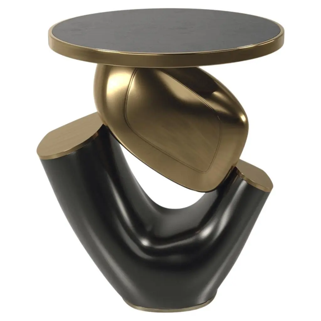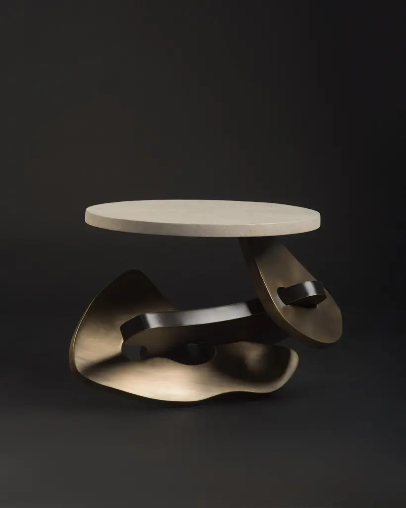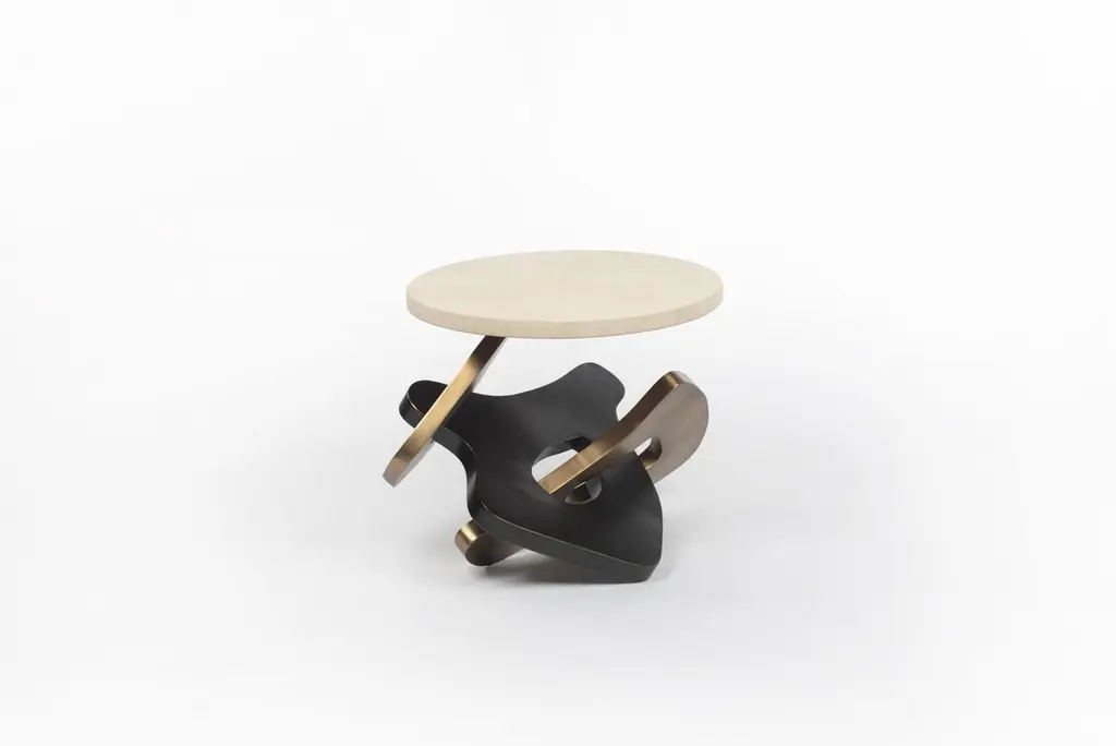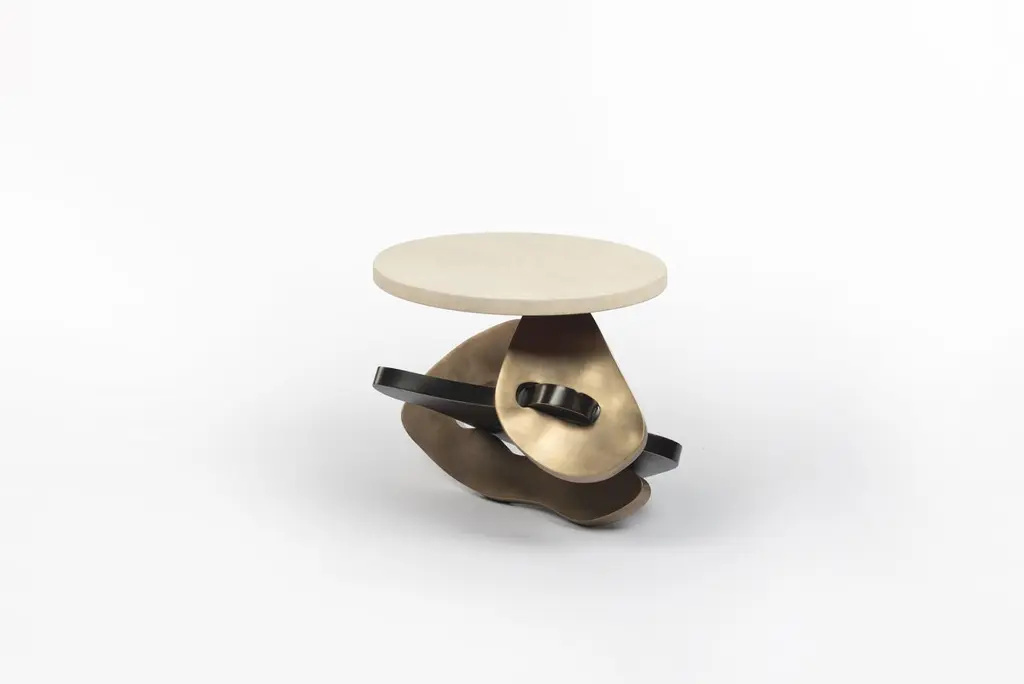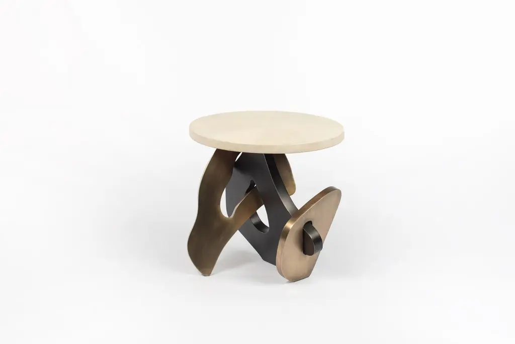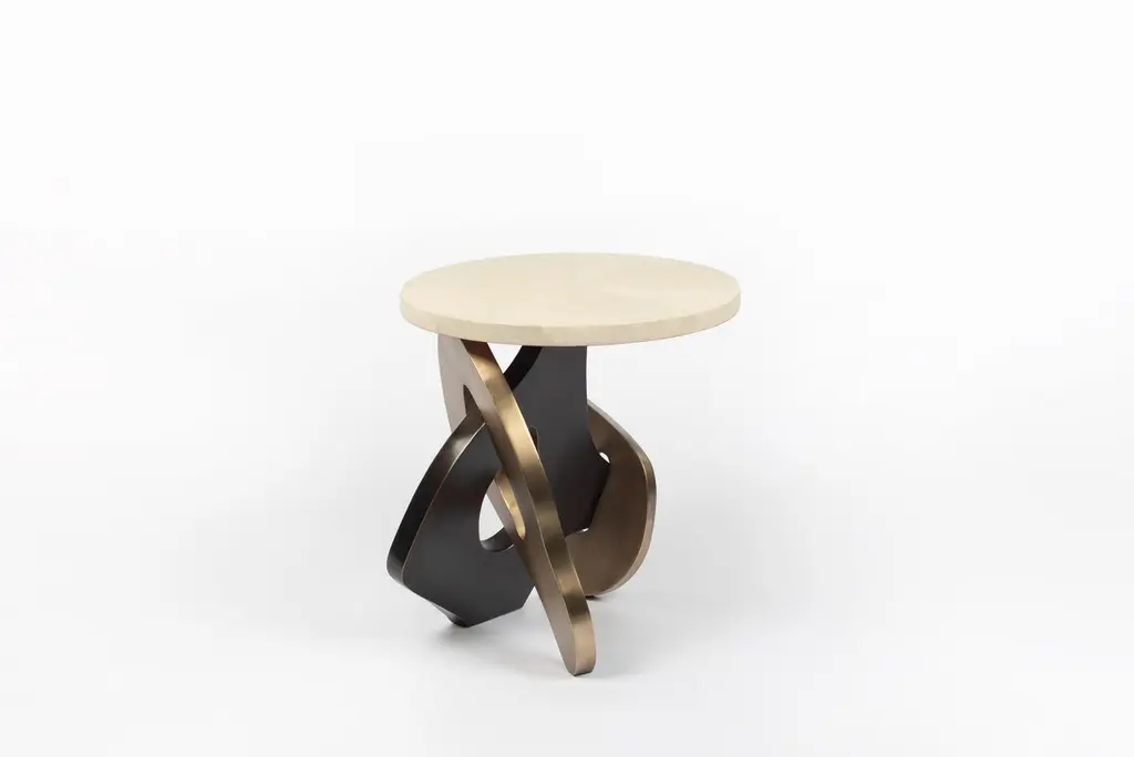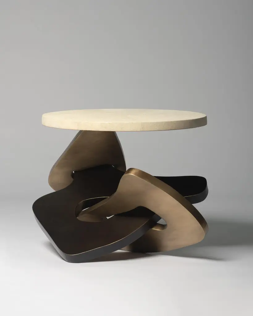 The Paris based label has distinguished themselves since their launch, with their iconic use of shagreen mixed with brass and other exotic materials. All furniture is handcrafted by skilled artisans, ultimately making each piece unique, designed in Paris and created in the Philippines.The Apoli II Side Table by Kifu Paris is an extension of the original Apoli collection. The cream shagreen inlaid top sits on an ethereal geometric and sculptural two tone bronze-patina brass base, each part interlocking with one another in a unique way. This piece is designed by Kifu Augousti the daughter of Ria and Yiouri Augousti. The finish of the shagreen is authentic as it is hand-dyed and the designer calls the finish look: "antique natural shagreen."The dimensions of this piece are 60 x 55 x 60 cmAll Kifu Paris pieces are handmade by artisans, ultimately making each piece unique.Custom color/sizing available on request.Wipe clean with soft dry cloth.Although inspired by her parents, her collection of Home Accessories and Furniture is a distinct identity of its own. Kifu uses handmade techniques of elaborate inlay patterns of shagreen, shells, semi-precious stones, materials she experienced as a child growing up in her parent’s studio, but interpreted in a younger quirkier way reflecting her youth. From her "jewelry inspired knobs" on decorative boxes, gold bar boxes and an extravagant inlay pattern mix of shagreen and shell inspired by galactic constellations, as seen on her enormous round mirror, is refreshing to see. Kifu embodies whimsical elements throughout her collection and is not afraid to be daring and unexpected in her approach to design.All shagreen-covered items should be kept out of direct sunlight, color variants may occur on the stingray and other exotic finishes, but this showcases the Parisian label's commitment to creating authentic luxurious products using natural components.