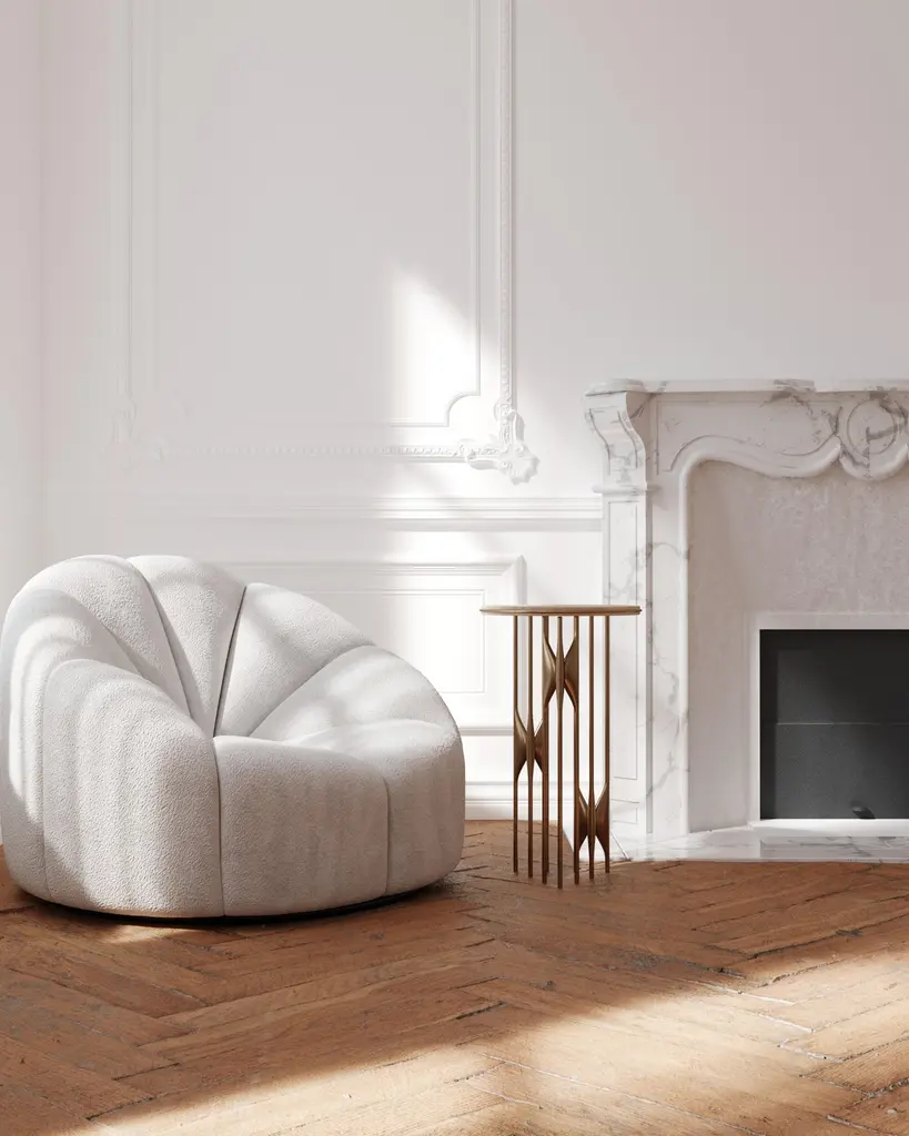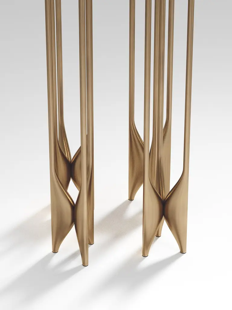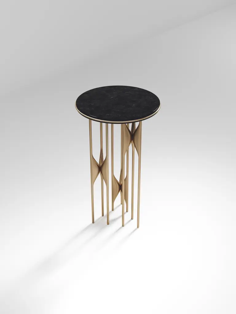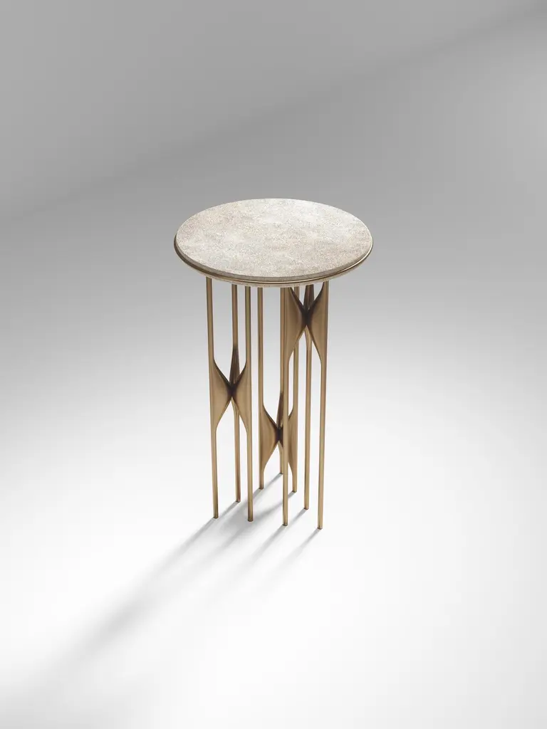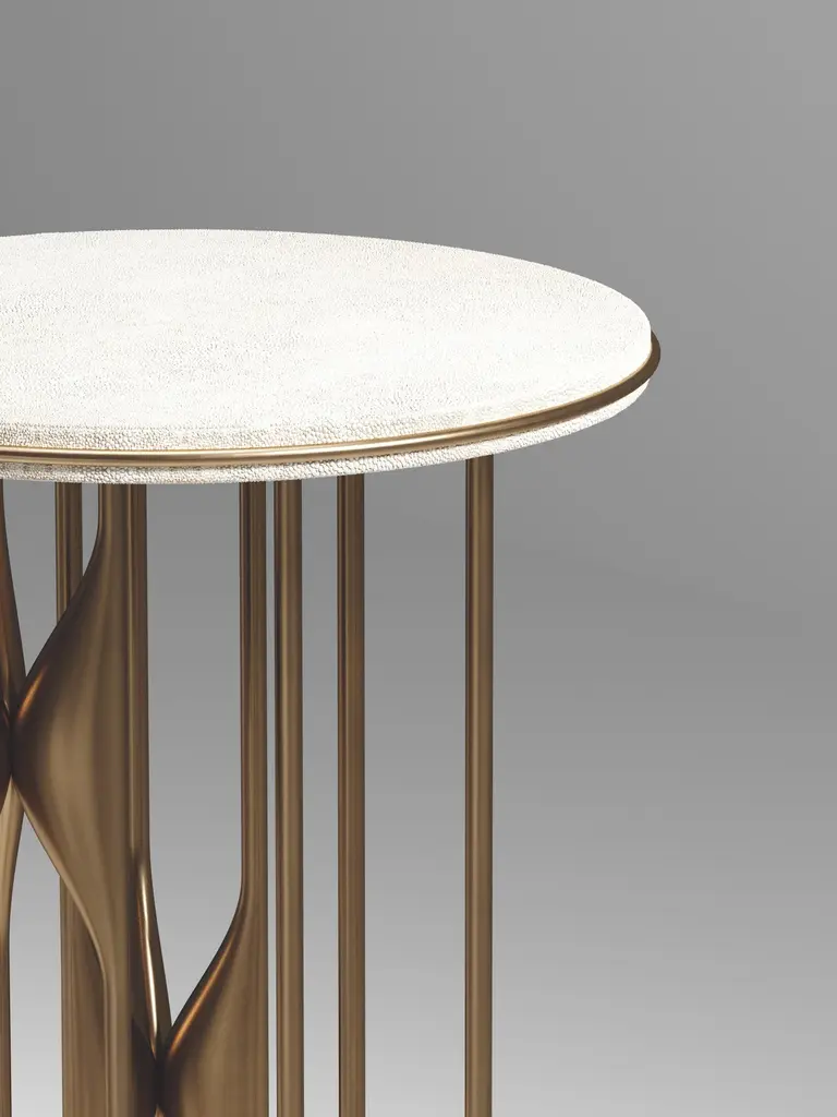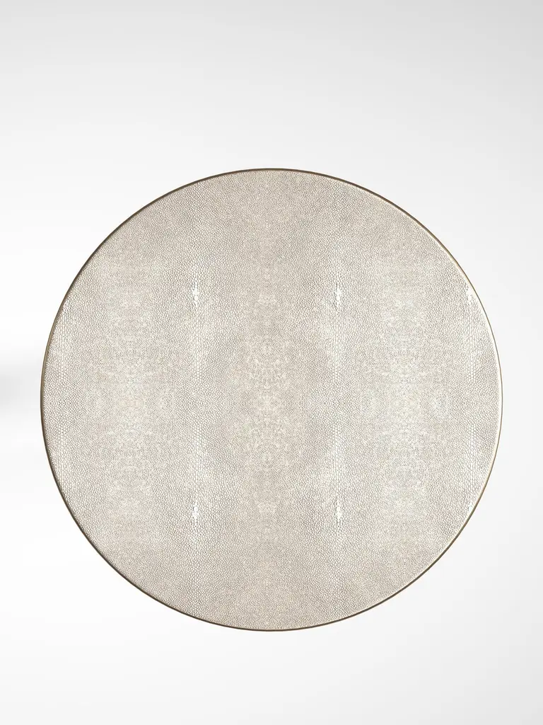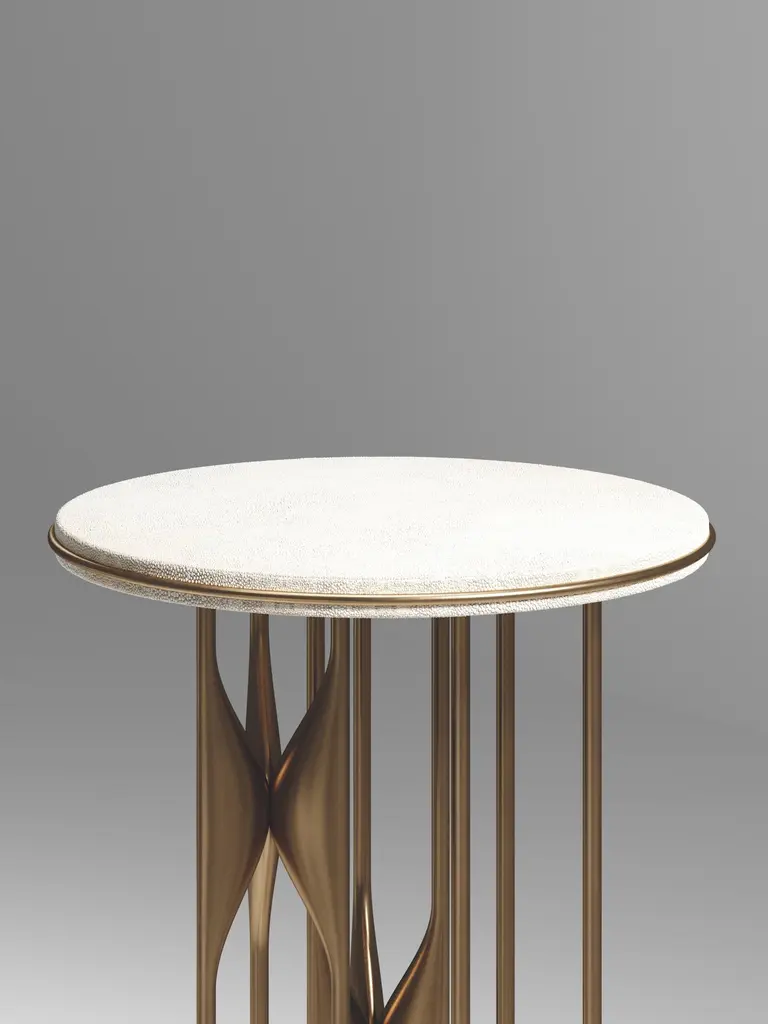 The Paris based label has distinguished themselves since their launch, with their iconic use of shagreen mixed with brass and other exotic materials. All furniture is handcrafted by skilled artisans, ultimately making each piece unique, designed in Paris and produced in the Philippines.The Plumeria side tables by Kifu Paris is dramatic and sculptural piece. The cream shagreen inlaid top sits on clusters of bronze-patina brass legs that are conceptually inspired by bird feathers floating on top of a lake. The border of the top is accentuated by a subtle and elegant bronze-patina brass indentation detail. Pair this piece with the medium size and they become a stunning nesting set. This piece is designed by Kifu Augousti the daughter of Ria and Yiouri Augousti. Available in other finishes. Can be purchased as a set of nesting tables, see other listings. Part of the Plumeria Capsule, see images of the collection at end of the slide.The finish of the shagreen is authentic as it is hand-dyed and the designer calls the finish look: "antique natural shagreen" and "coal black shagreen".The dimensions of this piece are 35 diameter x 60 cmAll Kifu Paris pieces are handmade by artisans, ultimately making each piece unique.Custom color/sizing available on request.Wipe clean with soft dry cloth.Although inspired by her parents, her collection of Home Accessories and Furniture is a distinct identity of its own. Kifu uses handmade techniques of elaborate inlay patterns of shagreen, shells, semi-precious stones, materials she experienced as a child growing up in her parent’s studio, but interpreted in a younger quirkier way reflecting her youth. From her "jewelry inspired knobs" on decorative boxes, gold bar boxes and an extravagant inlay pattern mix of shagreen and shell inspired by galactic constellations, as seen on her enormous round mirror, is refreshing to see. Kifu embodies whimsical elements throughout her collection and is not afraid to be daring and unexpected in her approach to design.All shagreen-covered items should be kept out of direct sunlight, color variants may occur on the stingray and other exotic finishes, but this showcases the Parisian label's commitment to creating authentic luxurious products using natural components.