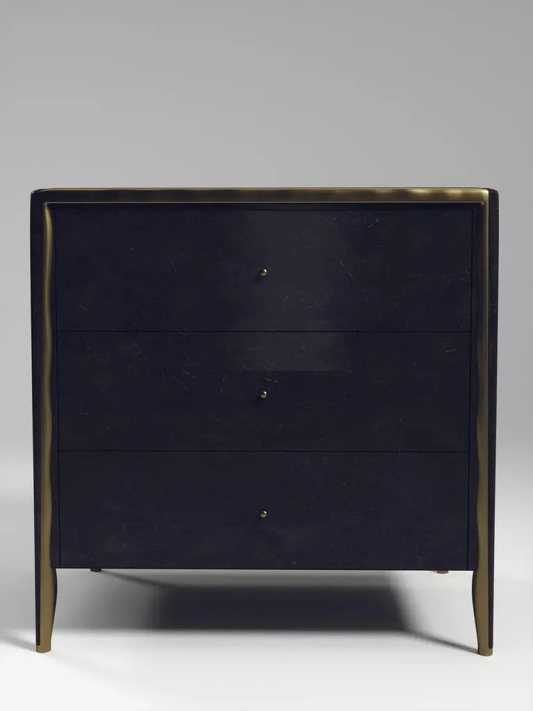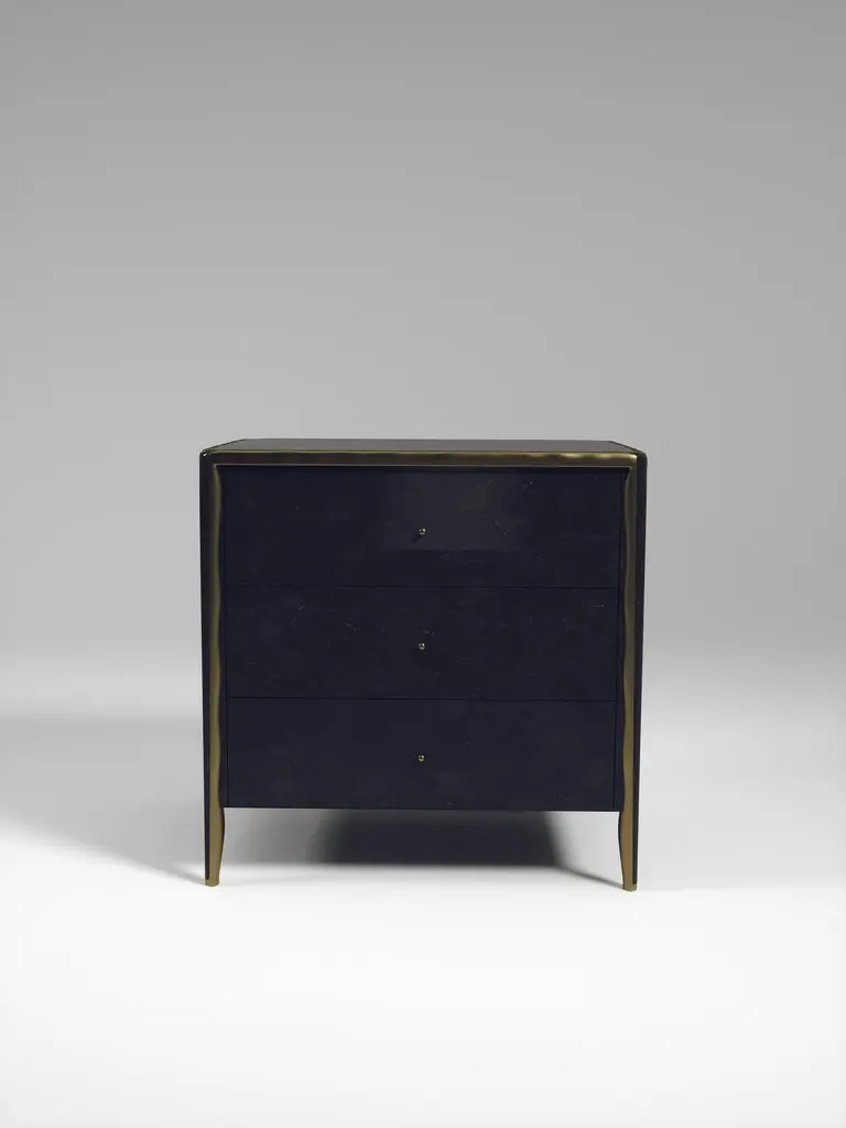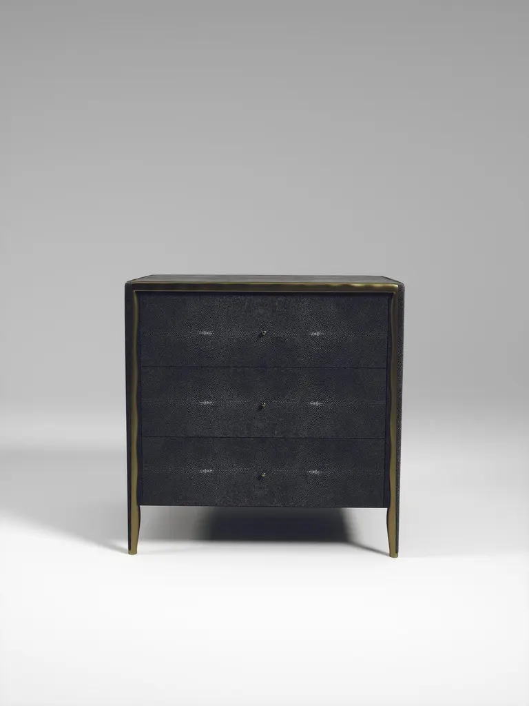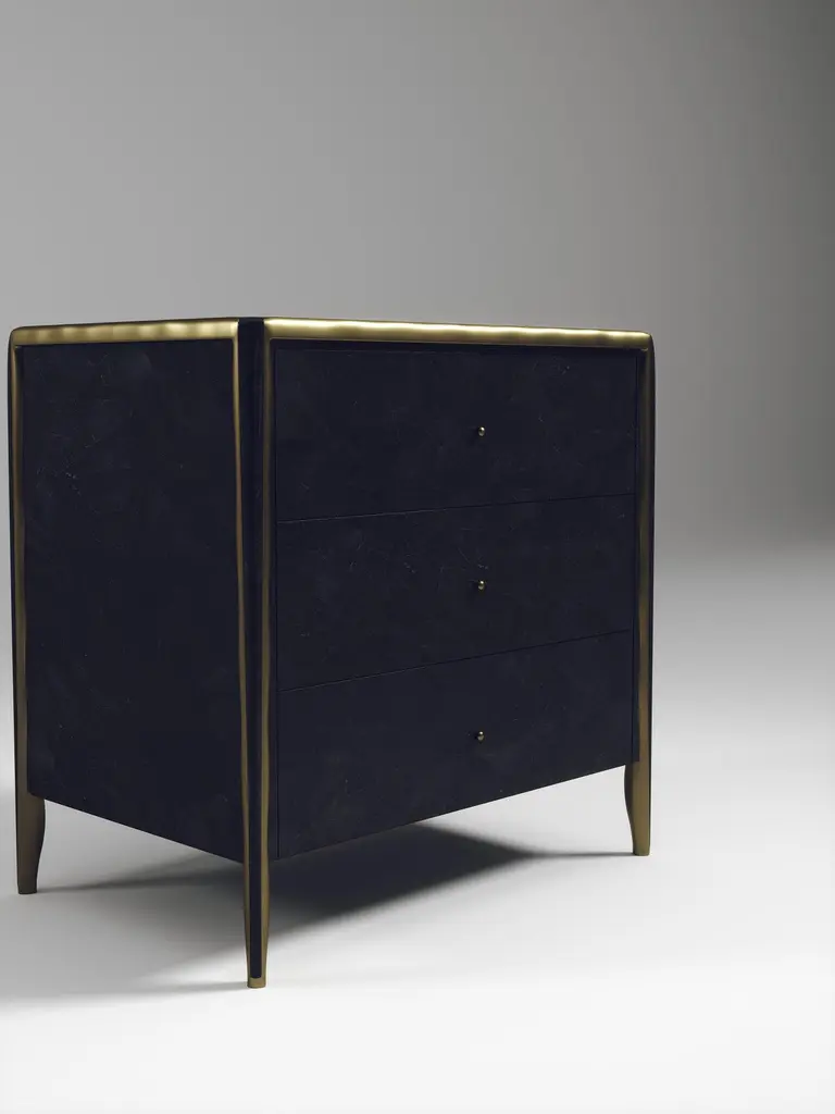 The Paris based label has distinguished themselves since their launch, with their iconic use of shagreen mixed with brass and other exotic materials. All furniture is handcrafted by skilled artisans, ultimately making each piece unique, designed in Paris and produced in the Philippines.The Melting Rectangle Bedside Table by R&Y Augousti is an elegant piece for any space. The black shagreen inlaid piece is classic, but accentuated by their signature organic melting bronze-patina brass frame. This side table includes 3 drawers. This piece is part of the Melting Capsule, see images at end of slide of the collection. Available in other finishes, see images at end of slide. Custom sizing / finishing available in requestMeasures: 60 x 40 x 60 cm All R & Y Augousti pieces are handmade by artisans, ultimately making each piece unique. Custom color/sizing available on request. Wipe clean with soft dry cloth.Acclaimed design duo Ria & Yiouri Augousti have established themselves since the 1990s as pioneers of modern-vintage style through their luxurious Art Deco inspired collections.The Paris based label has distinguished themselves since their launch, with their iconic use of shagreen mixed with brass and other exotic materials. All furniture is handcrafted by skilled artisans, ultimately making each piece unique. All shagreen-covered items should be kept out of direct sunlight, color variants may occur on the stingray and other exotic finishes, but this showcases the Parisian label's commitment to creating authentic luxurious products using natural components.