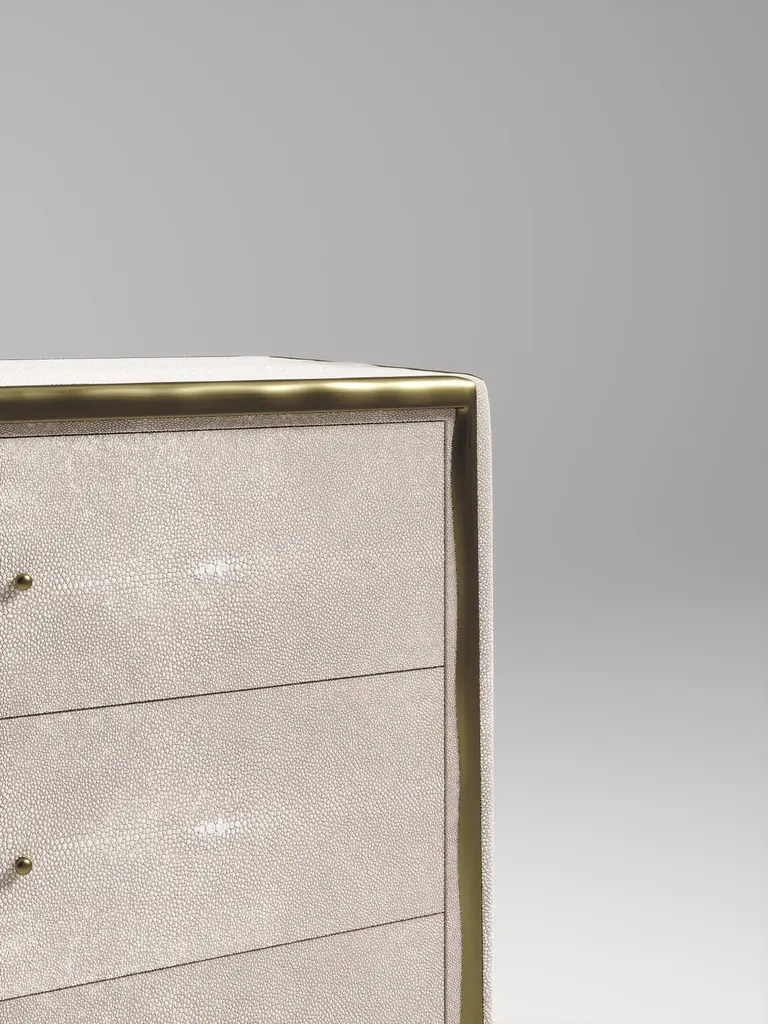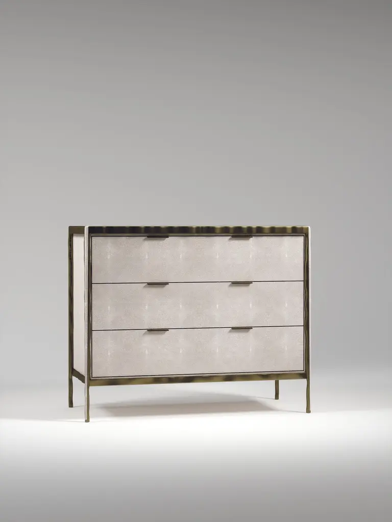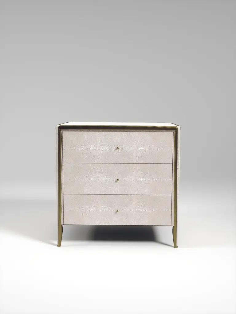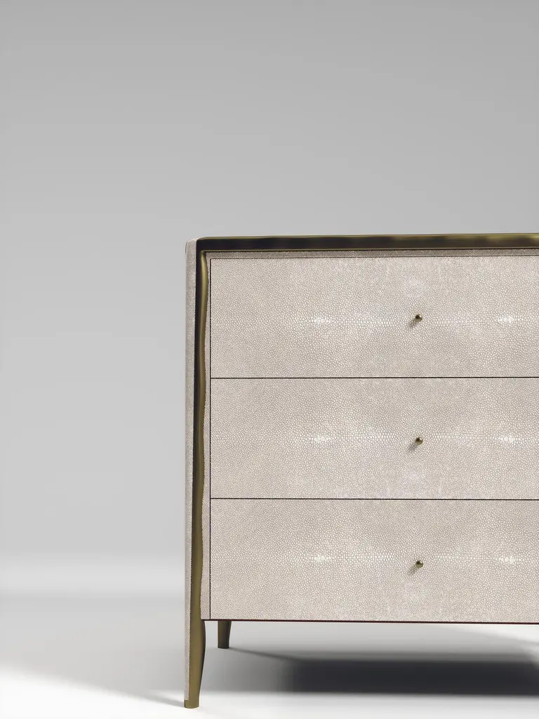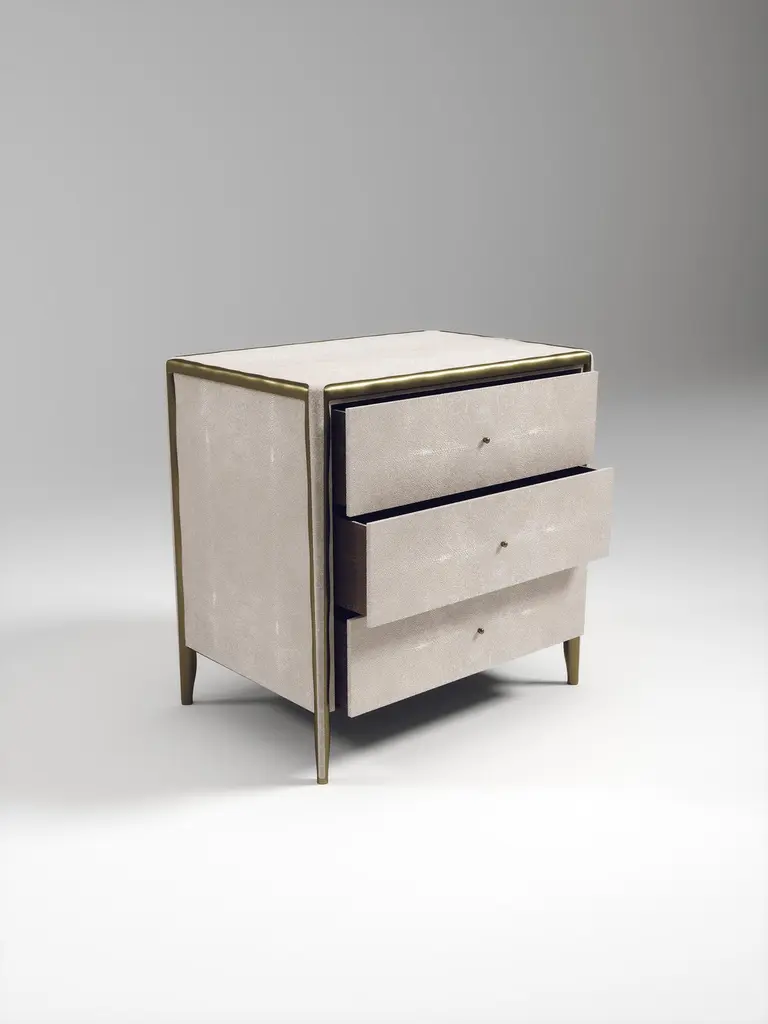 The Paris based label has distinguished themselves since their launch, with their iconic use of shagreen mixed with brass and other exotic materials. All furniture is handcrafted by skilled artisans, ultimately making each piece unique, designed in Paris and produced in the Philippines.The Melting Rectangle Bedside Table by R&Y Augousti is an elegant piece for any space. The black shagreen inlaid piece is classic, but accentuated by their signature organic melting bronze-patina brass frame. This side table includes 3 drawers. This piece is part of the Melting Capsule, see images at end of slide of the collection. Available in other finishes, see images at end of slide. Custom sizing / finishing available in requestMeasures: 60 x 40 x 60 cm All R & Y Augousti pieces are handmade by artisans, ultimately making each piece unique. Custom color/sizing available on request. Wipe clean with soft dry cloth.Acclaimed design duo Ria & Yiouri Augousti have established themselves since the 1990s as pioneers of modern-vintage style through their luxurious Art Deco inspired collections.The Paris based label has distinguished themselves since their launch, with their iconic use of shagreen mixed with brass and other exotic materials. All furniture is handcrafted by skilled artisans, ultimately making each piece unique. All shagreen-covered items should be kept out of direct sunlight, color variants may occur on the stingray and other exotic finishes, but this showcases the Parisian label's commitment to creating authentic luxurious products using natural components.