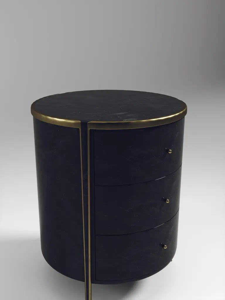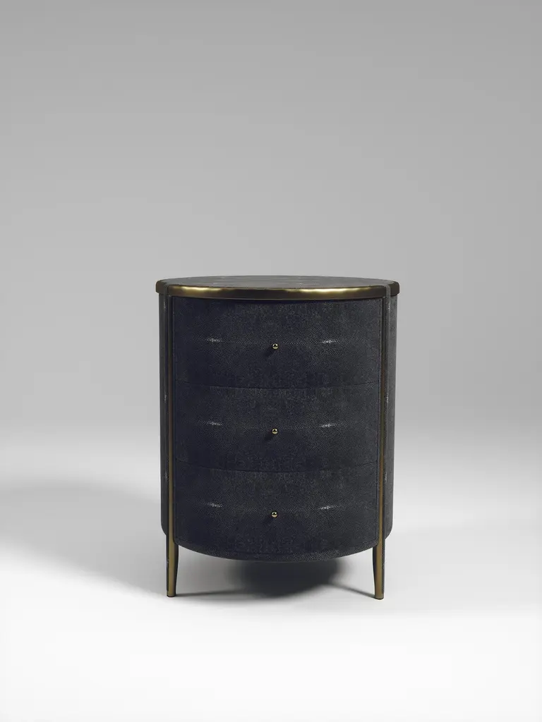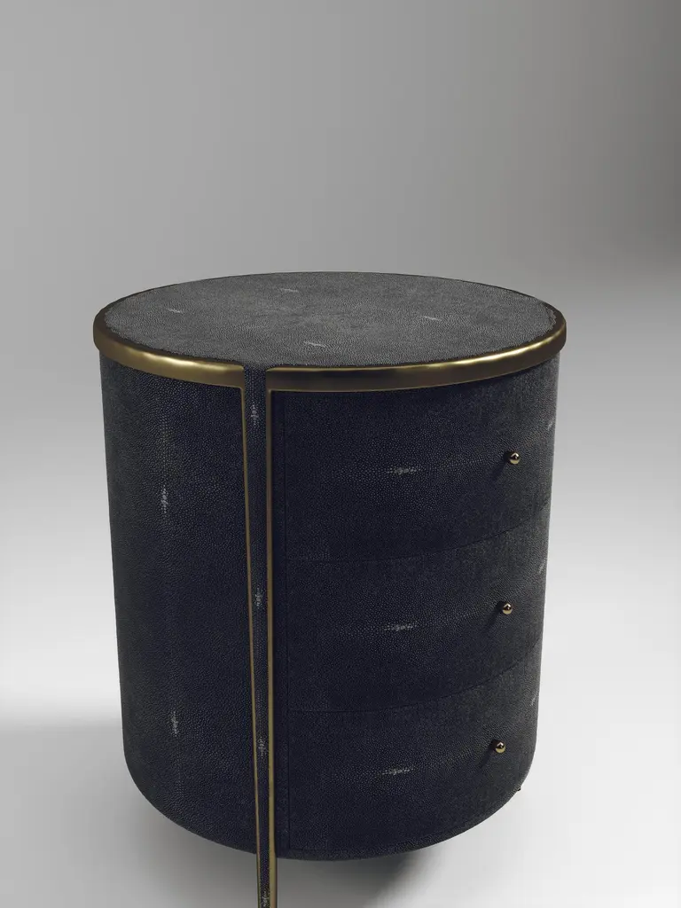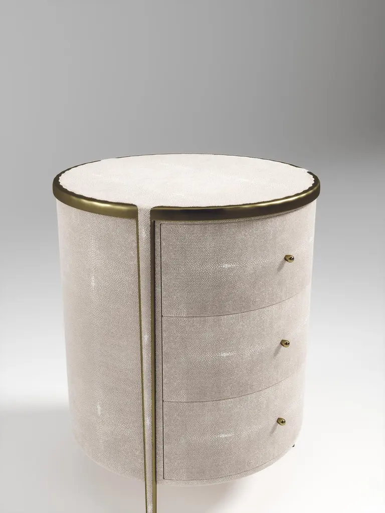 The Paris based label has distinguished themselves since their launch, with their iconic use of shagreen mixed with brass and other exotic materials. All furniture is handcrafted by skilled artisans, ultimately making each piece unique, designed in Paris and produced in the Philippines.The Melting Round Bedside Table by R&Y Augousti is an elegant piece for any space. The cream shagreen inlaid piece is classic, but accentuated by their signature organic melting bronze-patina brass frame. This side table includes 3 drawers. This piece is part of the Melting Capsule, see images at end of slide of the collection. Available in other finishes, see images at end of slide. Custom sizing / finishing available in requestMeasures: 50 dia x 60 cm All R & Y Augousti pieces are handmade by artisans, ultimately making each piece unique. Custom color/sizing available on request. Wipe clean with soft dry cloth.Acclaimed design duo Ria & Yiouri Augousti have established themselves since the 1990s as pioneers of modern-vintage style through their luxurious Art Deco inspired collections.The Paris based label has distinguished themselves since their launch, with their iconic use of shagreen mixed with brass and other exotic materials. All furniture is handcrafted by skilled artisans, ultimately making each piece unique. All shagreen-covered items should be kept out of direct sunlight, color variants may occur on the stingray and other exotic finishes, but this showcases the Parisian label's commitment to creating authentic luxurious products using natural components.