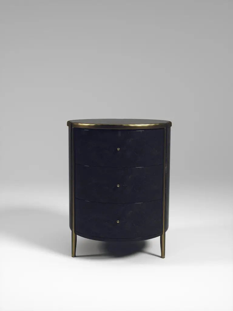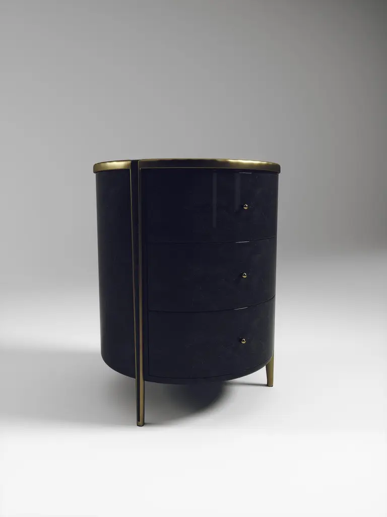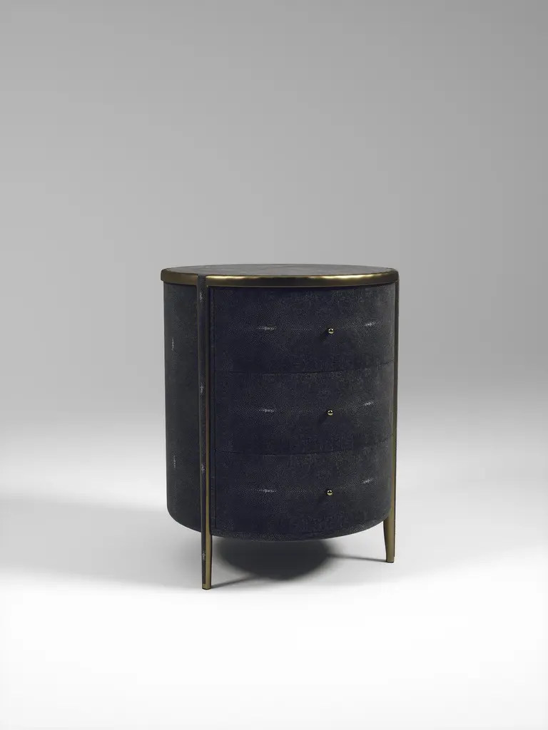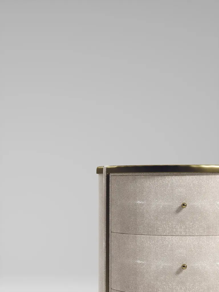 The Paris based label has distinguished themselves since their launch, with their iconic use of shagreen mixed with brass and other exotic materials. All furniture is handcrafted by skilled artisans, ultimately making each piece unique, designed in Paris and produced in the Philippines.The Melting Round Bedside Table by R&Y Augousti is an elegant piece for any space. The cream shagreen inlaid piece is classic, but accentuated by their signature organic melting bronze-patina brass frame. This side table includes 3 drawers. This piece is part of the Melting Capsule, see images at end of slide of the collection. Available in other finishes, see images at end of slide. Custom sizing / finishing available in requestMeasures: 50 dia x 60 cm All R & Y Augousti pieces are handmade by artisans, ultimately making each piece unique. Custom color/sizing available on request. Wipe clean with soft dry cloth.Acclaimed design duo Ria & Yiouri Augousti have established themselves since the 1990s as pioneers of modern-vintage style through their luxurious Art Deco inspired collections.The Paris based label has distinguished themselves since their launch, with their iconic use of shagreen mixed with brass and other exotic materials. All furniture is handcrafted by skilled artisans, ultimately making each piece unique. All shagreen-covered items should be kept out of direct sunlight, color variants may occur on the stingray and other exotic finishes, but this showcases the Parisian label's commitment to creating authentic luxurious products using natural components.