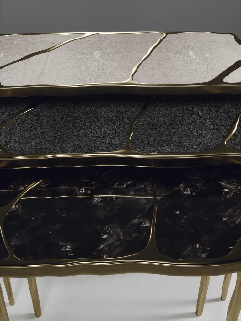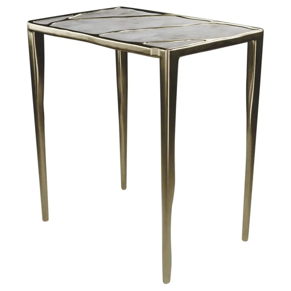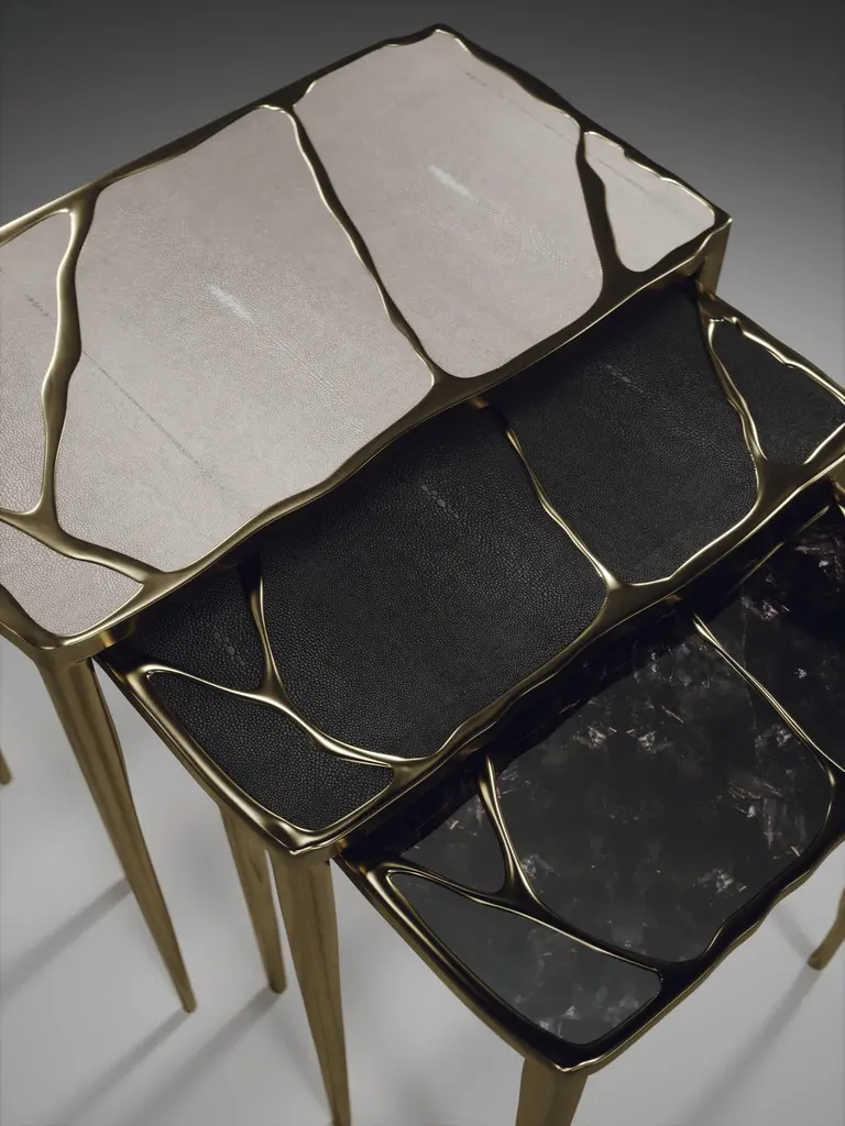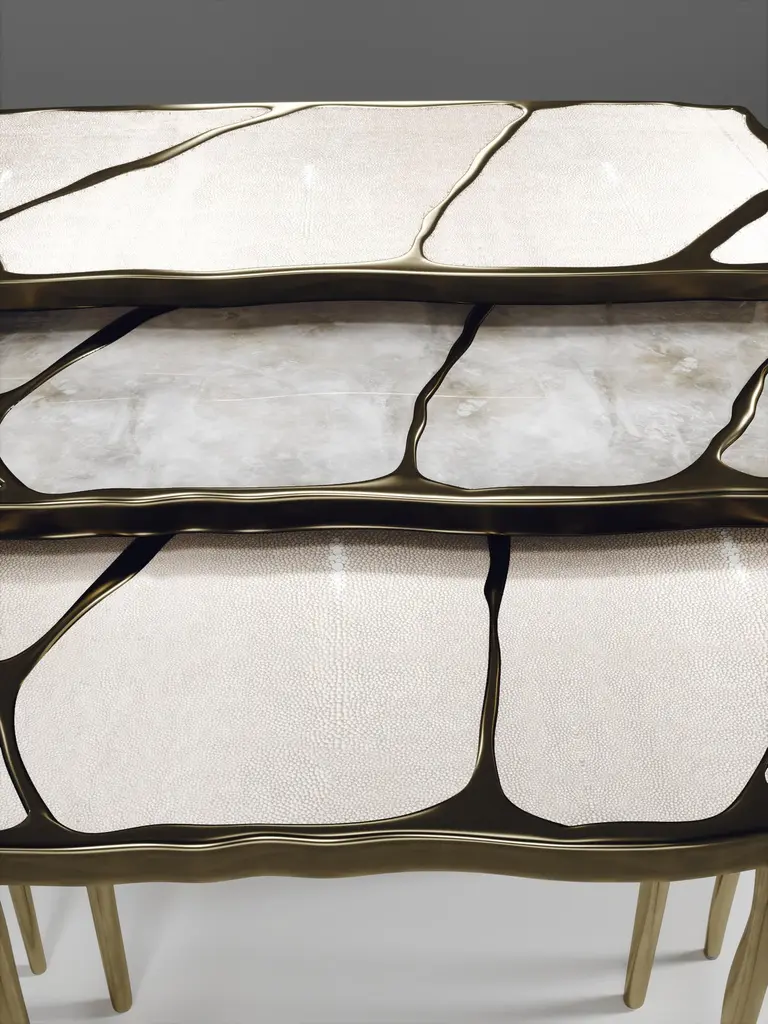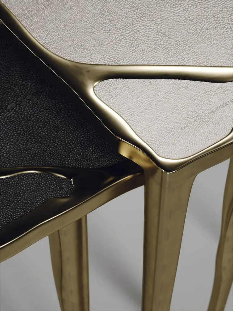 The Paris based label has distinguished themselves since their launch, with their iconic use of shagreen mixed with brass and other exotic materials. All furniture is handcrafted by skilled artisans, ultimately making each piece unique, designed in Paris and produced in the Philippines.The Melting II nesting side table large, is the perfect accent piece for any living space. These are sold either as a set of 3 to create elegant and geometric shapes, or individually. This listing is for the large size only. The top is inlaid in cream shagreen and framed with an irregular surface bronze-patina brass that continues as a pattern on the top surface as well as the shape of the legs, which creates the "melting" effect against the inlay work. The melting pattern on the top surface is only raised by 3mm. Available in different finishes, see images at end of slide.The dimensions of this piece are large 23.5 x 13.75 x 23.50"The dimensions of the other pieces in the set are:Small 7.25 x 14 x 20.75"Medium 20.5 x 13.75 x 19.75"All R&Y Augousti pieces are handmade by artisans, ultimately making each piece unique. Custom color/sizing available on request. Wipe clean with soft dry cloth.Acclaimed design duo Ria & Yiouri Augousti have established themselves since the 1990s as pioneers of modern-vintage style through their luxurious Art Deco inspired collections.The Paris based label has distinguished themselves since their launch, with their iconic use of shagreen mixed with brass and other exotic materials. All furniture is handcrafted by skilled artisans, ultimately making each piece unique. All shagreen-covered items should be kept out of direct sunlight, color variants may occur on the stingray and other exotic finishes, but this showcases the Parisian label's commitment to creating authentic luxurious products using natural components.