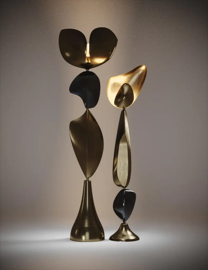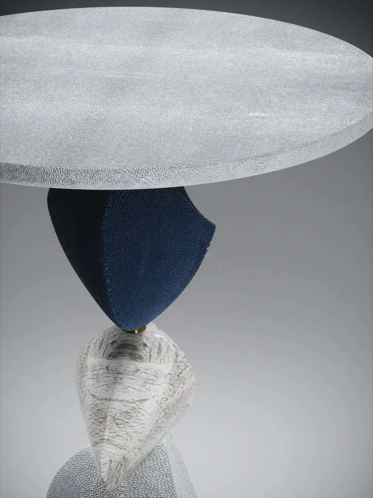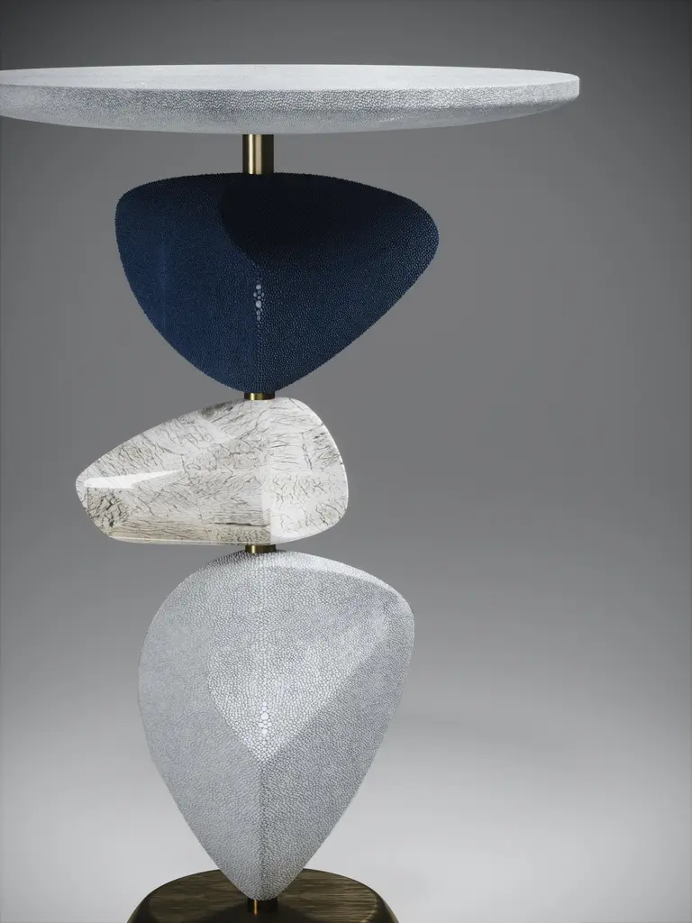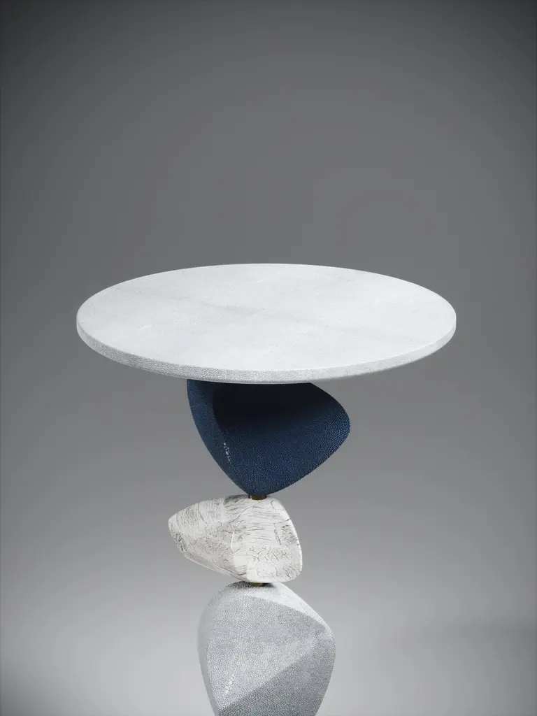The Paris based label has distinguished themselves since their launch, with their iconic use of shagreen mixed with brass and other exotic materials. All furniture is handcrafted by skilled artisans, ultimately making each piece unique, designed in Paris and produced in the Philippines.The Cosmo moon side table by Kifu Paris is a whimsical and sculptural piece, inlaid in pale grey blue shagreen shagreen, denim blue shagreen, baguio stone and bronze-patina brass. This piece is a sister to the original Cosmo Side Table by Kifu Paris, see images at end of slide. The amorphous shapes on the bottom part can be moved to adjust the angle of each part. Available in other finishes, images at end of slide. This piece is designed by Kifu Augousti, the daughter of Ria and Yiouri Augousti.All shagreen pieces are hand-dyed by artisans.The dimensions of this piece are 40 diameter x 60 cm / 15.75 diameter x 23.63"All Kifu Paris pieces are handmade by artisans, ultimately making each piece unique. Custom color or sizing available on request. Wipe clean with soft dry cloth.Although inspired by her parents, her collection of home accessories and furniture is a distinct identity of its own. Kifu uses handmade techniques of elaborate inlay patterns of shagreen, shells, semi-precious stones, materials she experienced as a child growing up in her parent’s studio, but interpreted in a younger quirkier way reflecting her youth. From her "jewelry inspired knobs" on decorative boxes, gold bar boxes and an extravagant inlay pattern mix of shagreen and shell inspired by galactic constellations, as seen on her enormous round mirror is refreshing to see. Kifu embodies whimsical elements throughout her collection and is not afraid to be daring and unexpected in her approach to design.All shagreen-covered items should be kept out of direct sunlight, color variants may occur on the stingray and other exotic finishes, but this showcases the Parisian label's commitment to creating authentic luxurious products using natural components.For all pieces inlaid with stone and semi-precious stones, due to the natural quality of the material color tonality and pattern placement may differ slightly per piece.