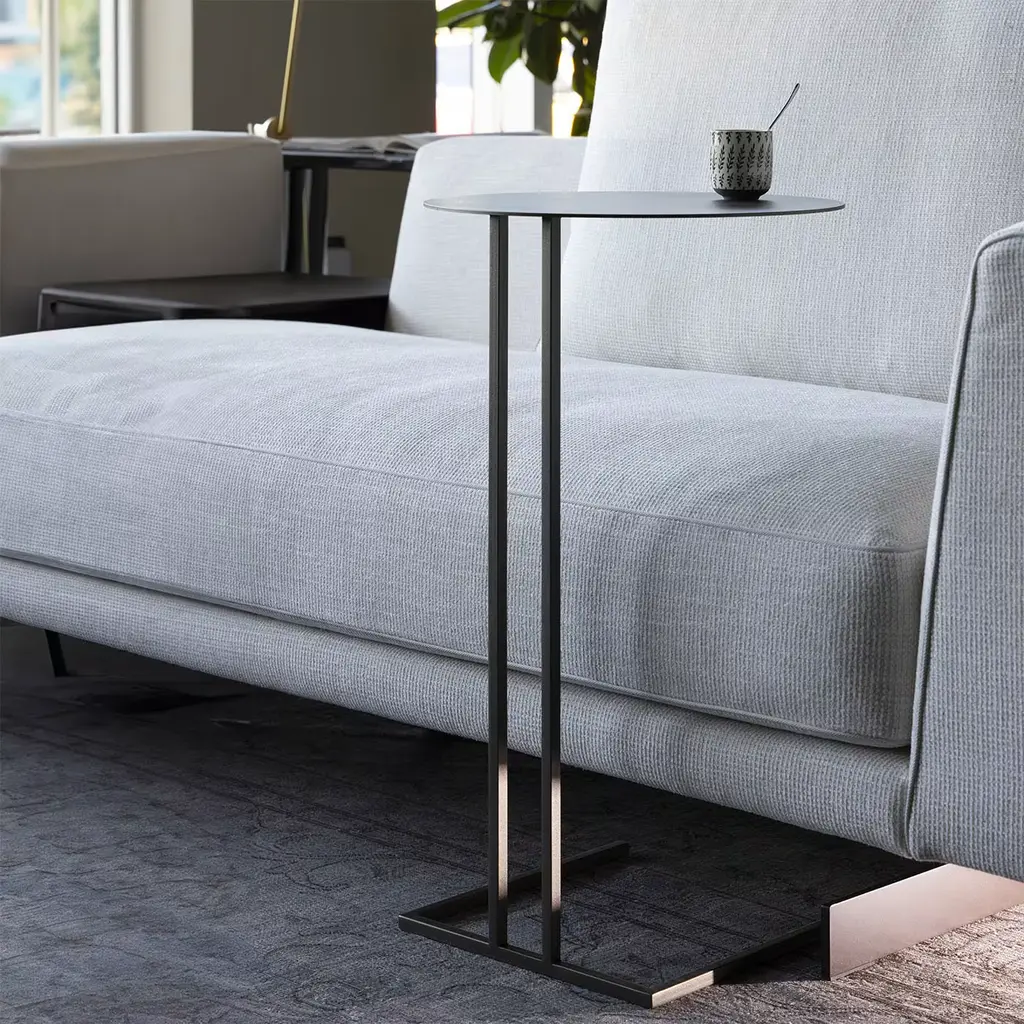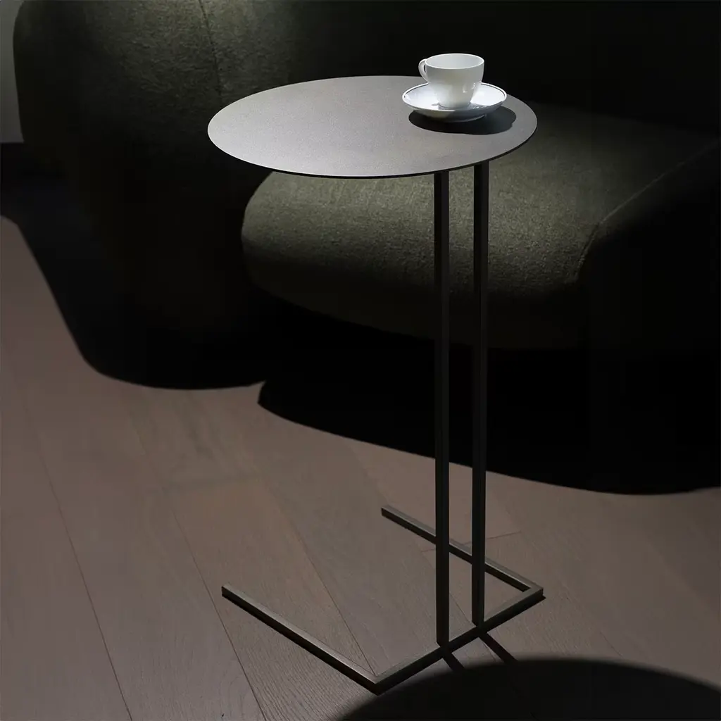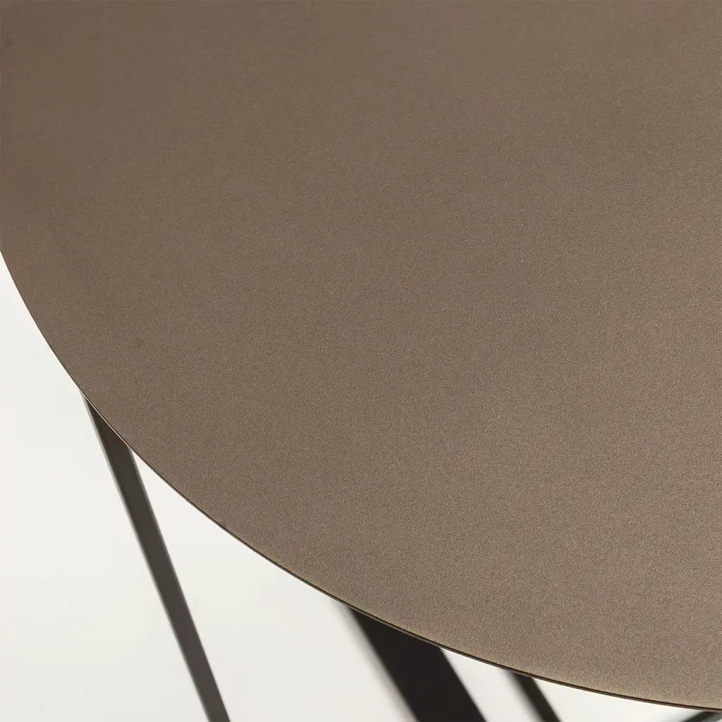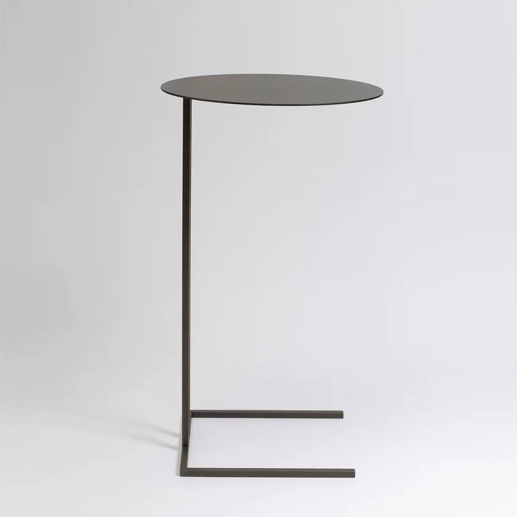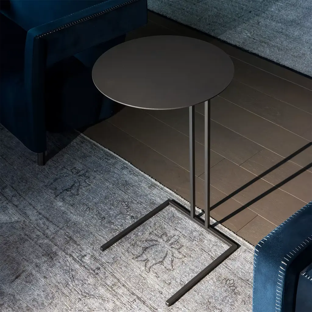 An ode to minimalist rigor, this round side table named after a star will ideally flank a contemporary sofa with its discreet and elegant silhouette. The U-like base is meant to be easily hidden under the sofa's or armchair's base for its top to be at reach. Practical and sophisticated, its iron structure flaunts an original Medici brown tone perfected with a slight golden metallic finish.