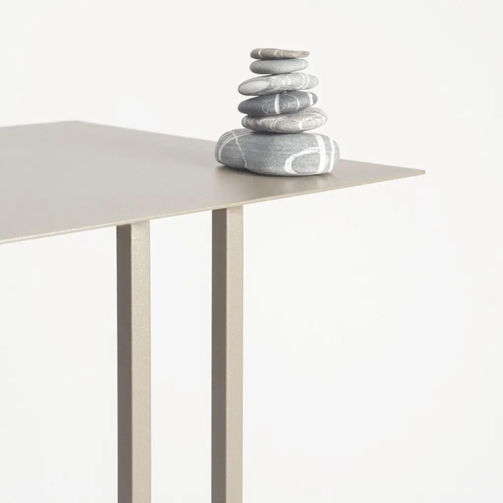 An exercise in graceful minimalism, this side table takes its name from the "alpha star" in the Cassiopeia constellation. Its iron structure finished in antiqued bronze is comprised of a square, utterly thin top connected to the base - shaped like a 3-sided square perimeter - by means of two parallel legs that define its asymmetrical profile. The possibility of hiding the base behind the sofa makes this side table useful, compact, and elegant.