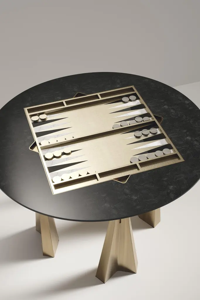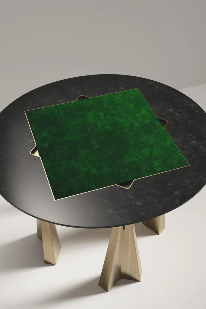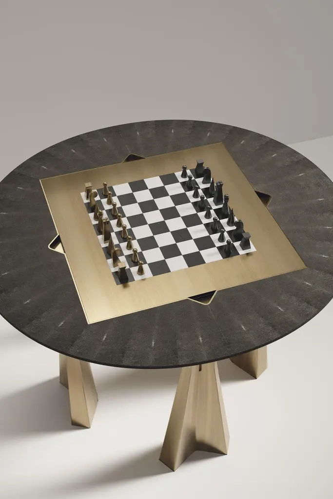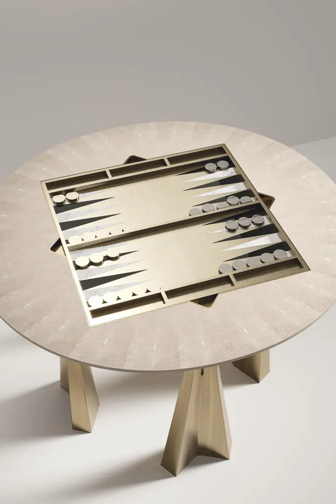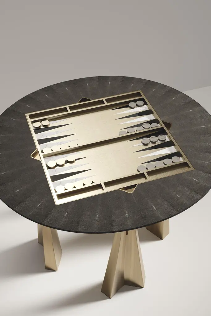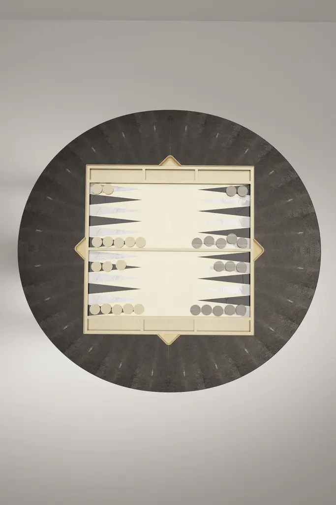 The Paris based label has distinguished themselves since their launch, with their iconic use of shagreen mixed with brass and other exotic materials. All furniture is handcrafted by skilled artisans, ultimately making each piece unique, designed in Paris and produced in the Philippines.The 4 in 1 Arche game table R&Y Augousti is a truly luxurious statement piece for your home. The clean lines of the overall piece in black pen shell, accentuated by the sculptural and cut out bronze-patina brass base make it versatile for any space. This piece includes a complete game package set with interchangeable boards that stack on top of each other in the centre of the table; one for chess, one for backgammon backgammon, a green velvet bard to play your favourite card games and a plain shagreen board if one were to use it as a beautiful centre piece. The piece also includes a shagreen box lined with a velvet interior to store your chess and backgammon pieces. All the above are stored and stacked in the table with the last board piece being flushed in line with the tabletop. Four triangle grooves are on the side of the board's central location on the tabletop to facilitate changing and removing each board. Available in other finishes, see images at end of slide.The dimensions of this piece are 110 dia x 75 cmAll R&Y Augousti pieces are handmade by artisans, ultimately making each piece unique. Wipe clean with soft dry cloth.Acclaimed design duo Ria & Yiouri Augousti have established themselves since the 1990s as pioneers of modern-vintage style through their luxurious Art Deco inspired collections.The Paris based label has distinguished themselves since their launch, with their iconic use of shagreen mixed with brass and other exotic materials. All furniture is handcrafted by skilled artisans, ultimately making each piece unique. All shagreen-covered items should be kept out of direct sunlight, color variants may occur on the stingray and other exotic finishes, but this showcases the Parisian label's commitment to creating authentic luxurious products using natural components.