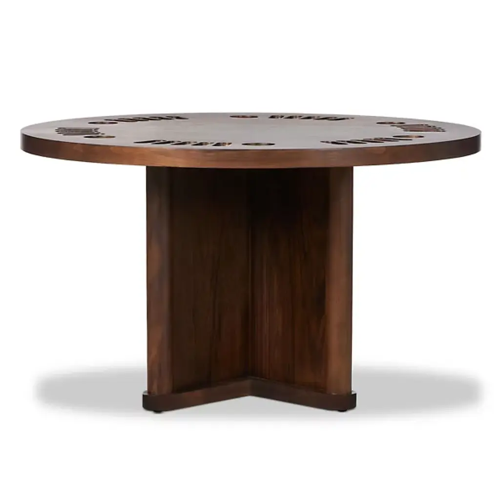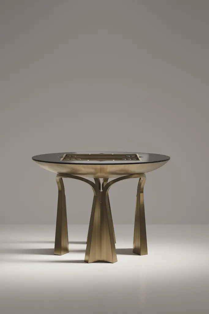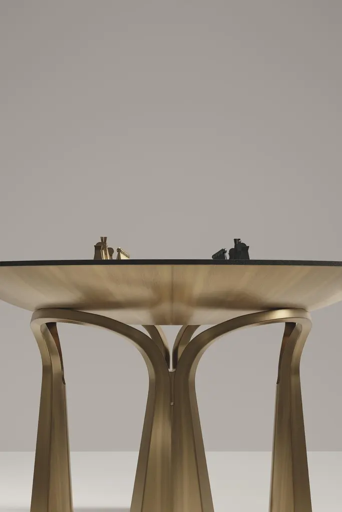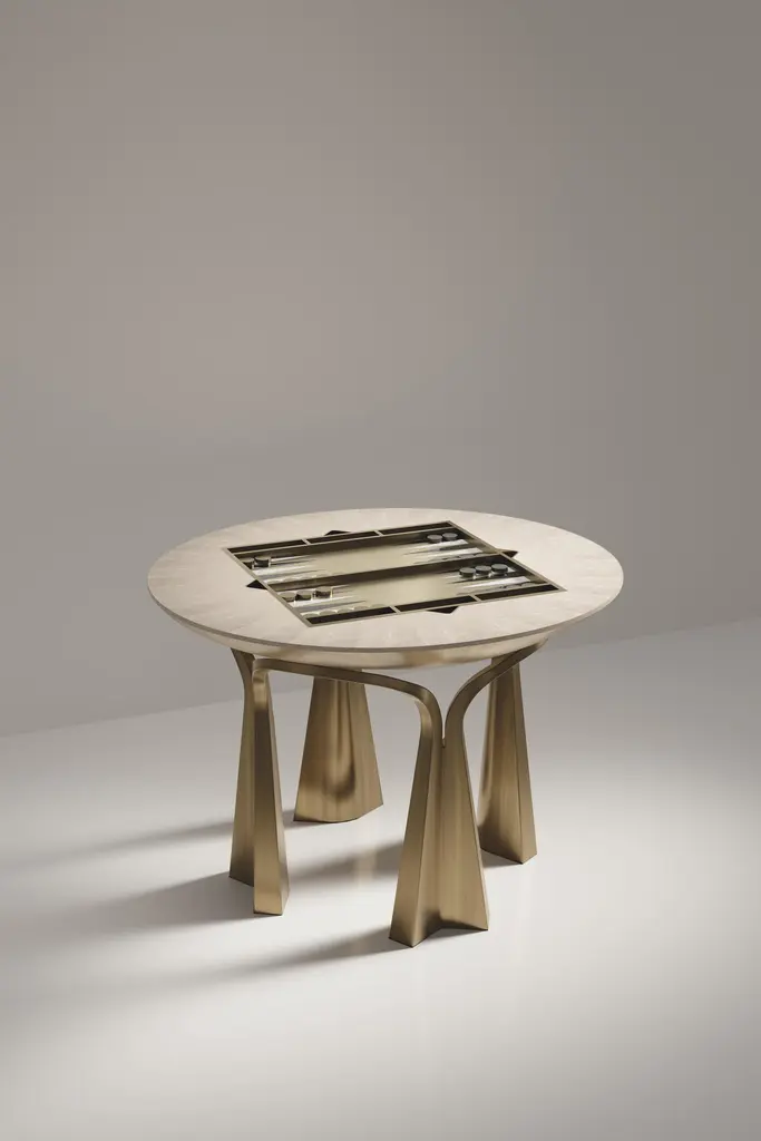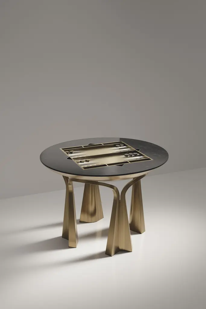 The Paris based label has distinguished themselves since their launch, with their iconic use of shagreen mixed with brass and other exotic materials. All furniture is handcrafted by skilled artisans, ultimately making each piece unique, designed in Paris and produced in the Philippines.The 4 in 1 Arche game table R&Y Augousti is a truly luxurious statement piece for your home. The clean lines of the overall piece in black pen shell, accentuated by the sculptural and cut out bronze-patina brass base make it versatile for any space. This piece includes a complete game package set with interchangeable boards that stack on top of each other in the centre of the table; one for chess, one for backgammon backgammon, a green velvet bard to play your favourite card games and a plain shagreen board if one were to use it as a beautiful centre piece. The piece also includes a shagreen box lined with a velvet interior to store your chess and backgammon pieces. All the above are stored and stacked in the table with the last board piece being flushed in line with the tabletop. Four triangle grooves are on the side of the board's central location on the tabletop to facilitate changing and removing each board. Available in other finishes, see images at end of slide.The dimensions of this piece are 110 dia x 75 cmAll R&Y Augousti pieces are handmade by artisans, ultimately making each piece unique. Wipe clean with soft dry cloth.Acclaimed design duo Ria & Yiouri Augousti have established themselves since the 1990s as pioneers of modern-vintage style through their luxurious Art Deco inspired collections.The Paris based label has distinguished themselves since their launch, with their iconic use of shagreen mixed with brass and other exotic materials. All furniture is handcrafted by skilled artisans, ultimately making each piece unique. All shagreen-covered items should be kept out of direct sunlight, color variants may occur on the stingray and other exotic finishes, but this showcases the Parisian label's commitment to creating authentic luxurious products using natural components.