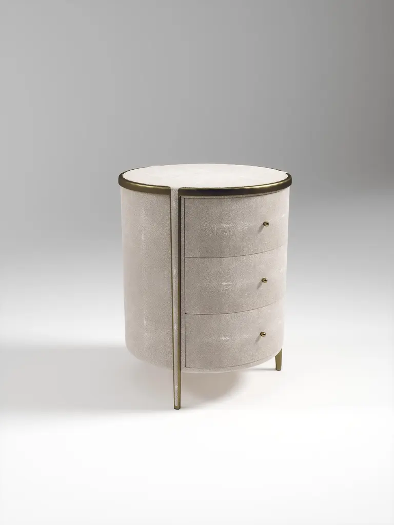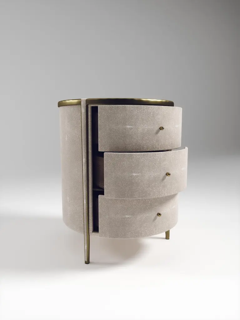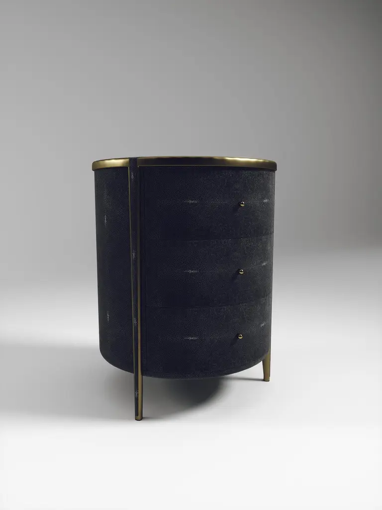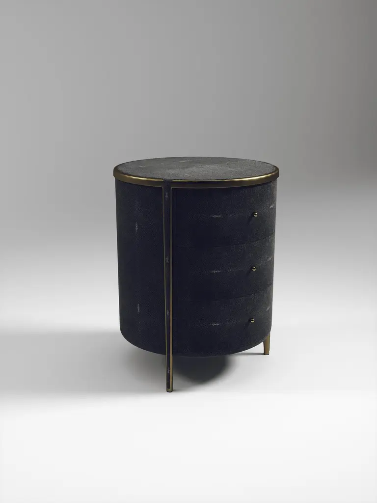 The Paris based label has distinguished themselves since their launch, with their iconic use of shagreen mixed with brass and other exotic materials. All furniture is handcrafted by skilled artisans, ultimately making each piece unique, designed in Paris and produced in the Philippines.The Melting Round Bedside Table by R&Y Augousti is an elegant piece for any space. The black pen shell inlaid piece is classic, but accentuated by their signature organic melting bronze-patina brass frame. This side table includes 3 drawers. This piece is part of the Melting Capsule, see images at end of slide of the collection. Available in other finishes, see images at end of slide. Custom sizing / finishing available in requestMeasures: 50 dia x 60 cm All R & Y Augousti pieces are handmade by artisans, ultimately making each piece unique. Custom color/sizing available on request. Wipe clean with soft dry cloth.Acclaimed design duo Ria & Yiouri Augousti have established themselves since the 1990s as pioneers of modern-vintage style through their luxurious Art Deco inspired collections.The Paris based label has distinguished themselves since their launch, with their iconic use of shagreen mixed with brass and other exotic materials. All furniture is handcrafted by skilled artisans, ultimately making each piece unique. All shagreen-covered items should be kept out of direct sunlight, color variants may occur on the stingray and other exotic finishes, but this showcases the Parisian label's commitment to creating authentic luxurious products using natural components.