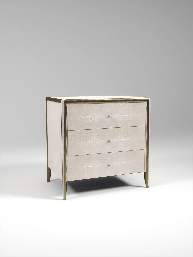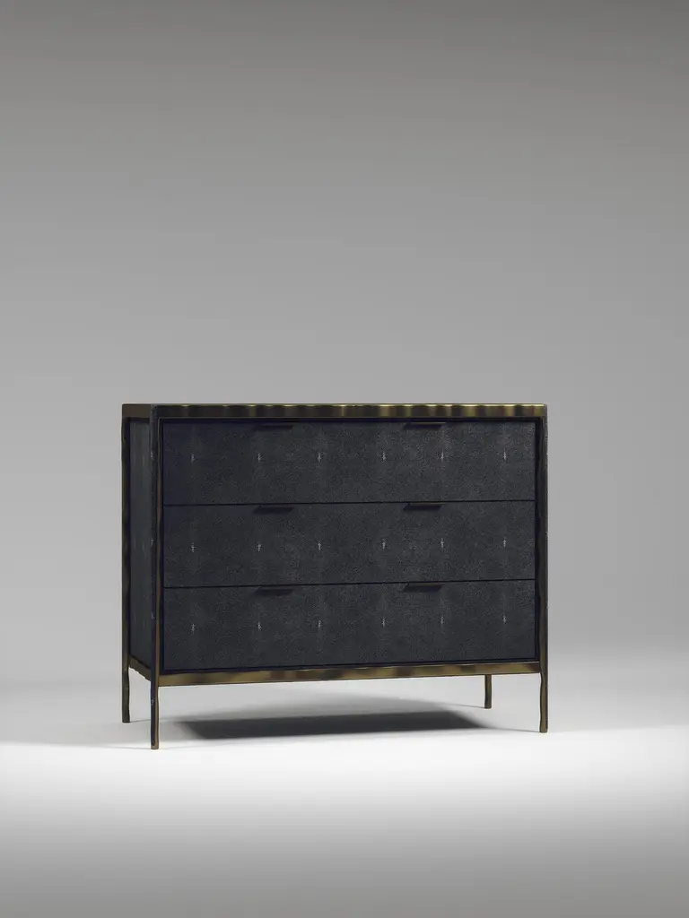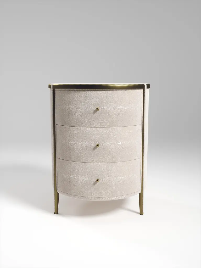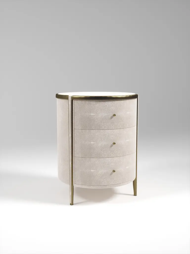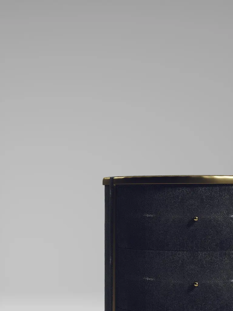 The Paris based label has distinguished themselves since their launch, with their iconic use of shagreen mixed with brass and other exotic materials. All furniture is handcrafted by skilled artisans, ultimately making each piece unique, designed in Paris and produced in the Philippines.The Melting Round Bedside Table by R&Y Augousti is an elegant piece for any space. The black pen shell inlaid piece is classic, but accentuated by their signature organic melting bronze-patina brass frame. This side table includes 3 drawers. This piece is part of the Melting Capsule, see images at end of slide of the collection. Available in other finishes, see images at end of slide. Custom sizing / finishing available in requestMeasures: 50 dia x 60 cm All R & Y Augousti pieces are handmade by artisans, ultimately making each piece unique. Custom color/sizing available on request. Wipe clean with soft dry cloth.Acclaimed design duo Ria & Yiouri Augousti have established themselves since the 1990s as pioneers of modern-vintage style through their luxurious Art Deco inspired collections.The Paris based label has distinguished themselves since their launch, with their iconic use of shagreen mixed with brass and other exotic materials. All furniture is handcrafted by skilled artisans, ultimately making each piece unique. All shagreen-covered items should be kept out of direct sunlight, color variants may occur on the stingray and other exotic finishes, but this showcases the Parisian label's commitment to creating authentic luxurious products using natural components.
