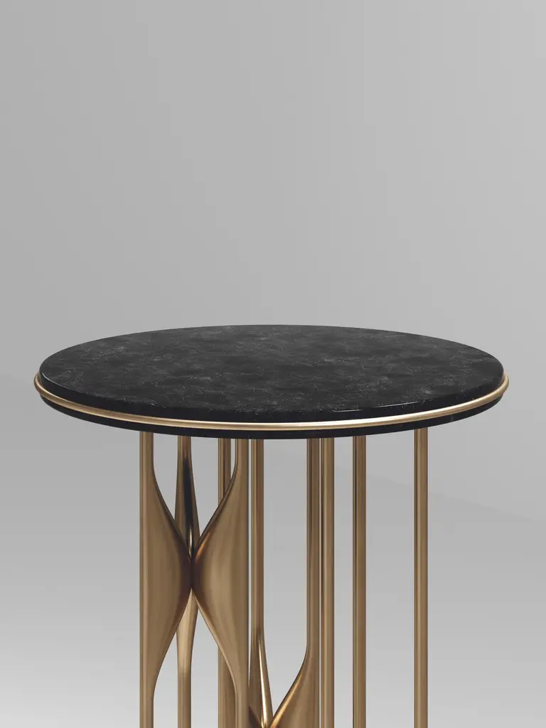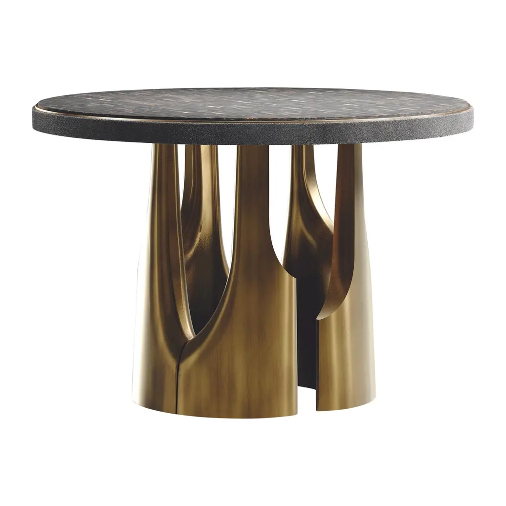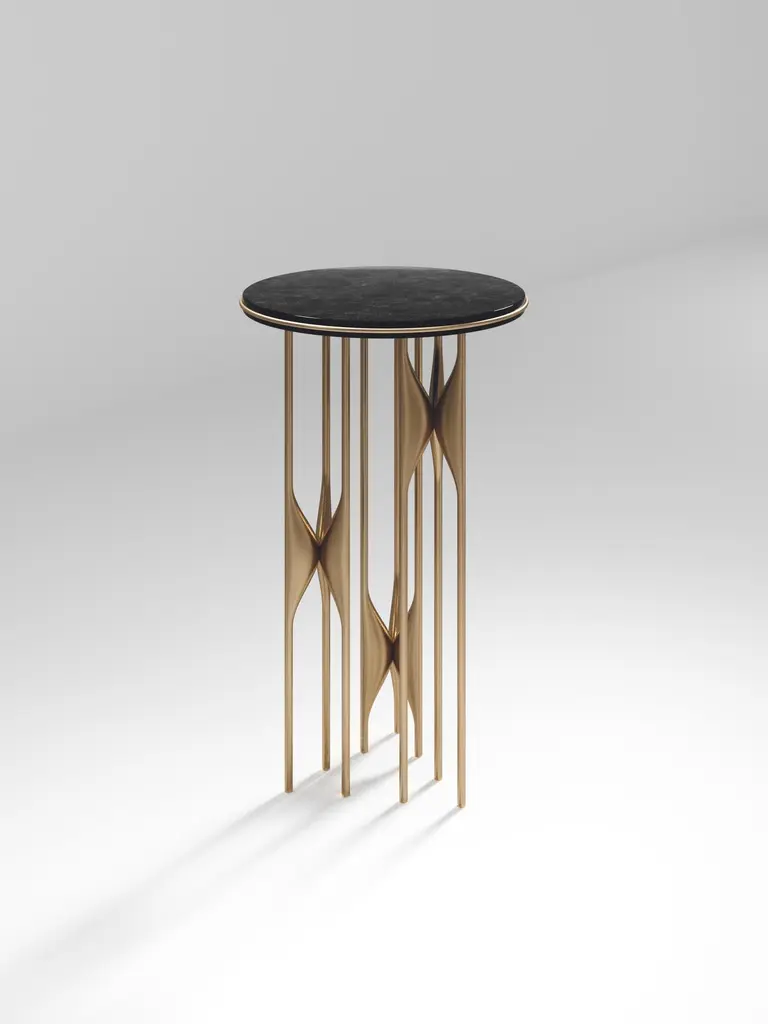 The Paris based label has distinguished themselves since their launch, with their iconic use of shagreen mixed with brass and other exotic materials. All furniture is handcrafted by skilled artisans, ultimately making each piece unique, designed in Paris and produced in the Philippines.The Plumeria sidetable by Kifu Paris is dramatic and sculptural piece. The black pen shell inlaid top sits on clusters of bronze-patina brass legs that are conceptually inspired by bird feathers floating on top of a lake. The border of the top is accentuated by a subtle and elegant bronze-patina brass indentation detail. Pair this piece with the medium size and they become a stunning nesting set. This piece is designed by Kifu Augousti the daughter of Ria and Yiouri Augousti. Available in other finishes. Can be purchased as a set of nesting tables, see other listings. Part of the Plumeria Capsule, see images of the collection at end of the slide.The dimensions of this piece are 35 diameter x 60 cmAll Kifu Paris pieces are handmade by artisans, ultimately making each piece unique.Custom color/sizing available on request.Wipe clean with soft dry cloth.Although inspired by her parents, her collection of Home Accessories and Furniture is a distinct identity of its own. Kifu uses handmade techniques of elaborate inlay patterns of shagreen, shells, semi-precious stones, materials she experienced as a child growing up in her parent’s studio, but interpreted in a younger quirkier way reflecting her youth. From her "jewelry inspired knobs" on decorative boxes, gold bar boxes and an extravagant inlay pattern mix of shagreen and shell inspired by galactic constellations, as seen on her enormous round mirror, is refreshing to see. Kifu embodies whimsical elements throughout her collection and is not afraid to be daring and unexpected in her approach to design.All shagreen-covered items should be kept out of direct sunlight, color variants may occur on the stingray and other exotic finishes, but this showcases the Parisian label's commitment to creating authentic luxurious products using natural components.