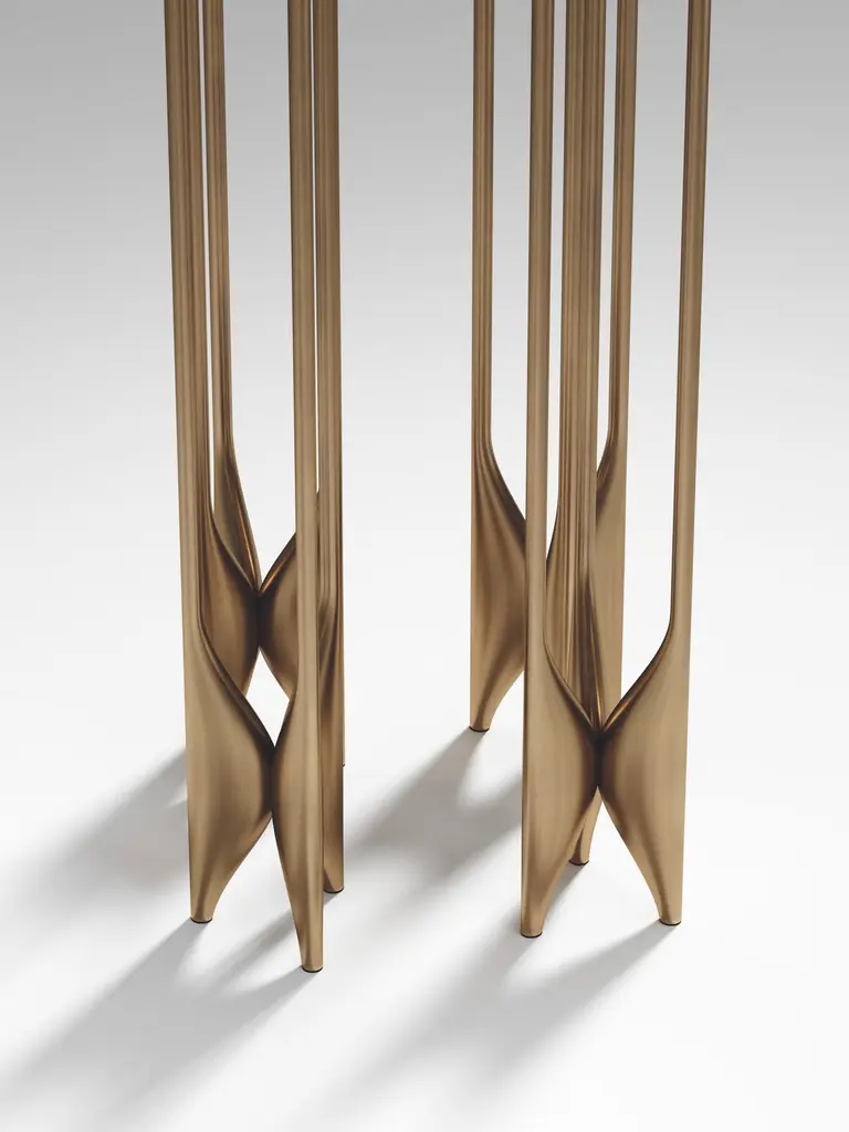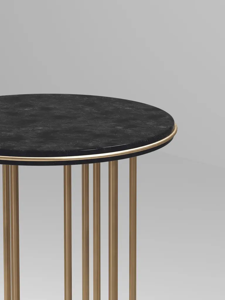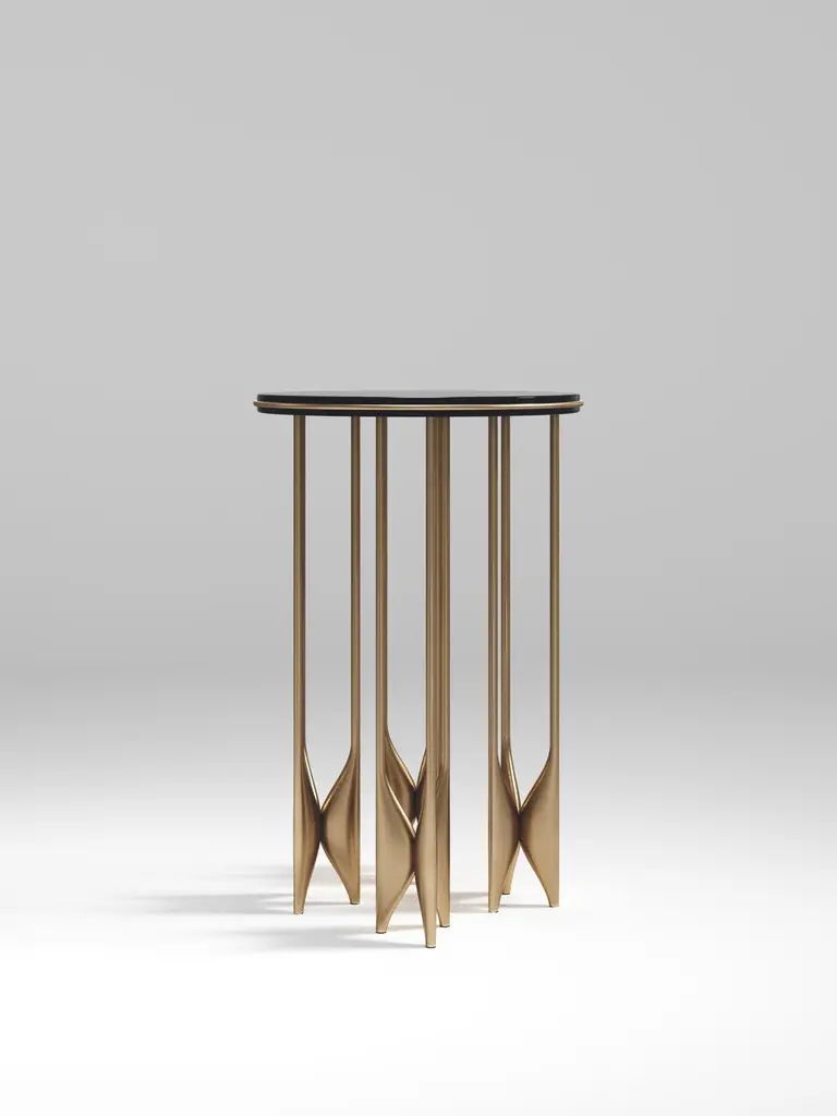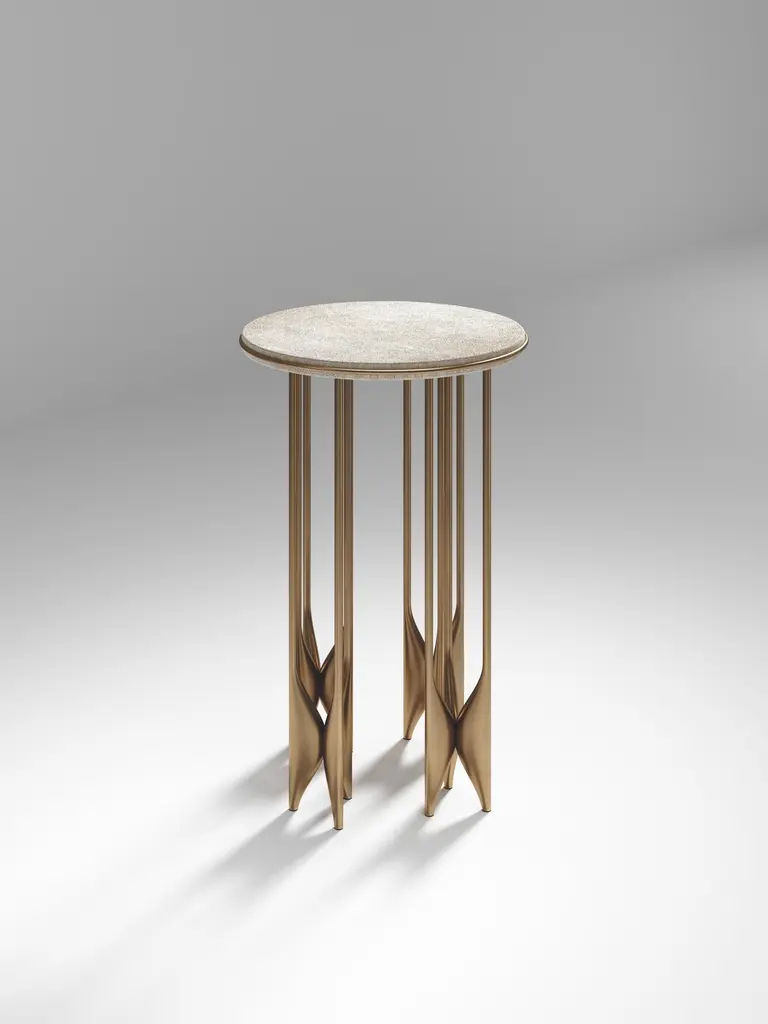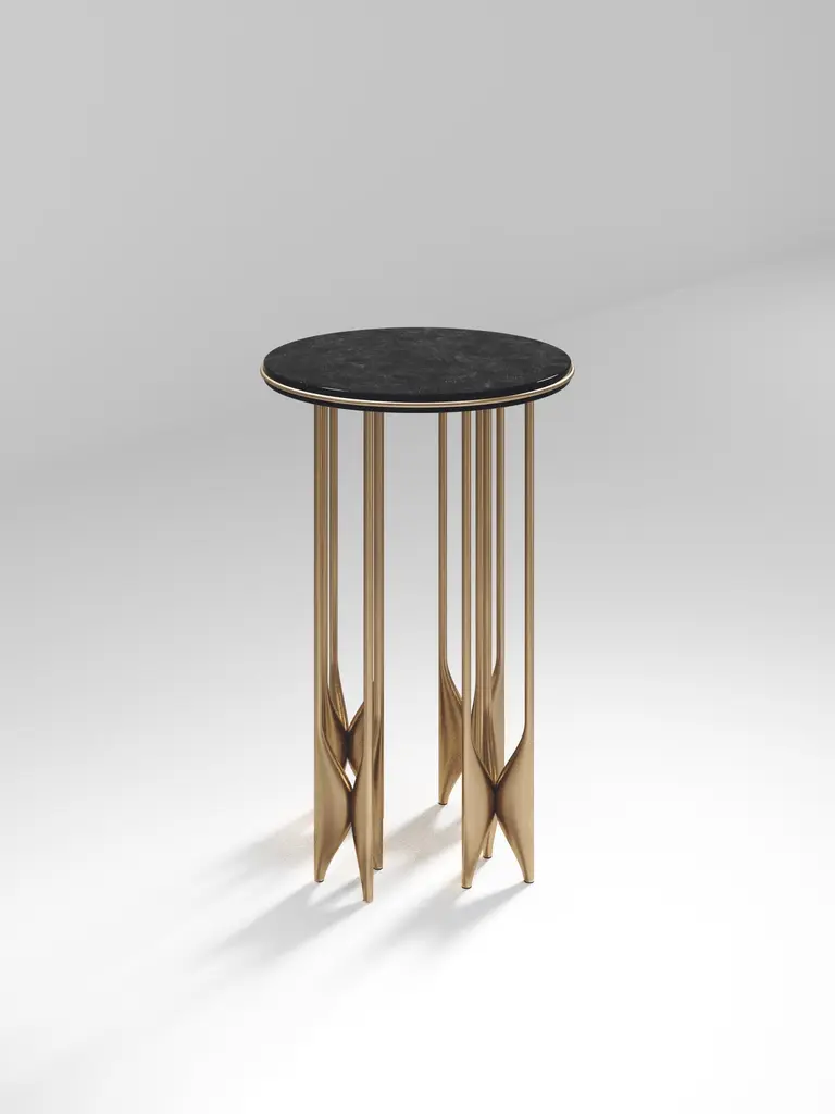The Paris based label has distinguished themselves since their launch, with their iconic use of shagreen mixed with brass and other exotic materials. All furniture is handcrafted by skilled artisans, ultimately making each piece unique, designed in Paris and produced in the Philippines.The Plumeria side table by Kifu Paris is a dramatic and sculptural piece. The black pen shell inlaid top sits on clusters of bronze-patina brass legs that are conceptually inspired by bird feathers floating on top of a lake. The border of the top is accentuated by a subtle and elegant bronze-patina brass indentation detail. Add the larger size and this becomes a stunning nesting set. This piece is designed by Kifu Augousti the daughter of Ria and Yiouri Augousti. Available in other finishes. Can be purchased as a nesting set, see other listings. Part of the Plumeria Capsule, see images of the collection at end of the slide.The dimensions of this piece are 35 diameter x 55 cmAll Kifu Paris pieces are handmade by artisans, ultimately making each piece unique.Custom color/sizing available on request.Wipe clean with soft dry cloth.Although inspired by her parents, her collection of Home Accessories and Furniture is a distinct identity of its own. Kifu uses handmade techniques of elaborate inlay patterns of shagreen, shells, semi-precious stones, materials she experienced as a child growing up in her parent’s studio, but interpreted in a younger quirkier way reflecting her youth. From her "jewelry inspired knobs" on decorative boxes, gold bar boxes and an extravagant inlay pattern mix of shagreen and shell inspired by galactic constellations, as seen on her enormous round mirror, is refreshing to see. Kifu embodies whimsical elements throughout her collection and is not afraid to be daring and unexpected in her approach to design.All shagreen-covered items should be kept out of direct sunlight, color variants may occur on the stingray and other exotic finishes, but this showcases the Parisian label's commitment to creating authentic luxurious products using natural components.
