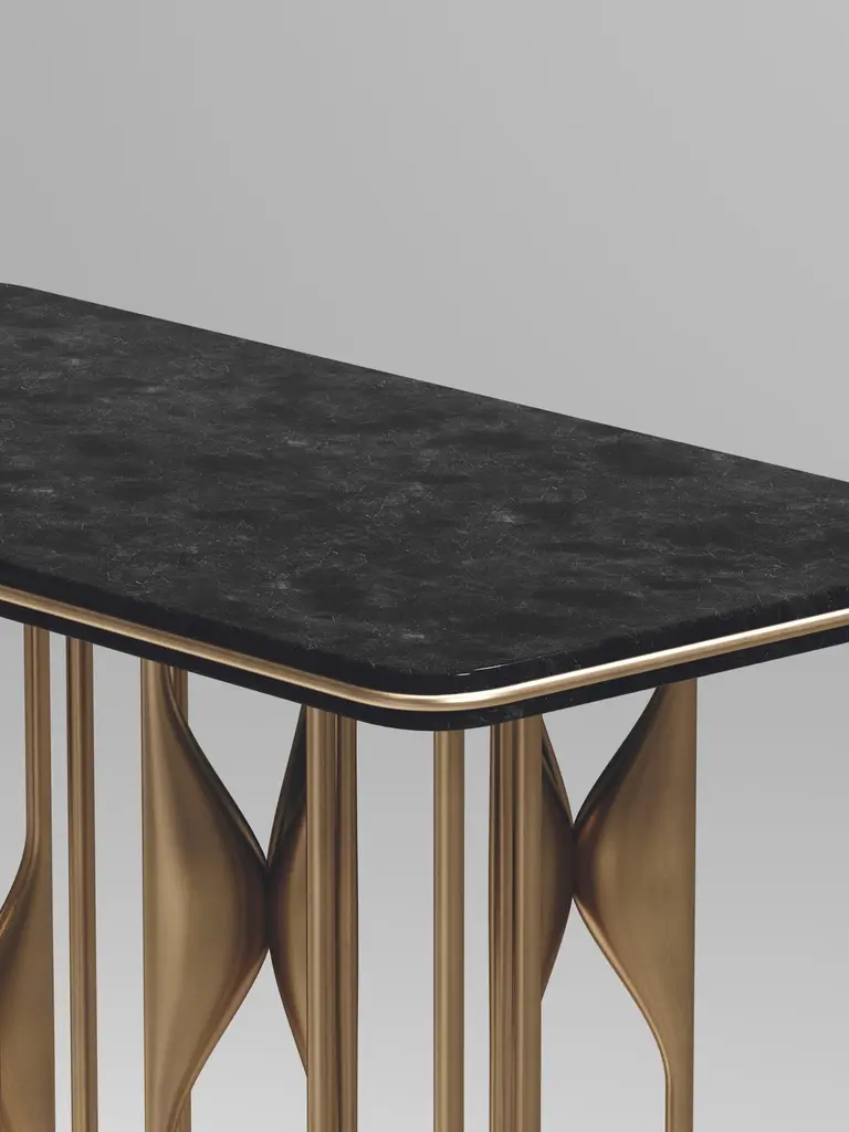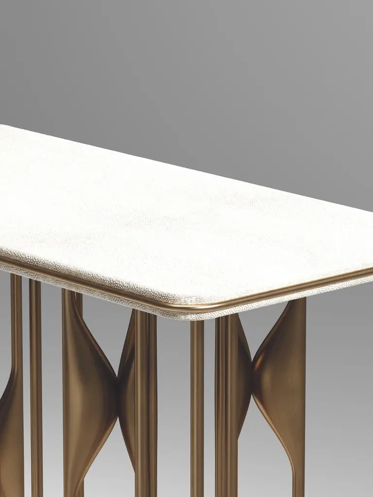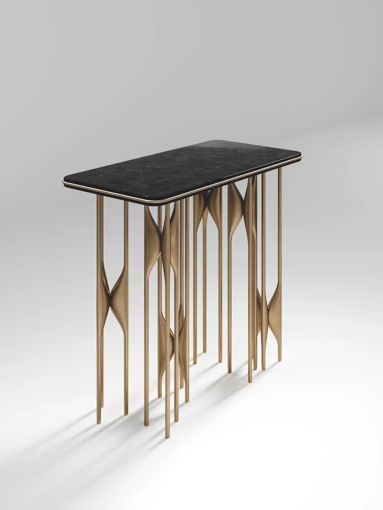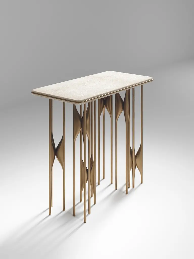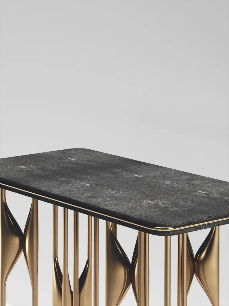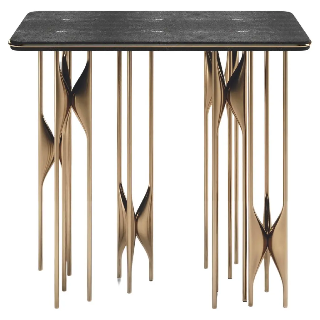 The Paris based label has distinguished themselves since their launch, with their iconic use of shagreen mixed with brass and other exotic materials. All furniture is handcrafted by skilled artisans, ultimately making each piece unique, designed in Paris and produced in the Philippines.The Plumeria rectangle side table by Kifu Paris is a dramatic and sculptural piece. The black pen shell inlaid top sits on clusters of bronze-patina brass legs that are conceptually inspired by bird feathers floating on top of a lake. The border of the top is accentuated by a subtle and elegant bronze-patina brass indentation detail. This piece is designed by Kifu Augousti the daughter of Ria and Yiouri Augousti. Available in other finishes. Part of the Plumeria Capsule, see images of the collection at end of the slide.The dimensions of this piece are 60 x 35 x 60 cmAll Kifu Paris pieces are handmade by artisans, ultimately making each piece unique.Custom color/sizing available on request.Wipe clean with soft dry cloth.Although inspired by her parents, her collection of Home Accessories and Furniture is a distinct identity of its own. Kifu uses handmade techniques of elaborate inlay patterns of shagreen, shells, semi-precious stones, materials she experienced as a child growing up in her parent’s studio, but interpreted in a younger quirkier way reflecting her youth. From her "jewelry inspired knobs" on decorative boxes, gold bar boxes and an extravagant inlay pattern mix of shagreen and shell inspired by galactic constellations, as seen on her enormous round mirror, is refreshing to see. Kifu embodies whimsical elements throughout her collection and is not afraid to be daring and unexpected in her approach to design.All shagreen-covered items should be kept out of direct sunlight, color variants may occur on the stingray and other exotic finishes, but this showcases the Parisian label's commitment to creating authentic luxurious products using natural components.