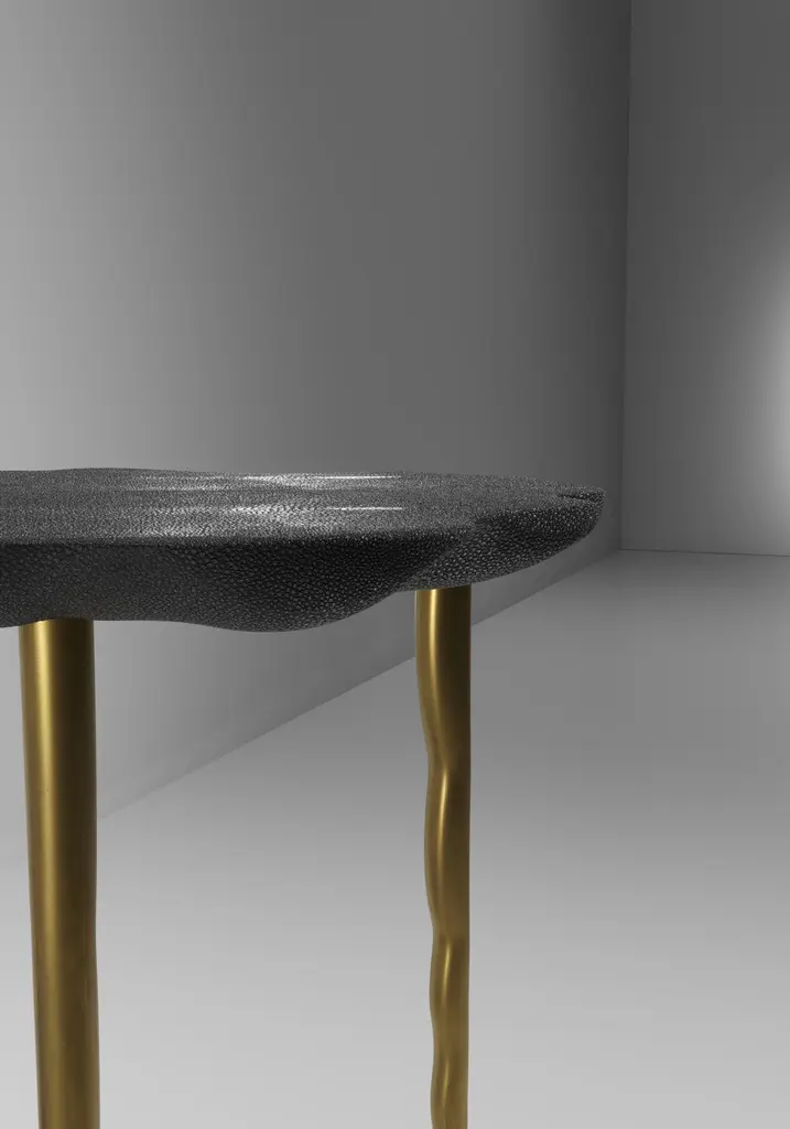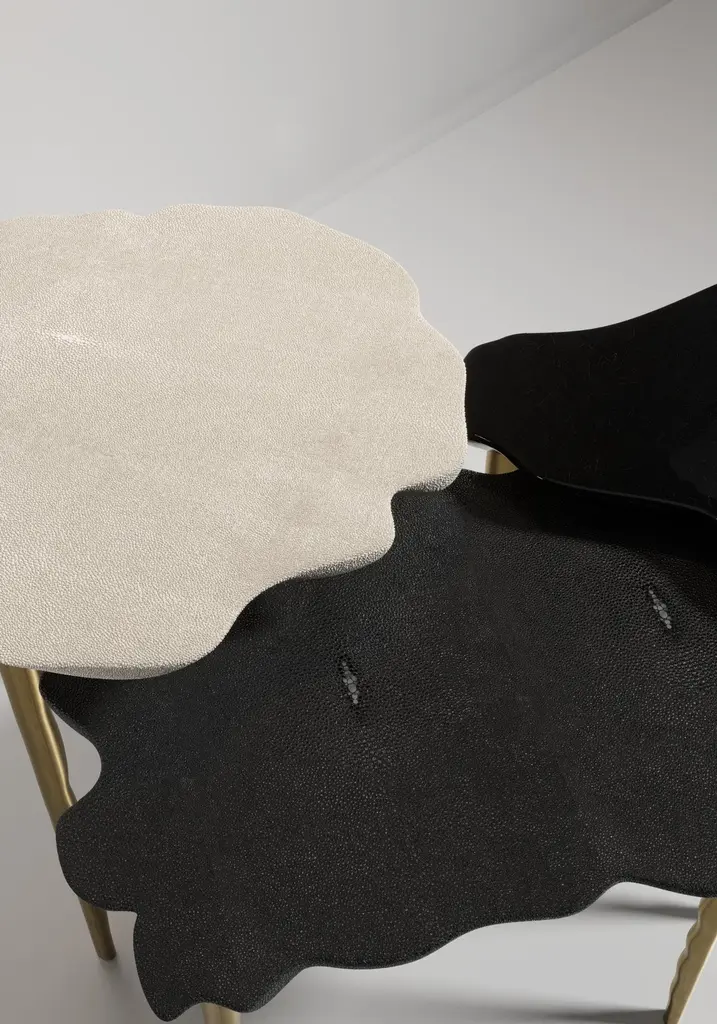 The Paris based label has distinguished themselves since their launch, with their iconic use of shagreen mixed with brass and other exotic materials. All furniture is handcrafted by skilled artisans, ultimately making each piece unique, designed in Paris and produced in the Philippines.The Cirrus Cloud Side Table in Black Pen Shell by R&Y Augousti is a whimsical and elegant interpretation of floating clouds. The amorphous shaped top comes in two other organic forms in this series; Nimbus & Cirrus. Together all 3 can become a nesting set, playing into the inspiration of organic shapes of clouds in the sky. The tabletop sits above 3 melting shaped bronze patina brass, emulating the idea of thunder coming from the clouds. This table comes in other finishes as well.The dimensions of this piece are :Cirrus 50 x 50 x 62 cmStratus 60 x 40 x 55 cmNimbus 58 x 40 x 50 cmAll R&Y Augousti pieces are handmade by artisans, ultimately making each piece unique.Wipe clean with soft dry cloth.All R&Y Augousti pieces are handmade by artisans, ultimately making each piece unique.Wipe clean with soft dry cloth.Acclaimed design duo Ria & Yiouri Augousti have established themselves since the 1990s as pioneers of modern-vintage style through their luxurious Art Deco inspired collections.The Paris based label has distinguished themselves since their launch, with their iconic use of shagreen mixed with brass and other exotic materials. All furniture is handcrafted by skilled artisans, ultimately making each piece unique.All shagreen-covered items should be kept out of direct sunlight, color variants may occur on the stingray and other exotic finishes, but this showcases the Parisian label's commitment to creating authentic luxurious products using natural components.