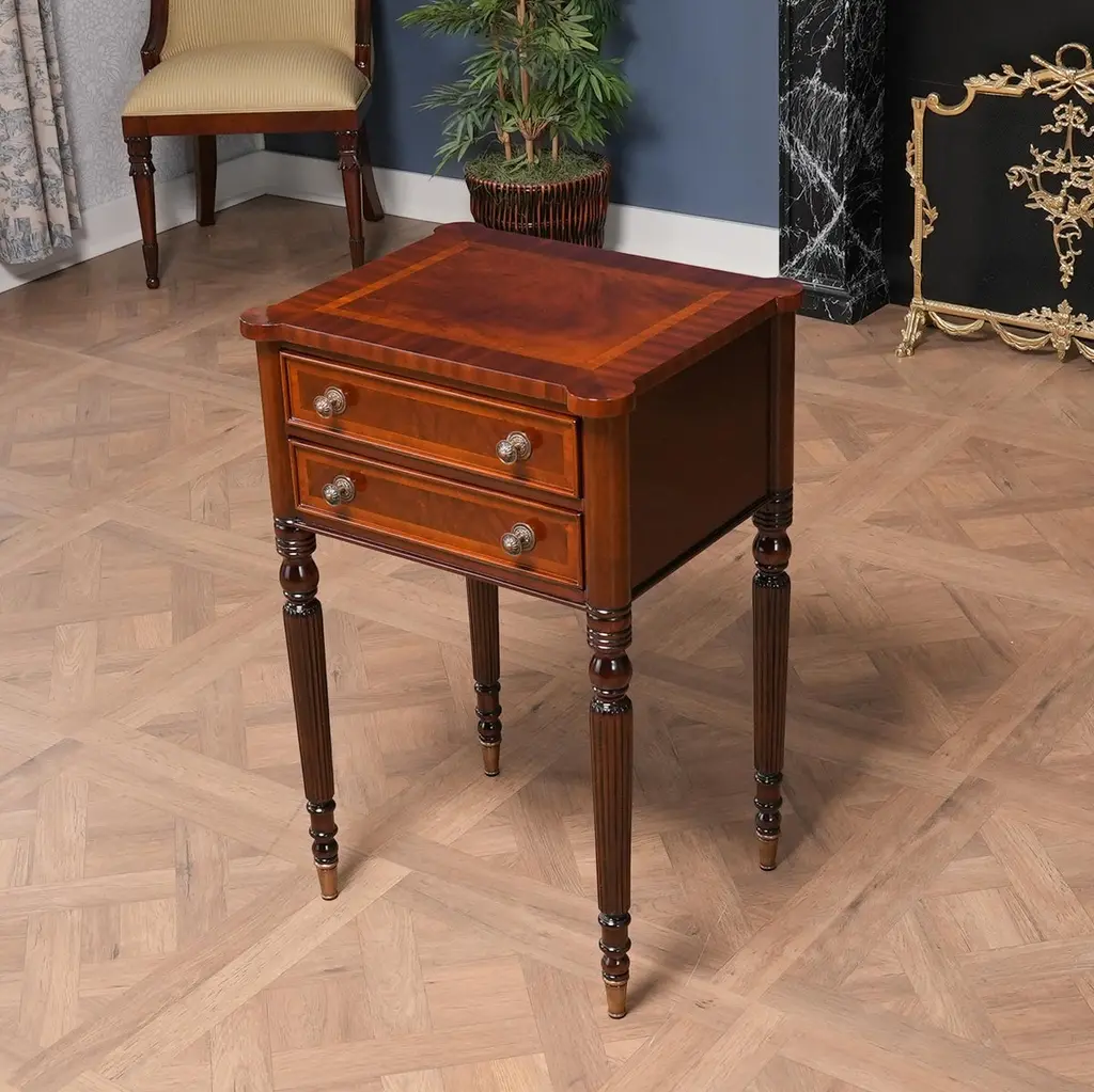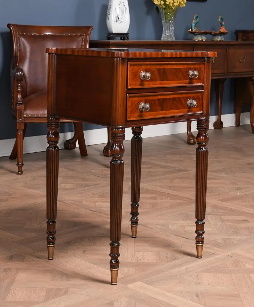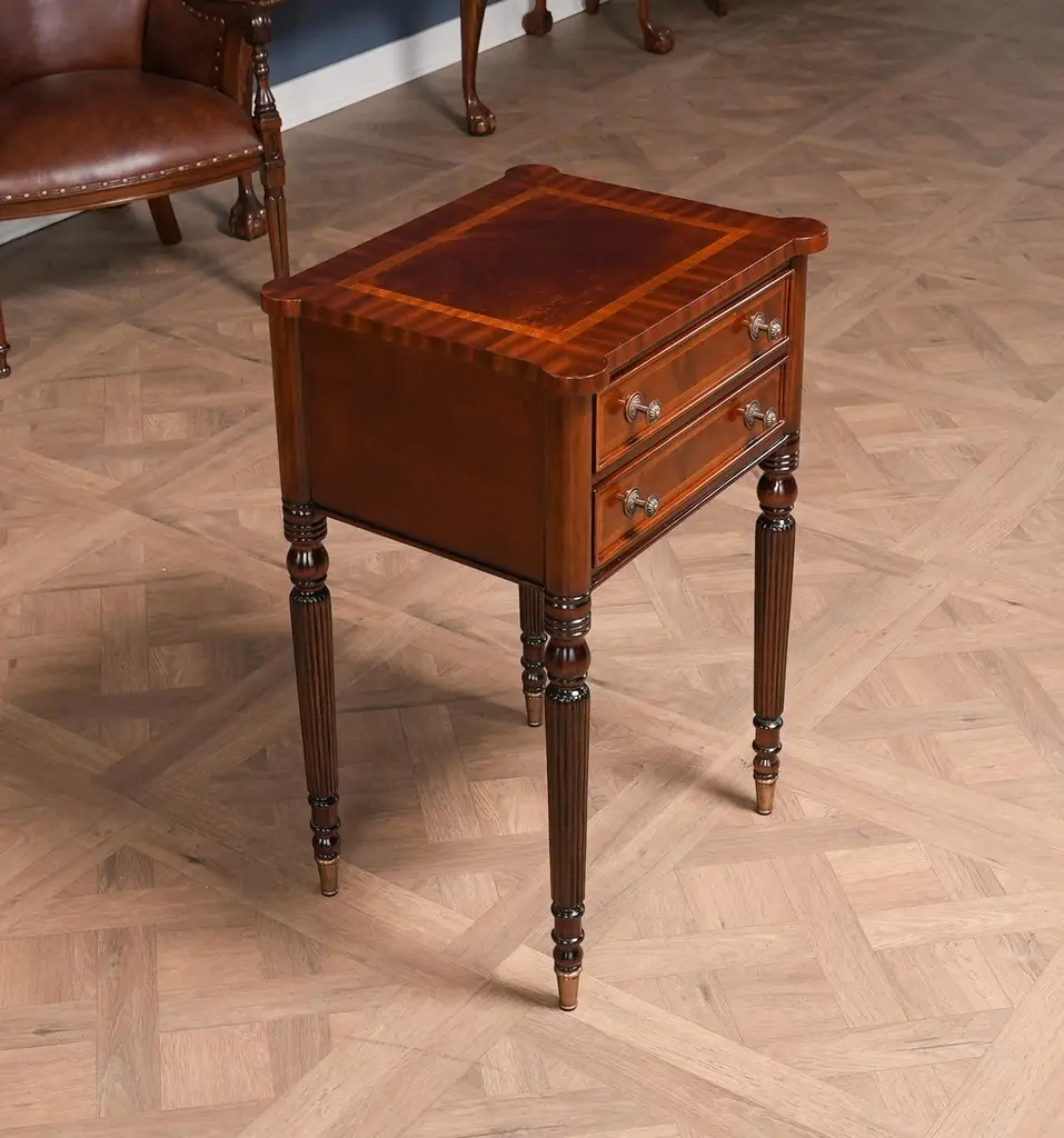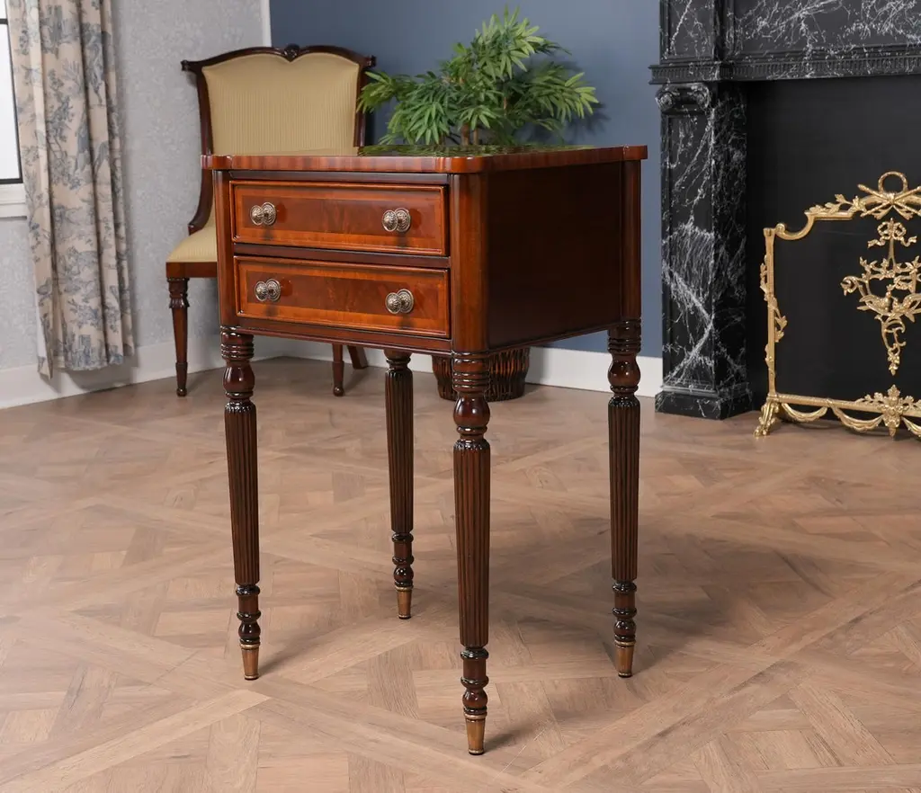 Our Sheraton End Table draws on a design first popularized by Thomas Sheraton whose work as a cabinet maker was very influential in Eighteenth Century England. The Sheraton End Table has become the best selling end table at Niagara Furniture. With it’s interesting and attractive shape the top is further decorated with satinwood and mahogany banding around a figural mahogany field. Similarly decorated the two drawers are dovetailed and feature finely detailed hardware of the finest quality. And all of this is supported on four turned, reeded legs ending in solid brass caps. See the matching console featured below.Also often used as night stands and in small spaces in hallways in the home.Measures 21″w x 17″d x 31″h metric 53 43 79
