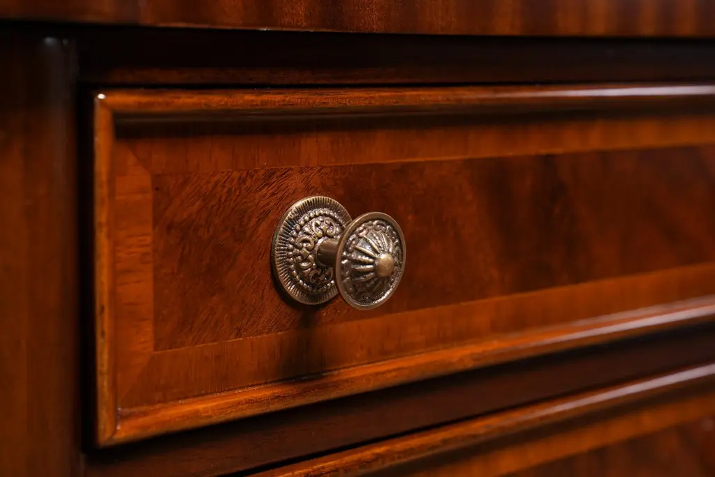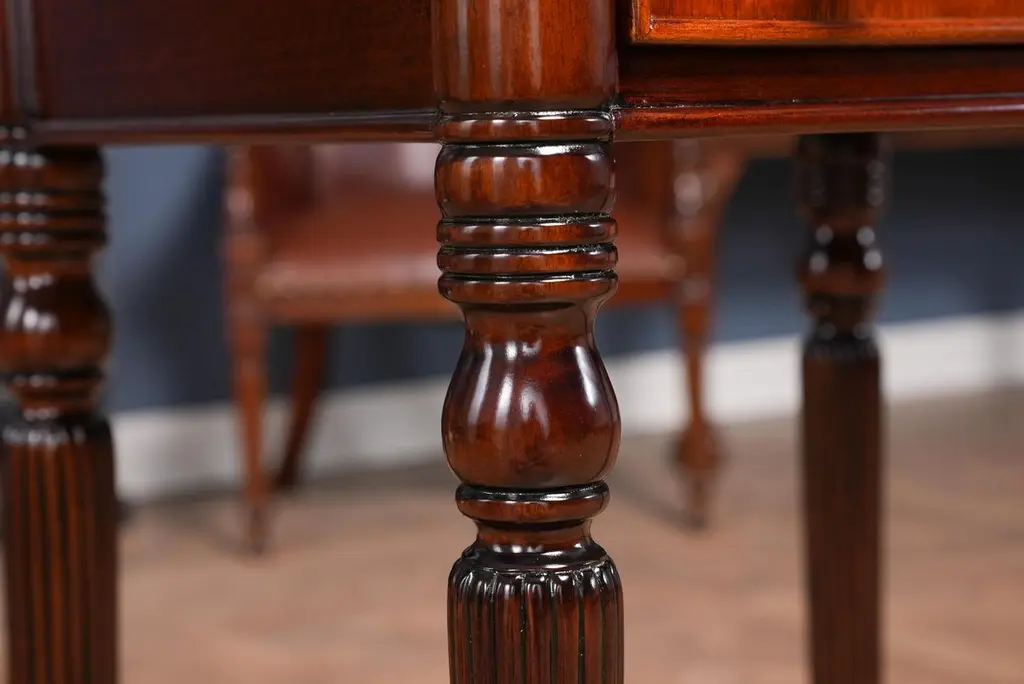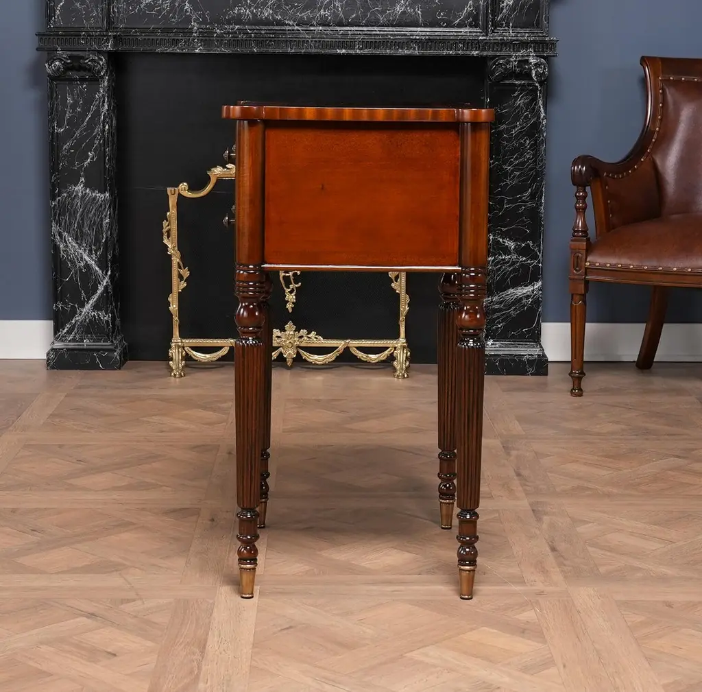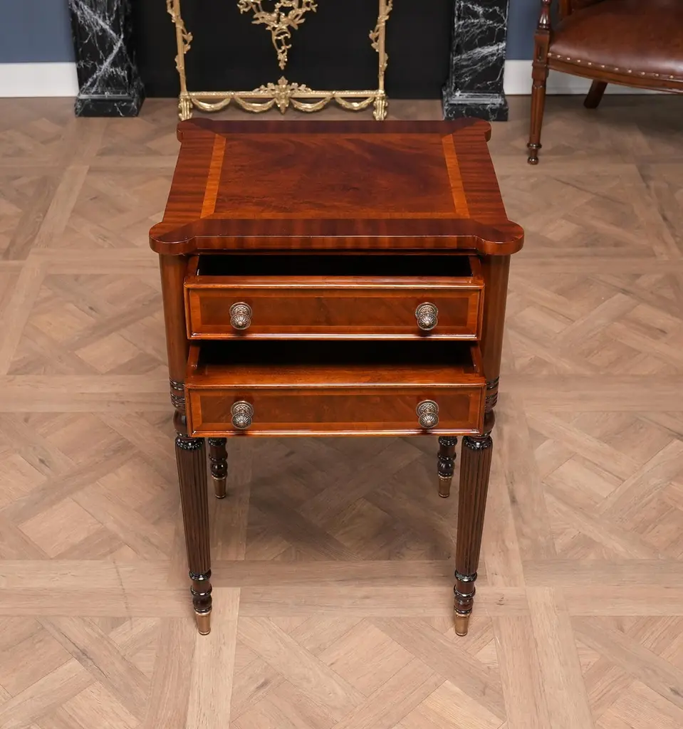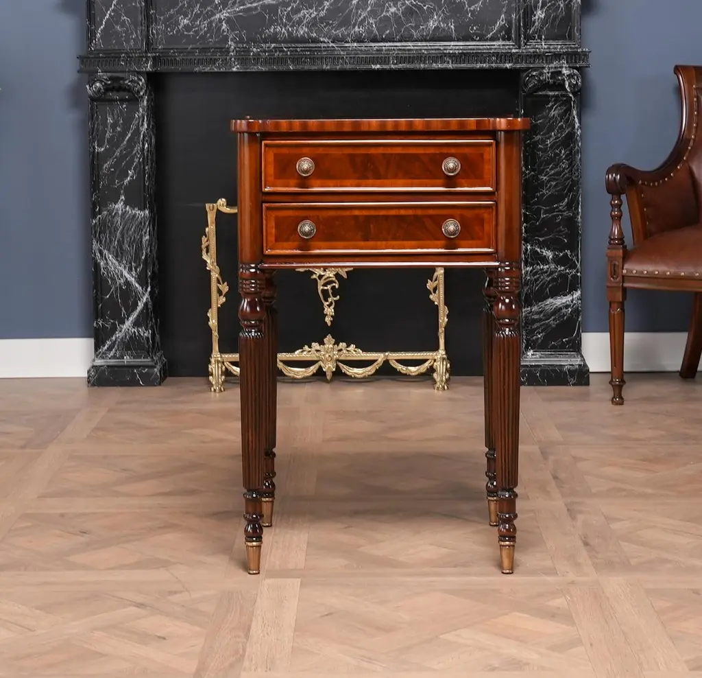 Our Sheraton End Table draws on a design first popularized by Thomas Sheraton whose work as a cabinet maker was very influential in Eighteenth Century England. The Sheraton End Table has become the best selling end table at Niagara Furniture. With it’s interesting and attractive shape the top is further decorated with satinwood and mahogany banding around a figural mahogany field. Similarly decorated the two drawers are dovetailed and feature finely detailed hardware of the finest quality. And all of this is supported on four turned, reeded legs ending in solid brass caps. See the matching console featured below.Also often used as night stands and in small spaces in hallways in the home.Measures 21″w x 17″d x 31″h metric 53 43 79