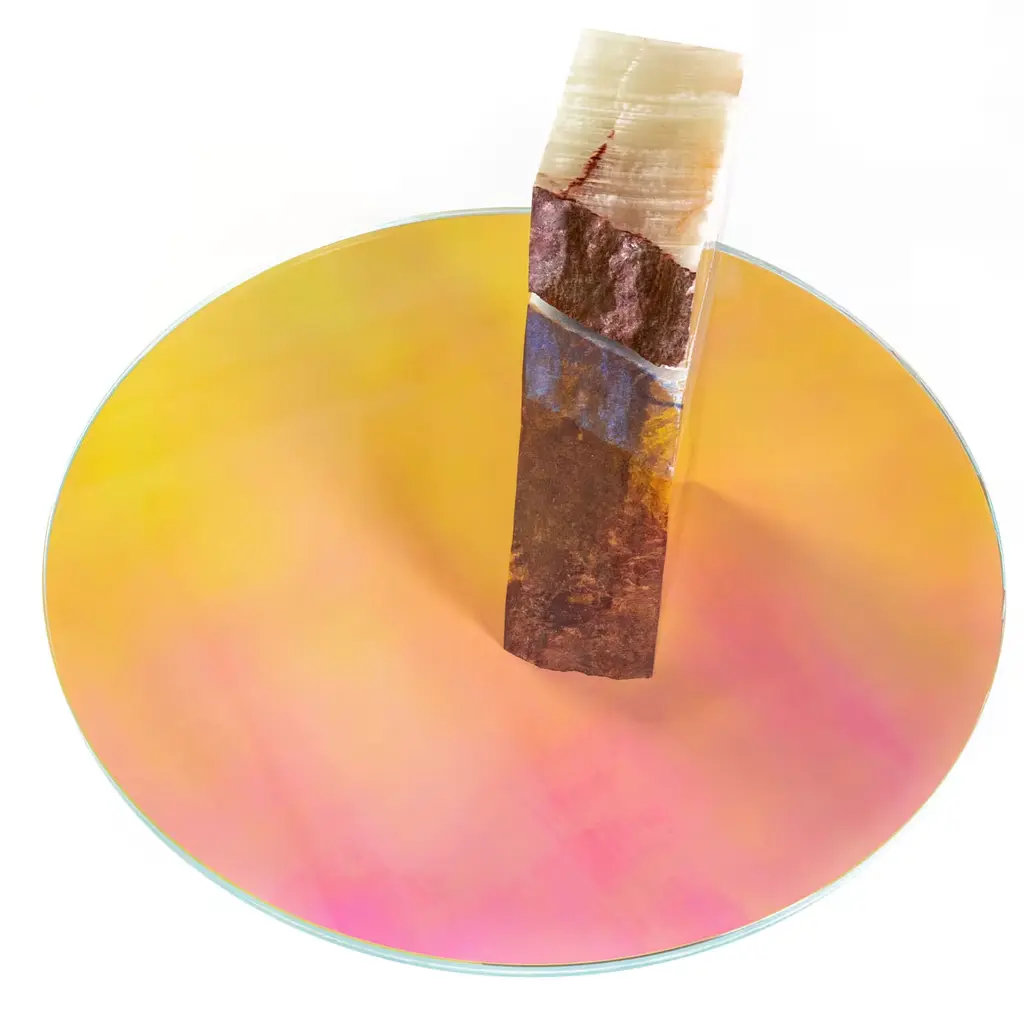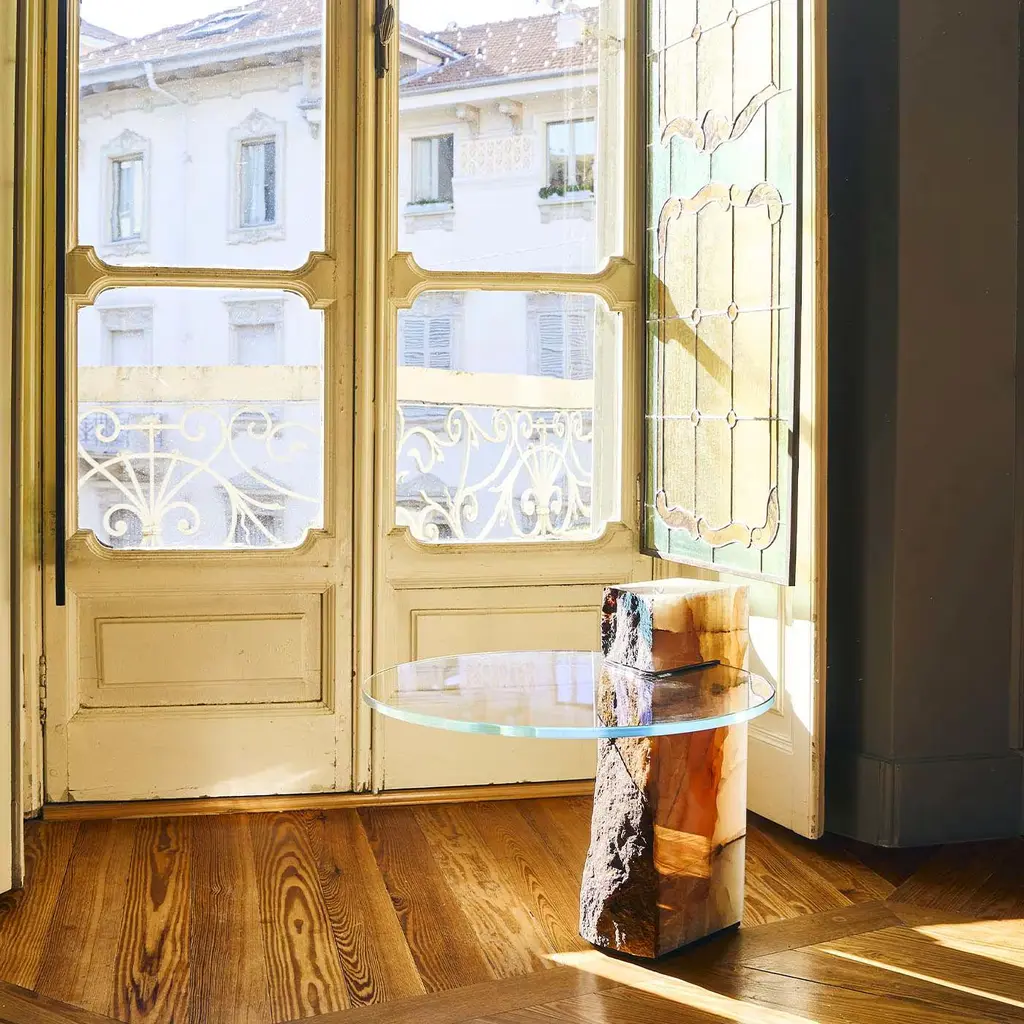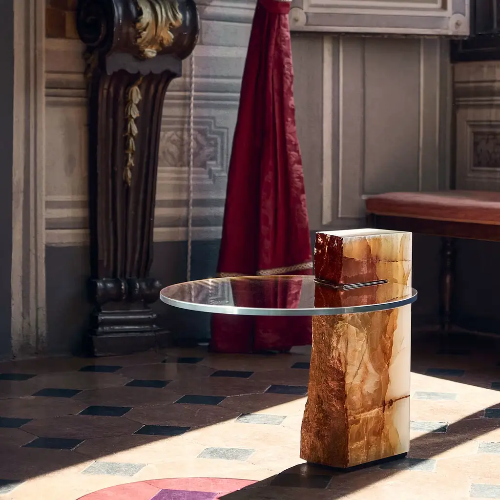 A celebration of exquisite craftsmanship, this side table is a sublime synthesis of prized materials and essential volumes. A 50cm-diameter disc handcrafted of dichroic glass - revealing a triumph of different shades at varying light reflections - is set in a bold body made of prized onyx sourced from the regions of Afghanistan and Iran. Stylish and colorful, it finds ideal positioning in refined contemporary contexts.