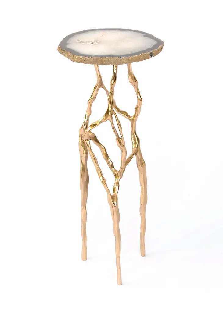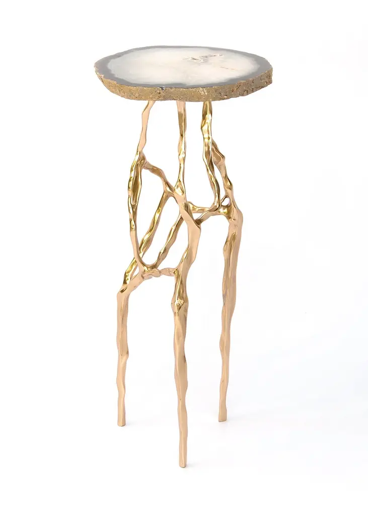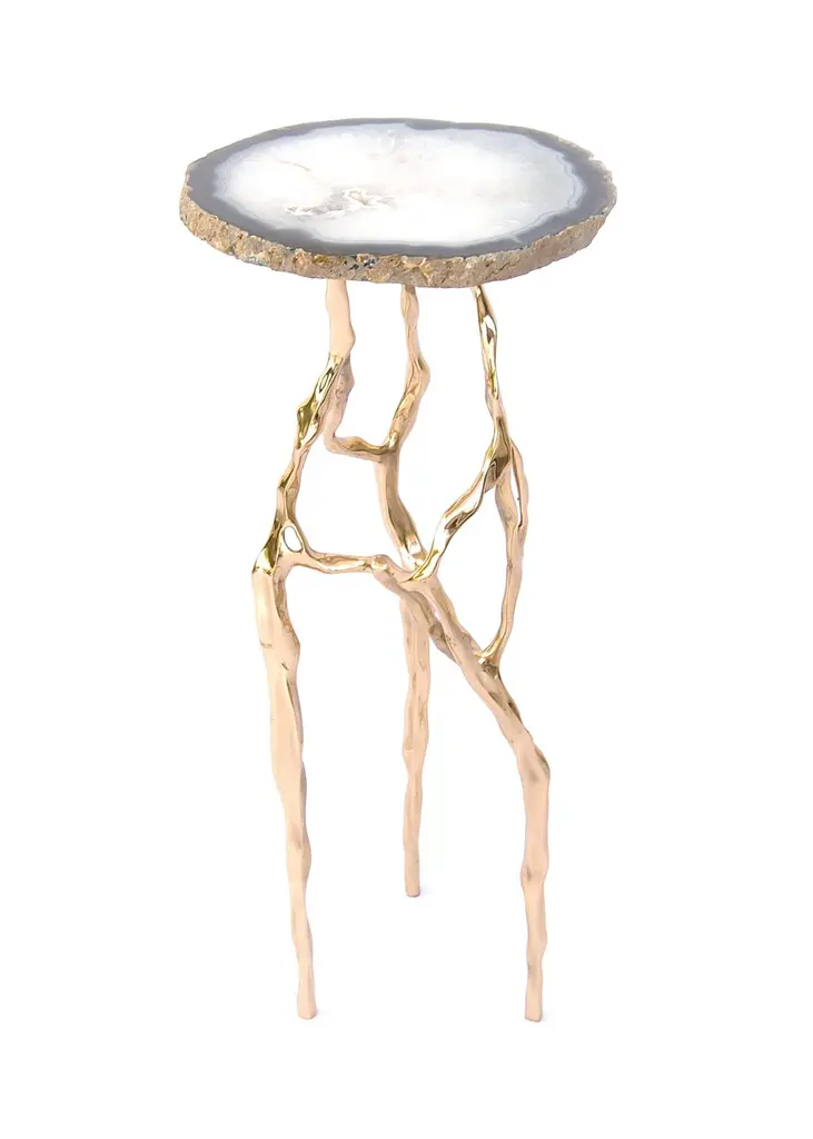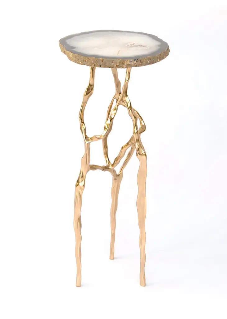 Sid drink table with Agate top by Fakasaka DesignDimensions: W 25 cm, D 25 cm, H 61 cm.Materials: polished bronze base, Agate top. Also available in different table top materials:Nero Marquina Marble Marrom Imperial MarblePedra AgateTranslucent Onyx FAKASAKA is a design company focused on production of high-end furniture, lighting, decorative objects, jewels, and accessories. Established in 2007, Fakasaka is the eponymous design company by Brazilian artist Fernando Akasaka distinguished by a penchant for producing intricate detailed cast bronze collectible design objects, furniture and jewelries. Fakasaka explores the contrast between the manmade and the natural through shapes and finishes that create a clear aesthetic. The constant challenge to balance elements is met with an outcome that is a striking assortment of bronze furniture and objects in oxidised and polished finishes, accented with precious regional stones, granites and rich prehistoric reptilian motifs.