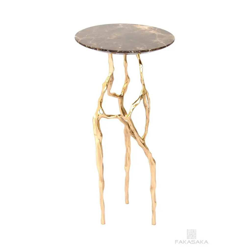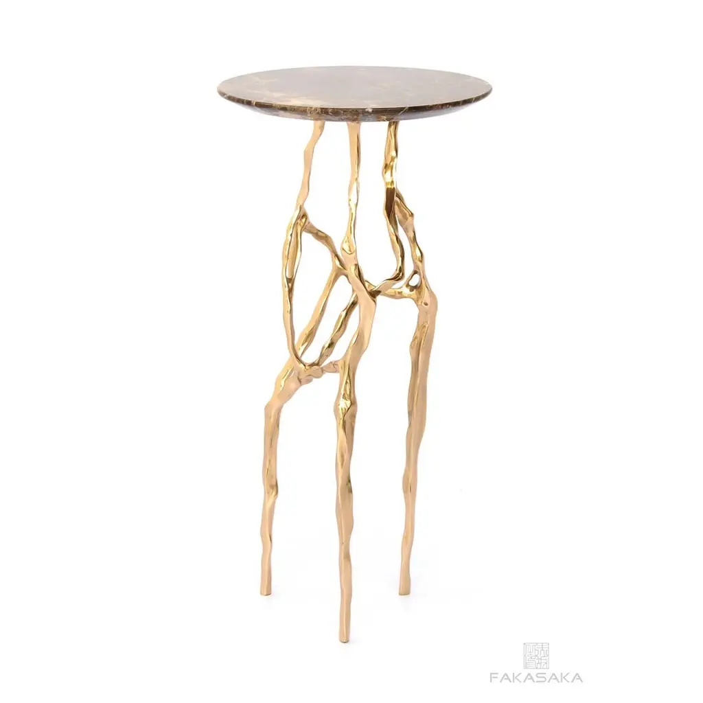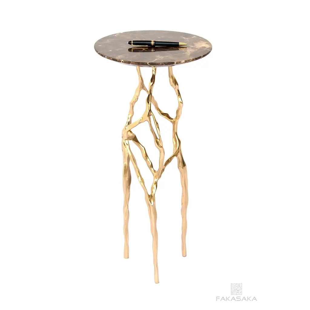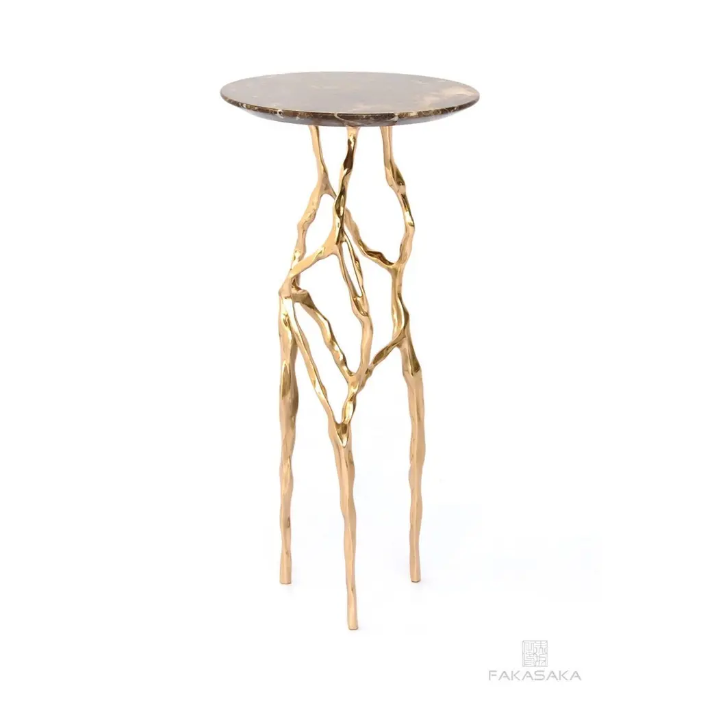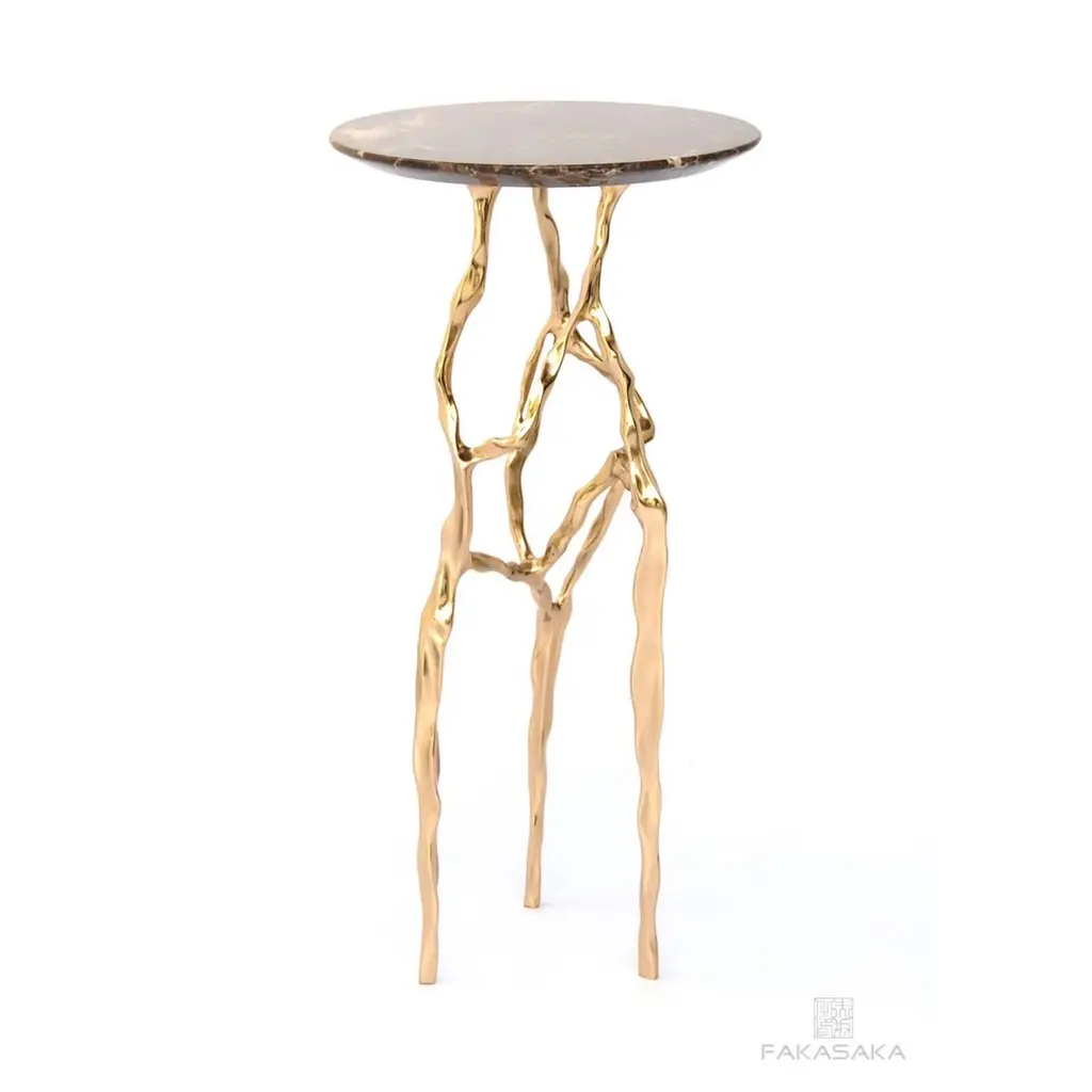 Sid drink table with Marrom Imperial Marble top by Fakasaka Design.Dimensions: W 30 cm, D 30 cm, H 61 cm.Materials: polished bronze base, Marrom Imperial marble top. Also available in different table top materials:Nero Marquina Marble Marrom Imperial MarblePedra AgateTranslucent Onyx Fakasaka is a design company focused on production of high-end furniture, lighting, decorative objects, jewels, and accessories.Established in 2007, Fakasaka is the eponymous design company by Brazilian artist Fernando Akasaka distinguished by a penchant for producing intricate detailed cast bronze collectible design objects, furniture and jewelries. Fakasaka explores the contrast between the manmade and the natural through shapes and finishes that create a clear aesthetic. The constant challenge to balance elements is met with an outcome that is a striking assortment of bronze furniture and objects in oxidised and polished finishes, accented with precious regional stones, granites and rich prehistoric reptilian motifs.