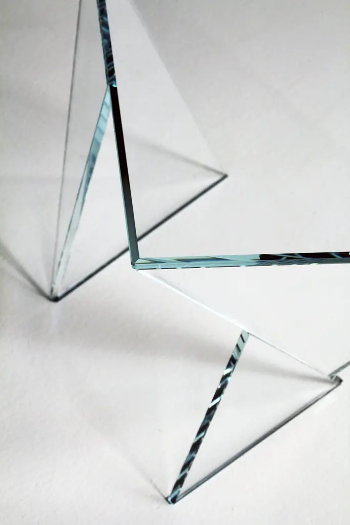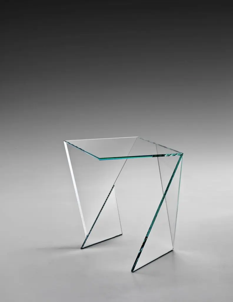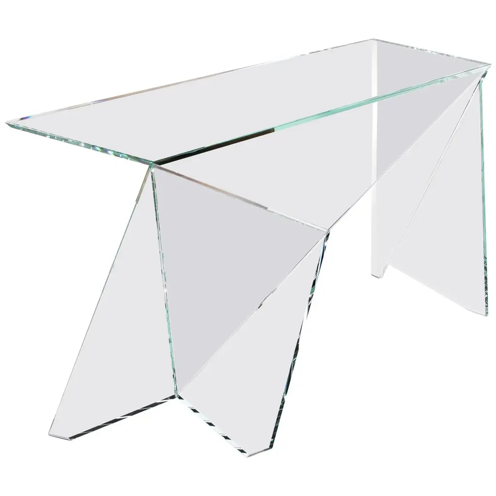 The side table 'Origami Calcio' is made of extra-clear crystal glass. Each sheet of extra-clear crystal glass is cut and ground with extreme precision, then the sheets are assembled by hand, having to fit together perfectly, the gluing operation requires extreme precision and experience. The final result is spectacular, the sloping edges of the glass create wonderful reflections and crystalline transparencies.Side table dimension: W 55 x D 40 x H 50 cm. Dimensions are customizable.Limited Edition of 24.Each table is hand signed by the artists (engraved), 100% handmade in Italy and comes with a “Certificate of Authenticity”.The inspiration for origami came from the observation of a simple piece of paper which, being folded a few times according to an antique Japanese technique, transforms into complex and delicate figures of innate fascination and beauty: The origami.The idea starts off with the concept of taking advantage of the resistance of glass appreciating its optical lightness with the intent to unveil the similarity between the complex art of origami and the workmanship of glass showing its magic transparency.Both, paper with its light sense of touch and opacity and glass with its physical heaviness and transparency present contrary features but have also a strong attribute in common: The concept of lightness. The tables origami were created as a result of this theory.The artworks by Barberini & Gunnell are regularly shown at international art fairs, such as PAD London, PAD Genève, PAD Monaco, Salon Art + Design New York, ArtMiami.IMPORTANT INFORMATION REGARDING SHIPPING:Please contact us for an independent shipping quote as we provide high quality shipping at competitive prices due to our frequency of shipping, relations with international shipping companies and the possibility to organize directly from Italy.We take care of the entire customs procedure and paperwork. On request we organize a white glove delivery and installation of the artwork inside of the property of the client. All shipments are ALL-RISK insured.We carefully pack all artworks in strong wooden crates to ensure safe transport. This service is done directly in our atelier and is complimentary. All of our artworks travel with a shock watch system in order to monitorate rough handling by shippers and movers.