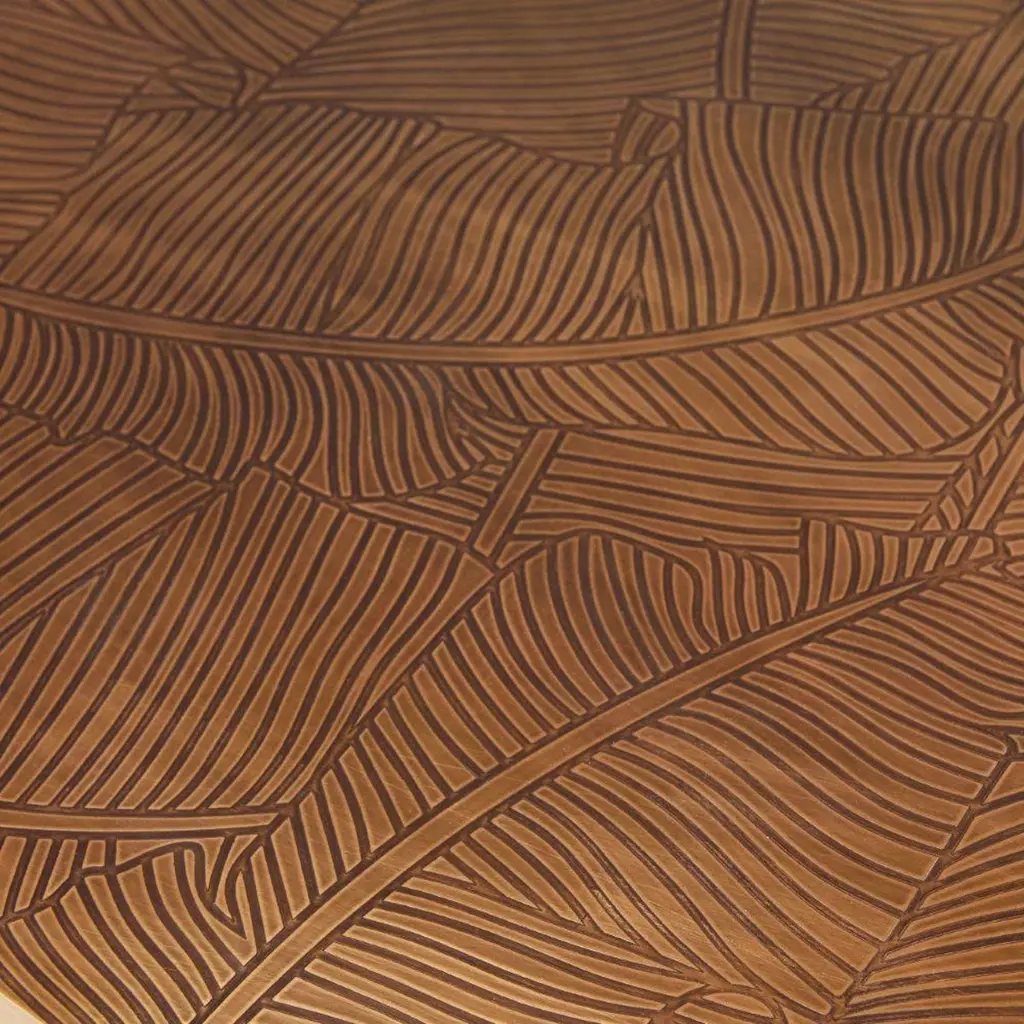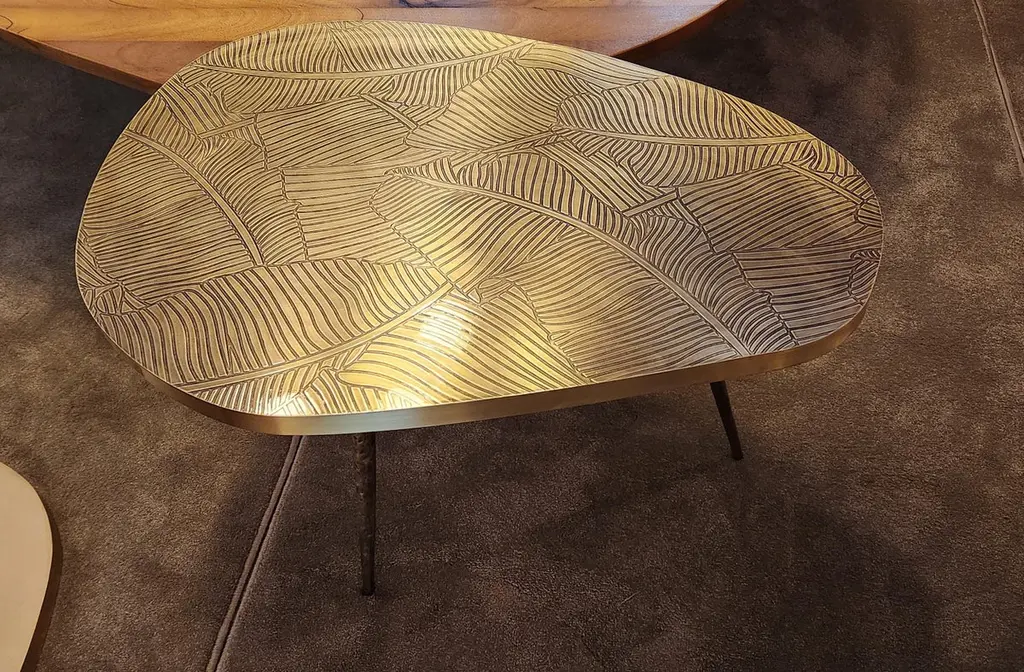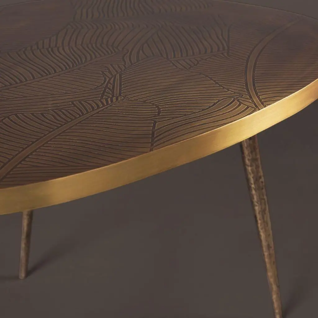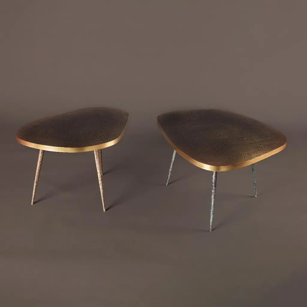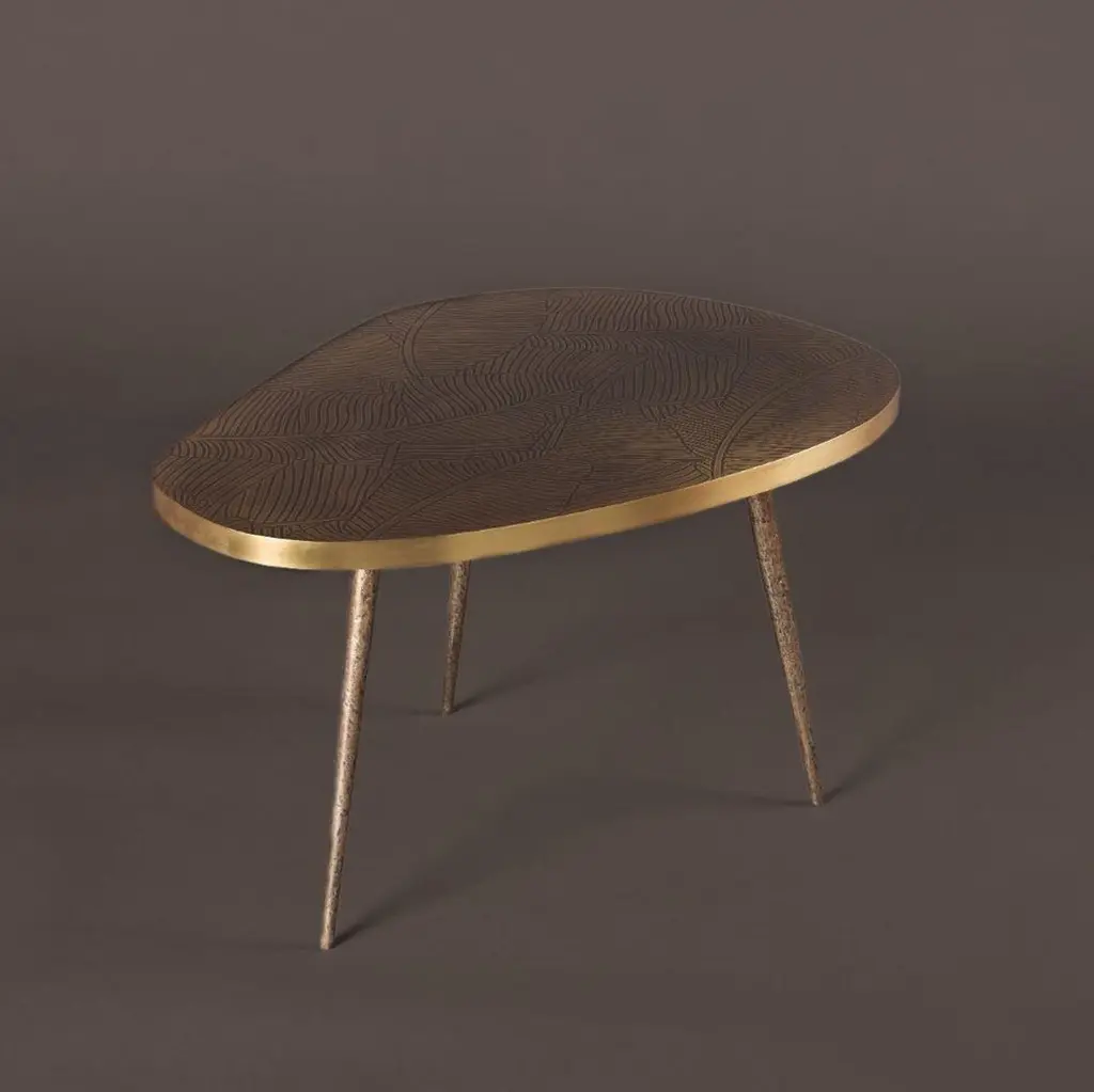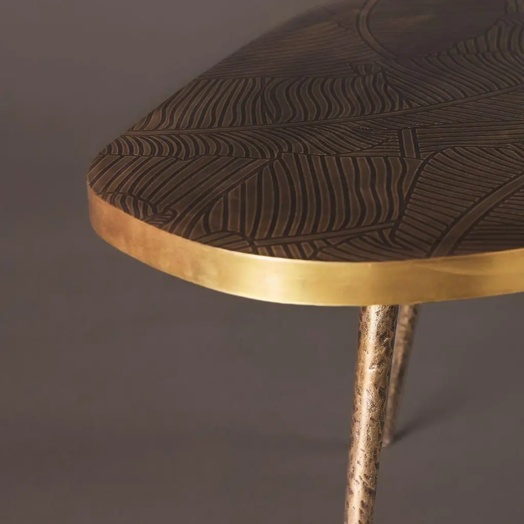 The Earth Prints 8 side table features an asymmetrical top made of solid brass, hand-engraved in our workshop. The surface displays a flowing botanical pattern composed of interlacing lines, offering a rich, organic visual rhythm. A slightly beveled edge enhances the warm tones of the aged brass finish.Supported by three legs cast in solid brass, this side table balances visual lightness with structural stability. Each leg is hand-patinated and retains a raw, textured surface that contrasts subtly with the refined engraving of the top. The piece highlights the craftsmanship of traditional metalwork.With dimensions of 77 cm in length, 55 cm in width, and 45 cm in height, the Earth Prints 8 side table can be displayed alone or paired with the larger Earth Prints 9 model (90 x 65 x 45 cm). Both tables share the same materials and finishes and can be combined to form a harmonious set with contrasting scale and proportion.