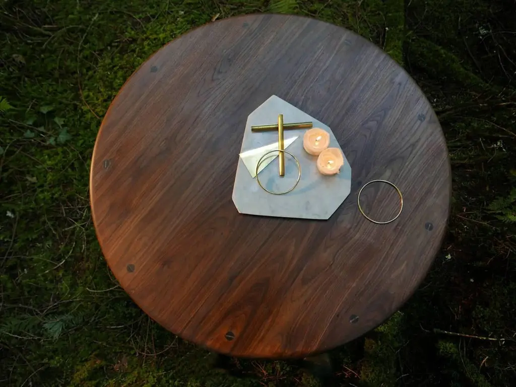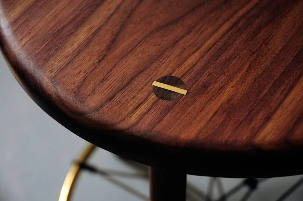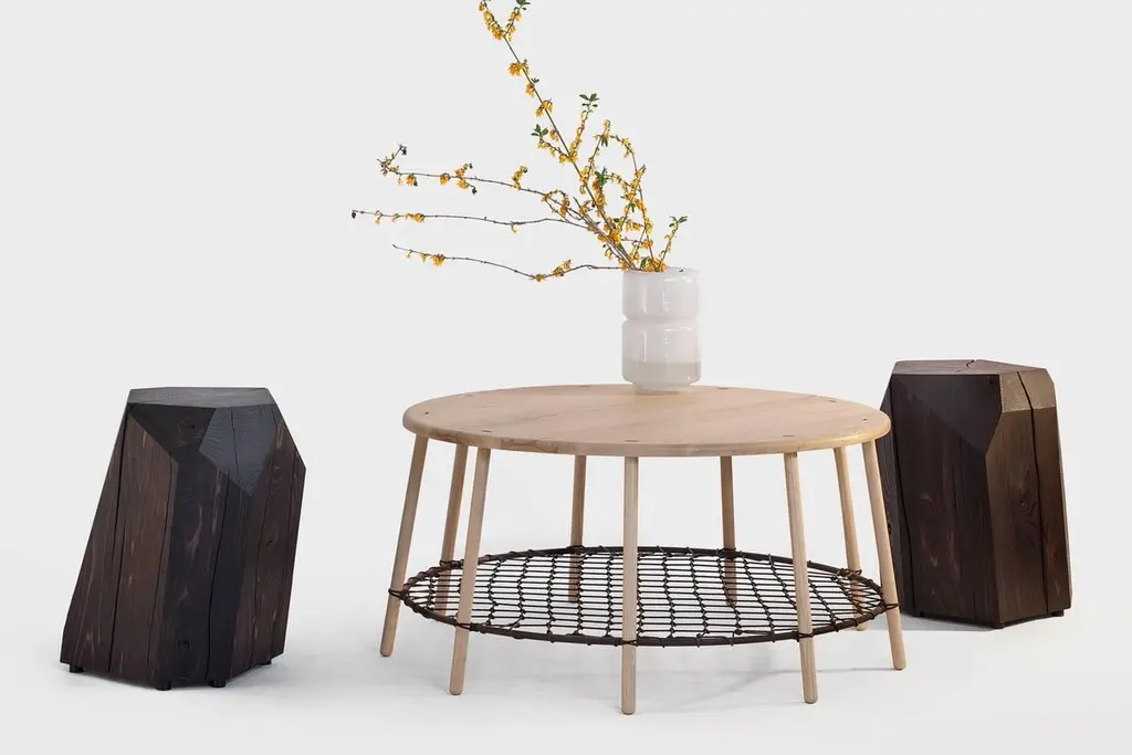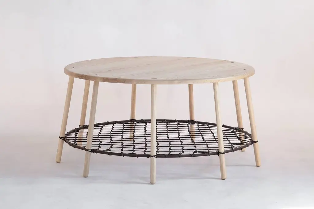 Hand Carved White Ash Stool with Copper Plated Ring SupportA place where the forest meets the sea, the 'Findhorn' collection of tables and stools contain details from both. Through-tenons exposed on the tables top are glued and set with metal wedges like an axe's handle to its head, while the rope work below nods to a mariner's craft. Cross lashing helps to hold the legs to the support ring as well as providing a handsome detail. These nautical-themed stools and tables are available in various combinations of finishes and sizes.The side table is sold as an individual piece. Shown in main image is a 24" W x 18" H side table in solid American walnut with a blackened steel support ring and black nylon seine netting. The table is available in Canadian white ash and other sizes, which include a 14" stool/occasional table and a larger 36" coffee table, with or without netting. See Hinterland Design's other 1stDibs listings for other finish and size options.Customization and finish options available are:— Solid Canadian white ash and American black walnut— Satin plated brass, blackened steel and powder coated steel— Seine netting and hand tied waxed nylon cord (add $250) Hinterland designs and manufactures each of their pieces in its Vancouver, Canada workshop and showroom.
