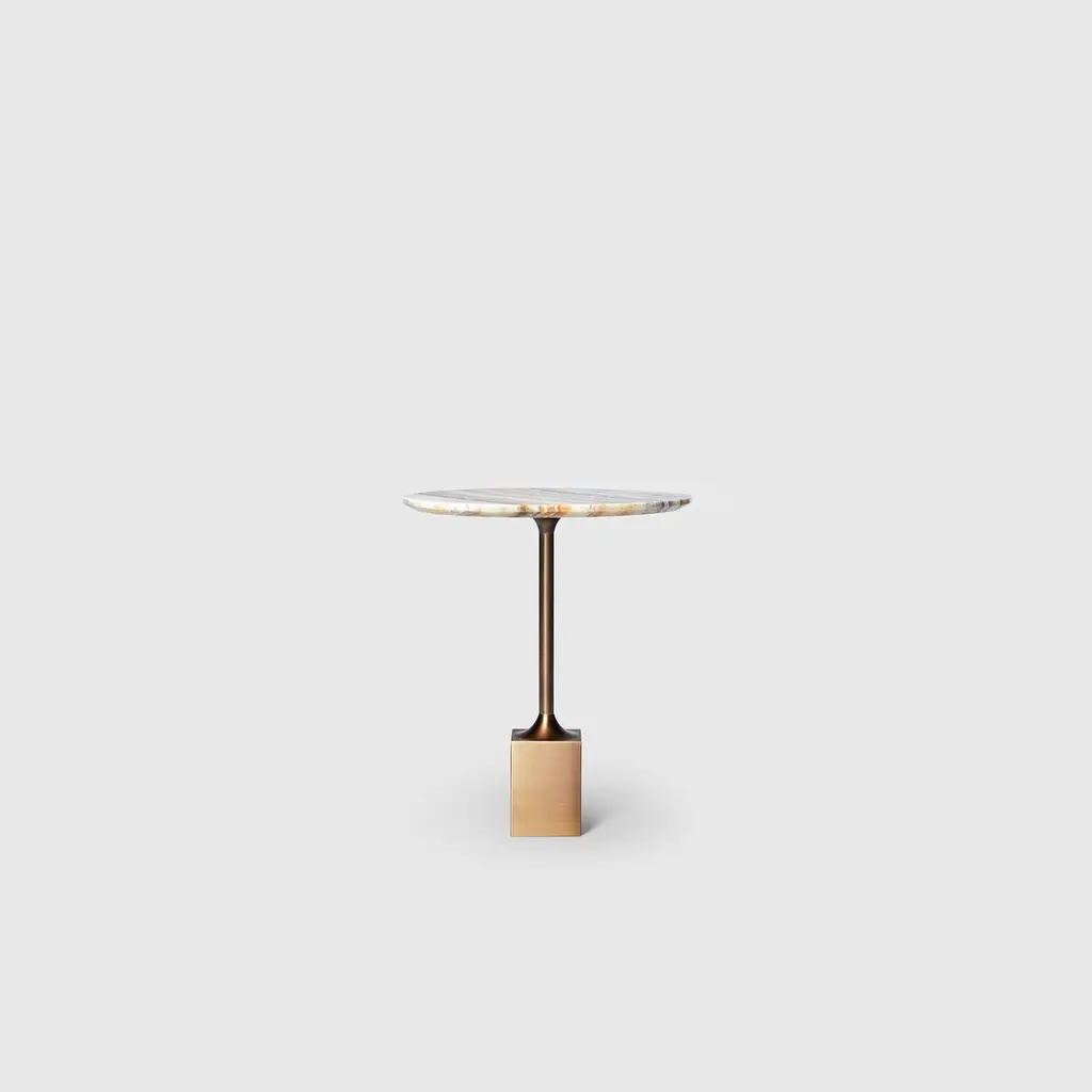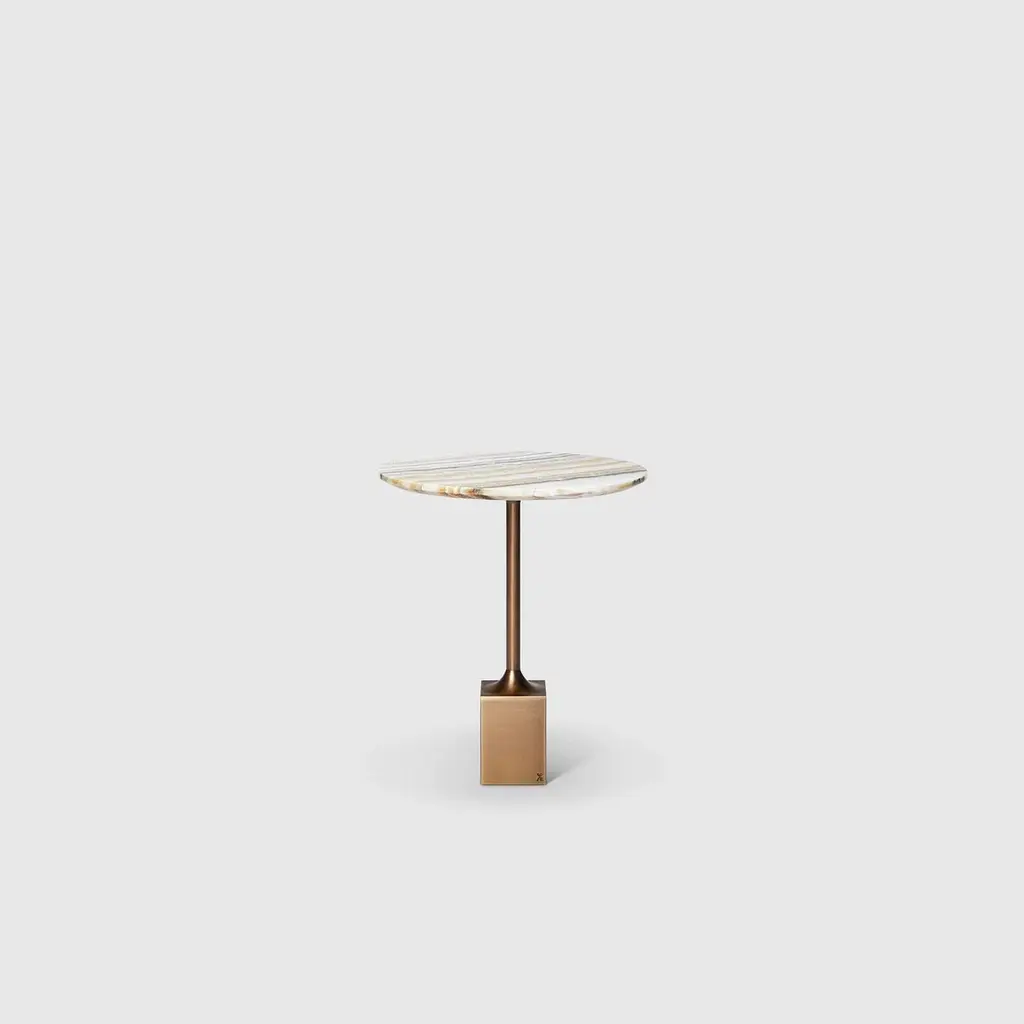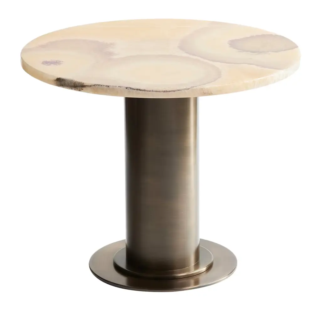 Side Table 'Madison Avenue' by Man of Parts Signed by Yabu Pushelberg Pakistani onyx table topBrushed brass table base Dimensions: H. 47 x D. 40.5 cm_____________________The Madison Avenue side table is a stylish place for a cocktail on or off-hours. Its design is inspired by the famous Madison Avenue. Hosting the world’s top fashion brands and famous as the nexus of Mad Men and the advertising industry, Madison Avenue has long been synonymous with style. Man of Parts is a Canadian based design studio offering contemporary furniture and lighting. Born from the vision of German collector and travel enthusiast Stephan Weishaupt, this truly modern studio embodies a post-national perspective. Man of Parts creations are European-made and inspired from around the world. Their collections are thought through to the smallest detail, whether it's an armchair in Italian fabric, a wooden chair from Germany or an occasional table. Beyond the design of quality designer furniture, Man of Parts conveys a borderless way of life that is undeniably elegant. The contrasting elements and clean, organic lines of Man of Parts pieces are sure to add a subtle touch to any interior.