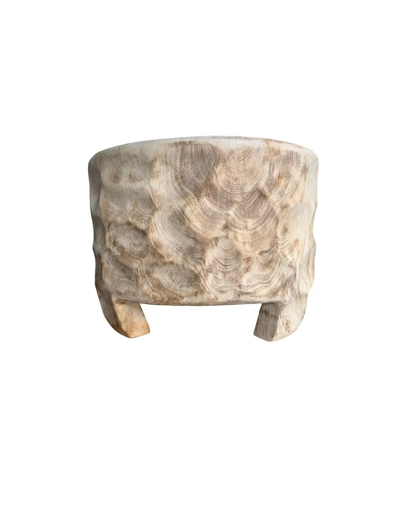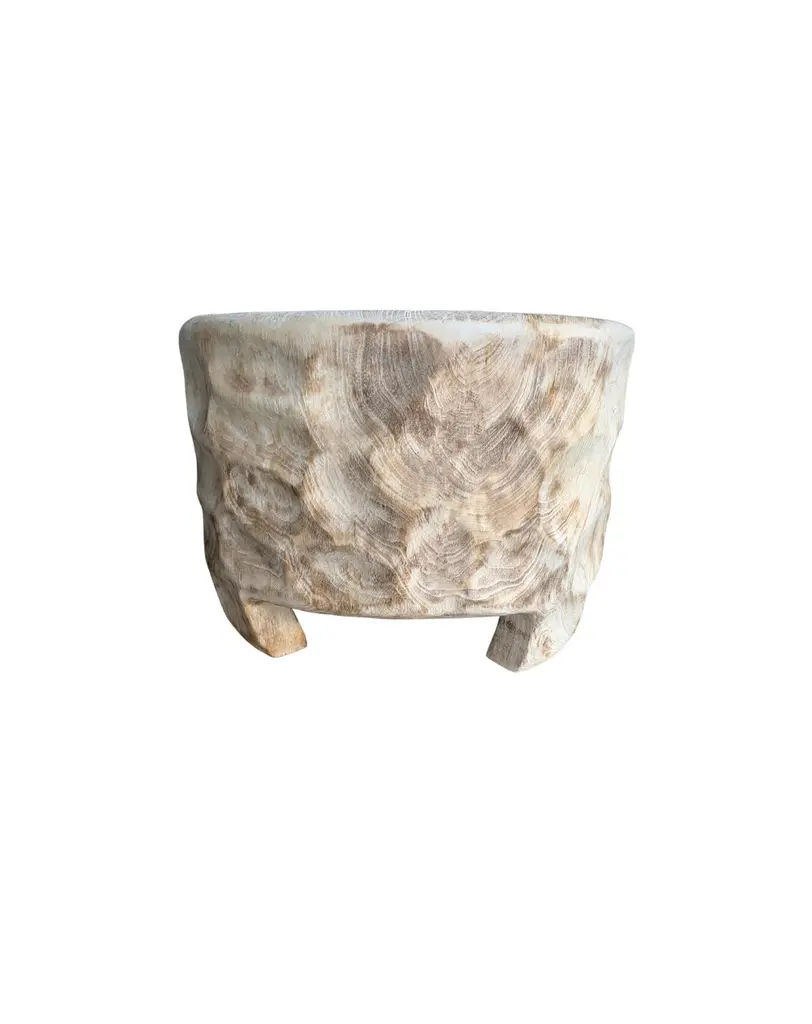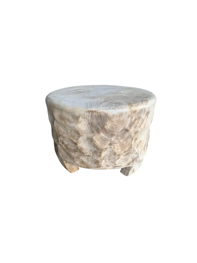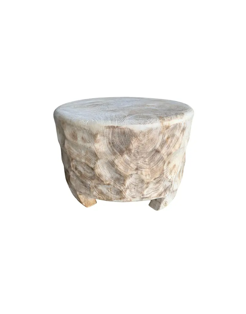This wonderfully sculptural round side table features a hand-hewn detailing along its sides. The table's neutral pigment makes it perfect for any space It was crafted from a solid block of mango wood. It features a bleached finish to achieve its white colour. The table is elevated on 4 shallow legs.