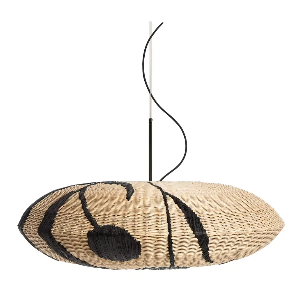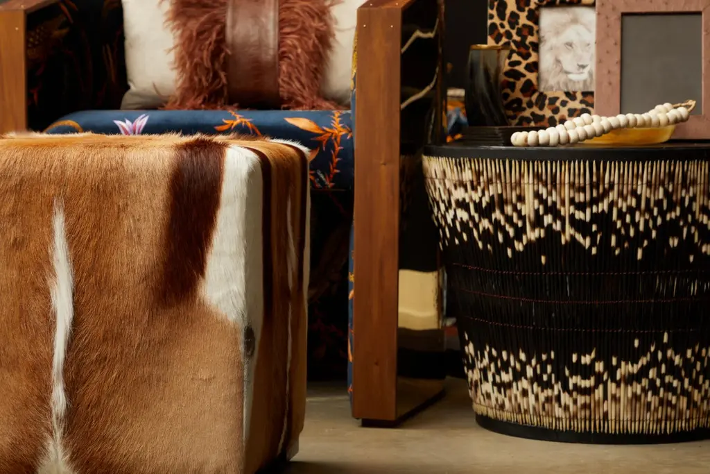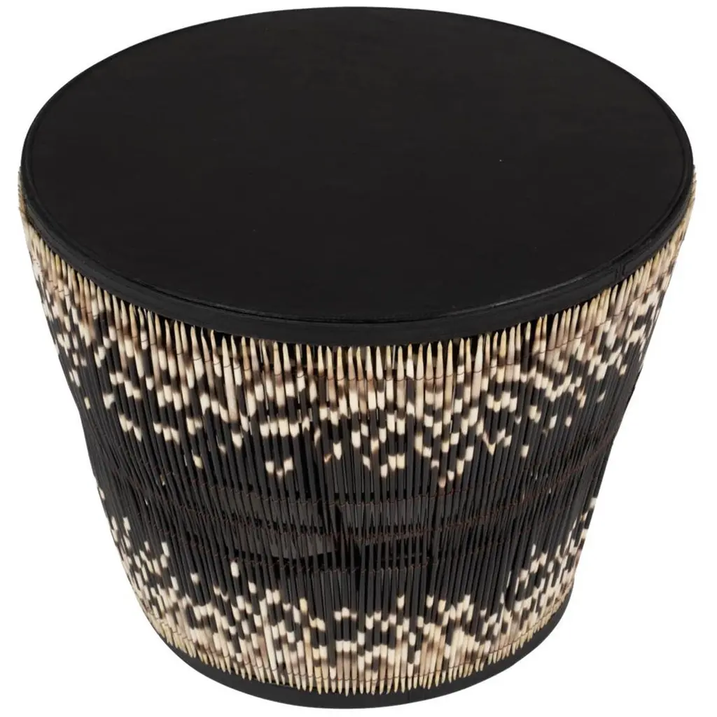 Unique and exciting, this side table is handcrafted of powder-coated metal with genuine porcupine quill. Humanely gathered, the quills form a stunning exterior to the table, with two rows secured into a beguiling pattern allowing the natural color variations to create an organic feel. Porcupine Quill Tables are from the Northern Cape Province of South Africa.The quills are bound with copper wire. The top of the table is treated leather dyed a beautiful black. PRODUCT INFORMATIONDIMENSIONS: [22" diameter x 16.5" diameter] x 18" heightCOLOR: Natural / BlackMADE OF: Powder Coated Metal / Genuine Porcupine Quill / Copper / LeatherMADE IN: Cape Town, South Africa.