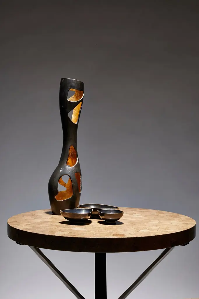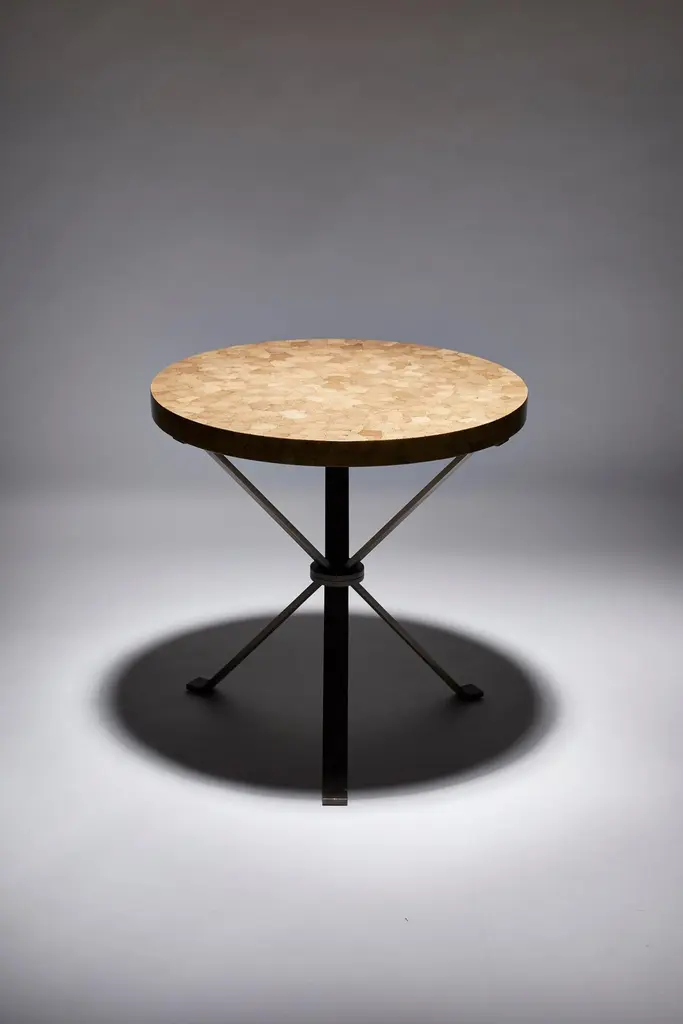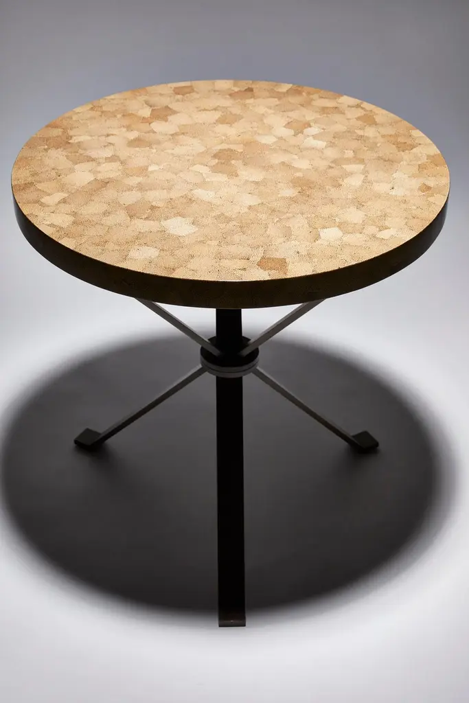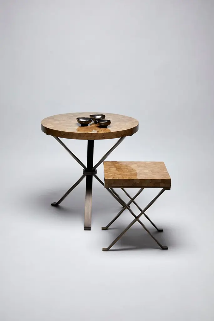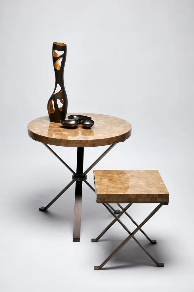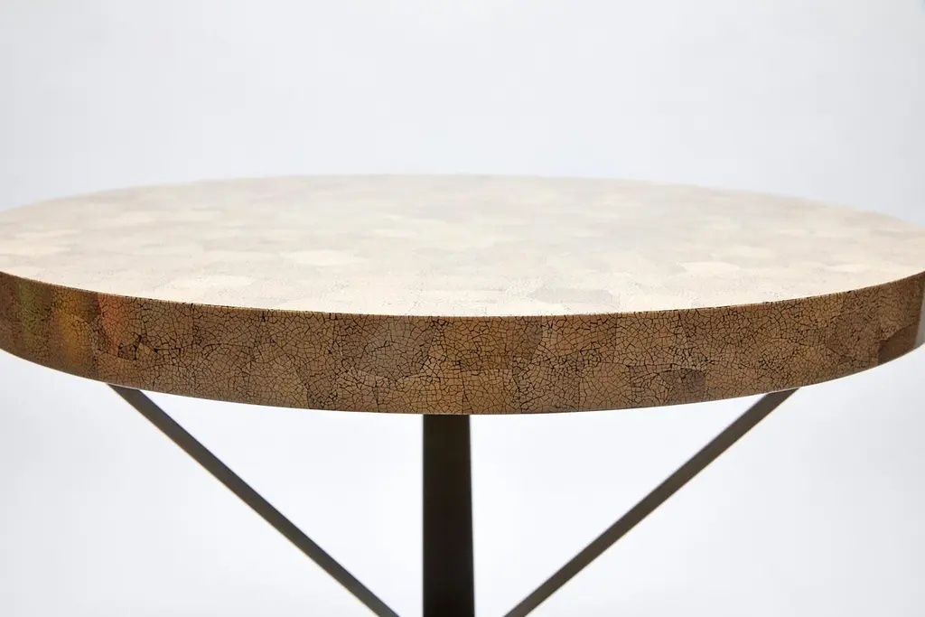 Cette table d’appoint aux lignes classique puise son originalité dans l’association des matériaux. Son plateau en coquille d’œuf fait main, écho aux influences asiatiques du designer, ainsi que son pied en acier piétement en bronze patiné main en font une pièce de design minimaliste et élégante.Table d’appointStructure en Bronze et Plateau en Coquilles d’œufs brunesNotes : La coquille d’œuf utilisée pour la TABLE UMA est une matière précieuse et raffinée. Il s’agit véritablement de la coquille des oeufs de cane, qui permet d’obtenir des blancs craquelés d’un effet très subtil et spectaculaire. Après avoir été lavée, puis débarrassée des peaux internes, la coquille est écrasée délicatement, puis tamisée afin d’utiliser les fragments en fonction de leur taille. Chacune de ces infimes particules est ensuite posée, à l’aide d’une pince, sur une couche de laque fraîche, en les plaçant bord à bord comme une mosaïque et en les disposant selon le dessin projeté. Elles sont ensuite poncées, et laquées afin d’obtenir une surface lisse. Puis elles sont noyées dans une nouvelle couche de laque transparente afin de remplir les interstices. Selon l’effet recherché, la laque de couverture (ou celle dans laquelle la coquille d’œuf est noyée) peut-être ambrée ou noire, ce qui donne également de très belles nuances. Concernant la coquille d’œufs brune elle est issue d’un procédé de torréfaction et non due à l’application d’une laque.Ce produit est fabriqué à la main. Chaque pièce est unique, elle peut légèrement varier en couleur d’un objet à l’autre. C’est ce qui lui confère son caractère fait main.