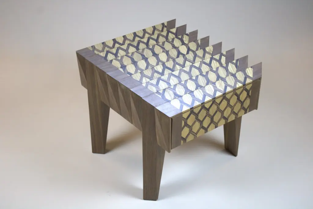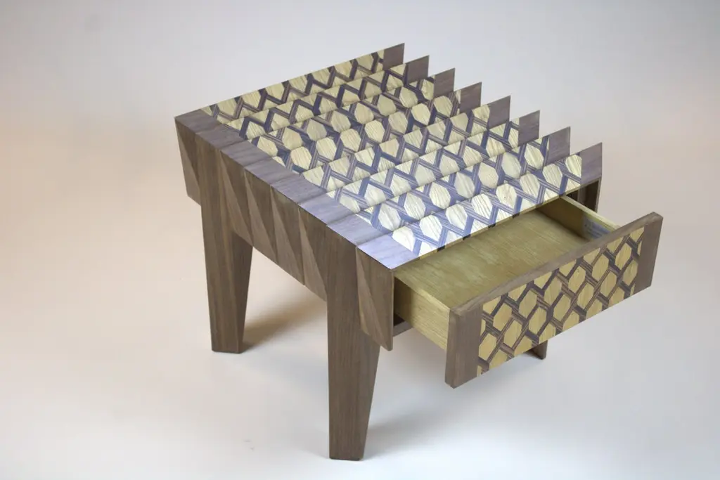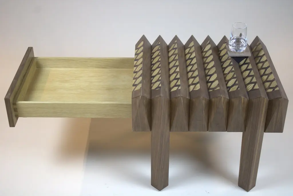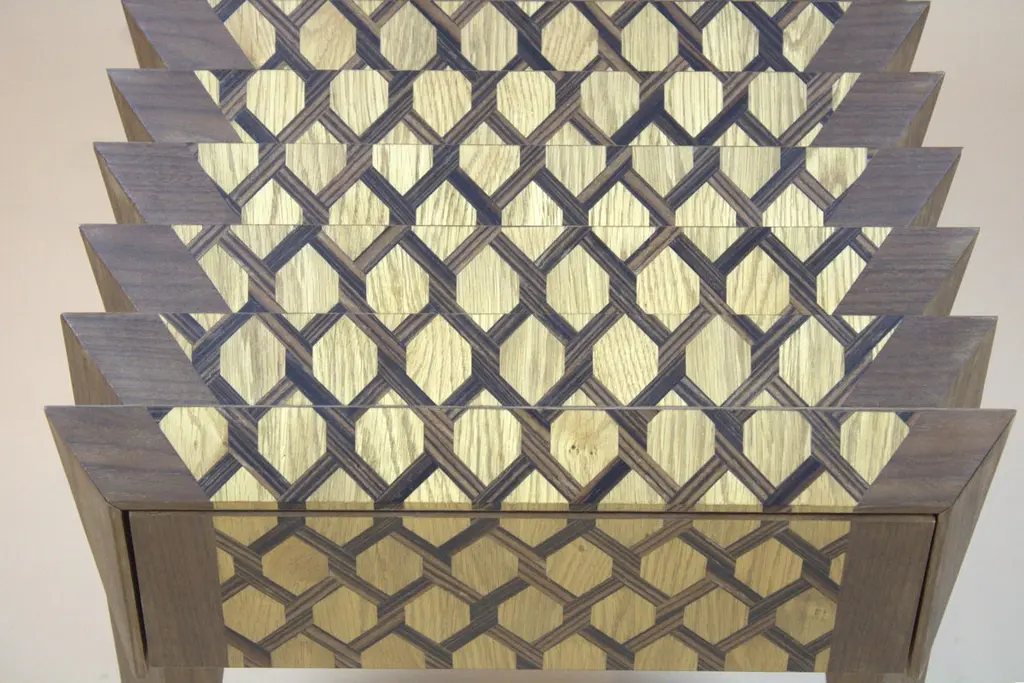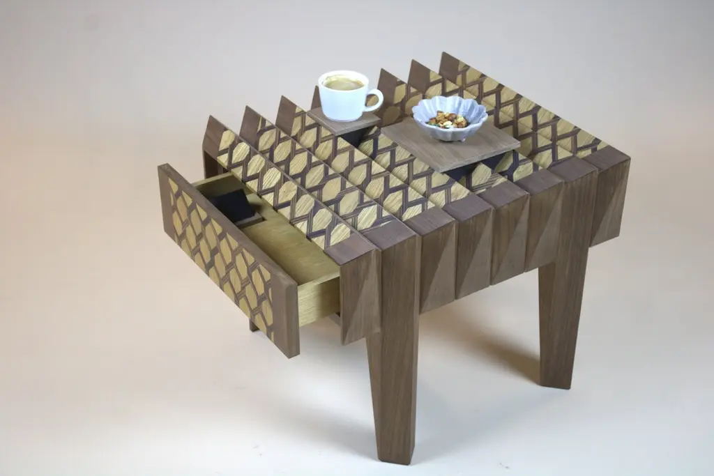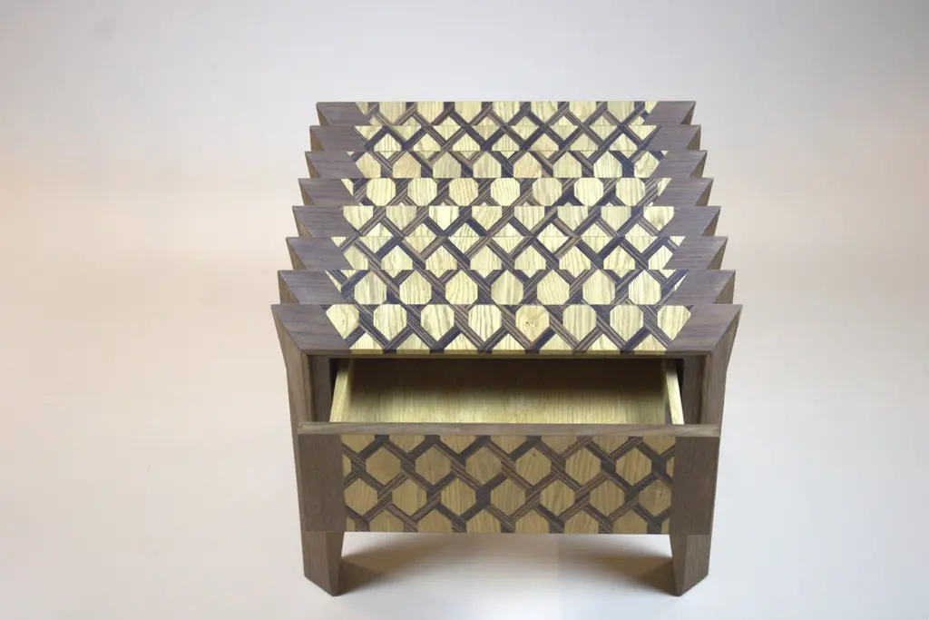 The side table which consists of a top of triangles. If you look over the table on the short sides, you will see a braided pattern. The design is inspired by Escher's patterns. This piece is designed and made in The Netherlands. The table consists largely of veneer Walnut. It is all made of wood. All patterns are hand-pasted and cut into pieces. The patterns are made of different kinds of wood. The drawers consist of solid Walnut with a dovetail connection. There are 2 drawers in this piece of furniture, on the end sides you can find the drawers with push-to-open mechanism.The following types of wood are used in this furniture: American Walnut, Oak and Ebbe.