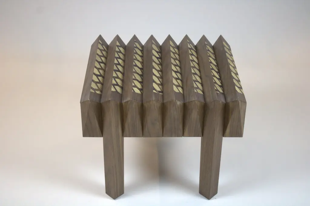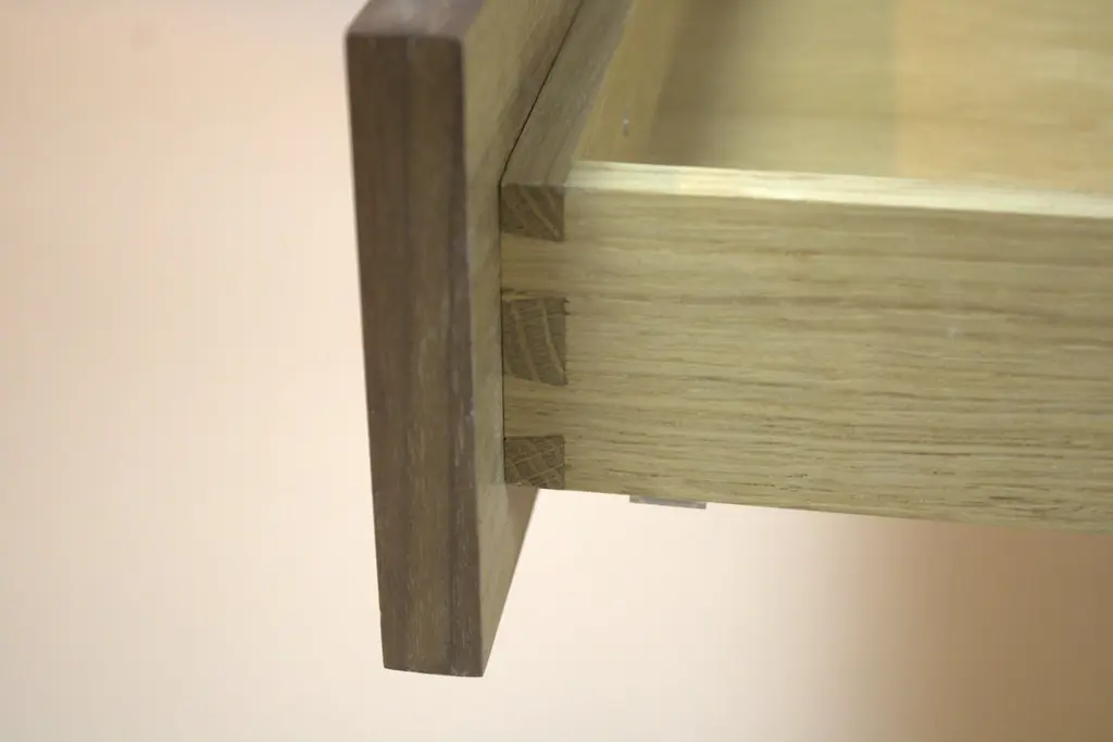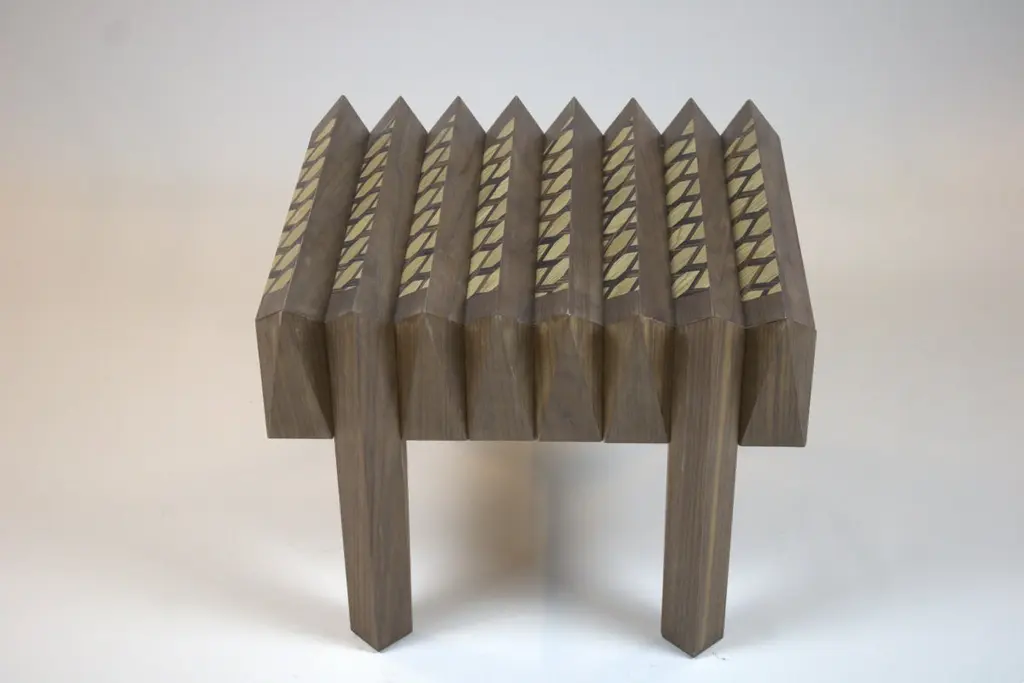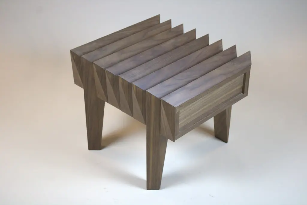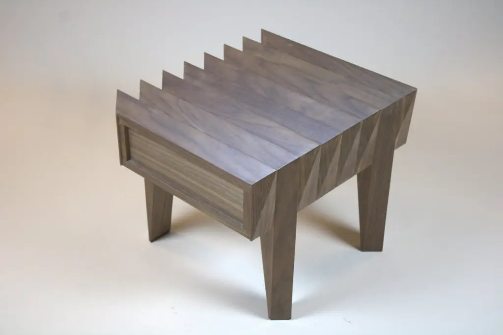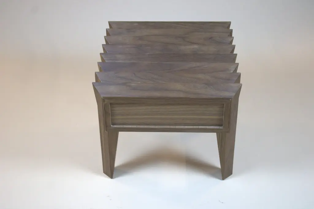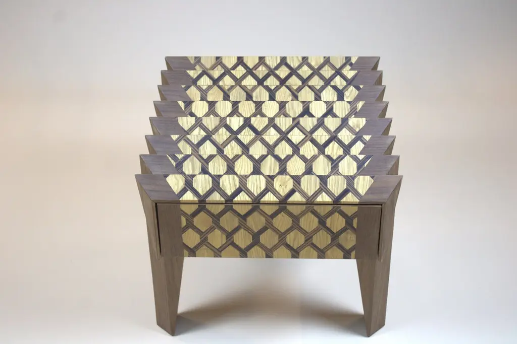 The side table which consists of a top of triangles. If you look over the table on the short sides, you will see a braided pattern. The design is inspired by Escher's patterns. This piece is designed and made in The Netherlands. The table consists largely of veneer Walnut. It is all made of wood. All patterns are hand-pasted and cut into pieces. The patterns are made of different kinds of wood. The drawers consist of solid Walnut with a dovetail connection. There are 2 drawers in this piece of furniture, on the end sides you can find the drawers with push-to-open mechanism.The following types of wood are used in this furniture: American Walnut, Oak and Ebbe.