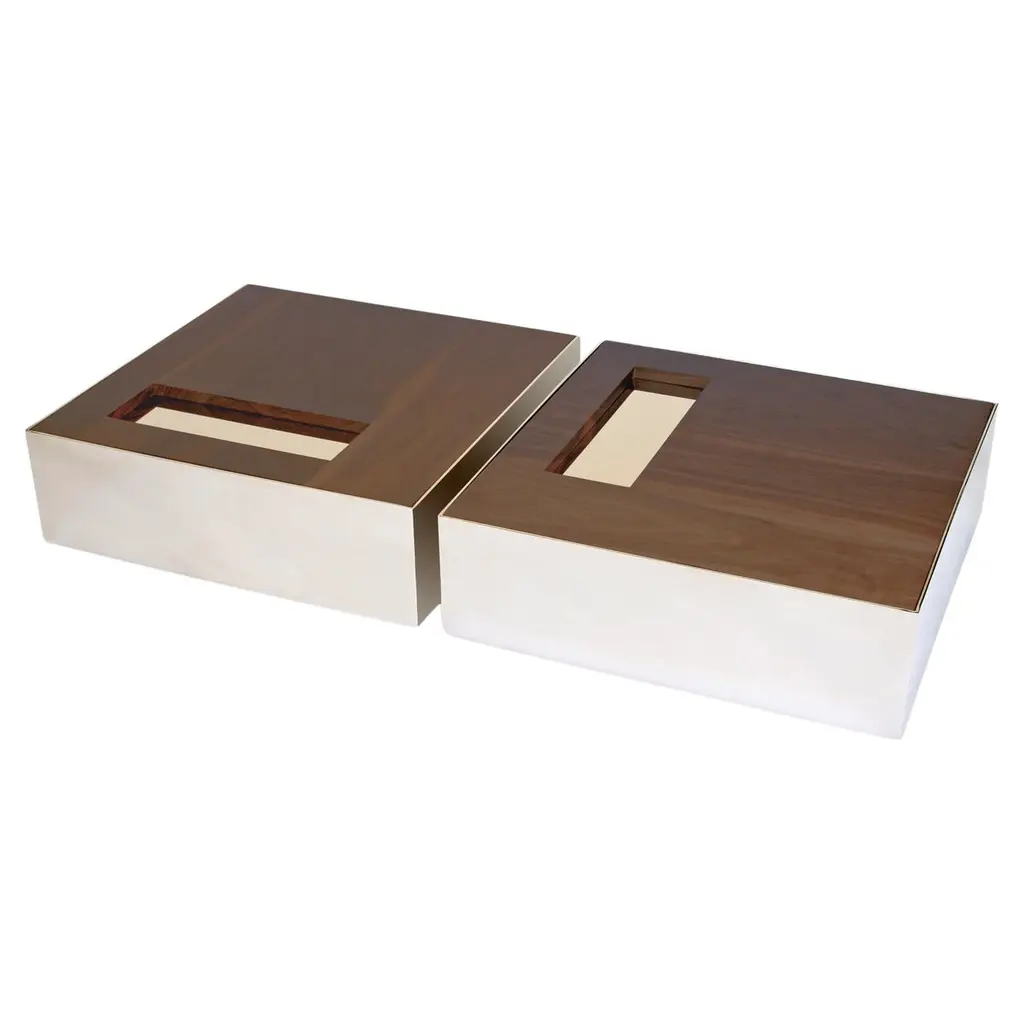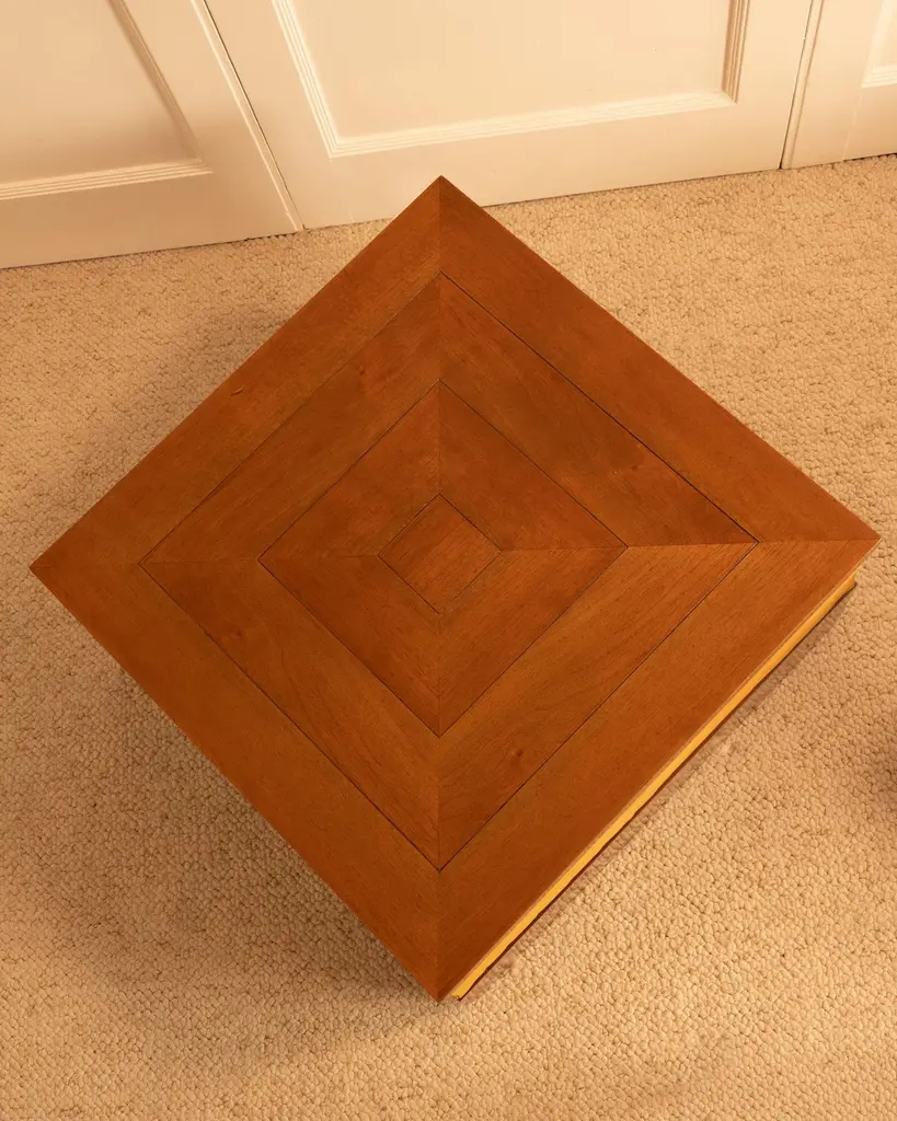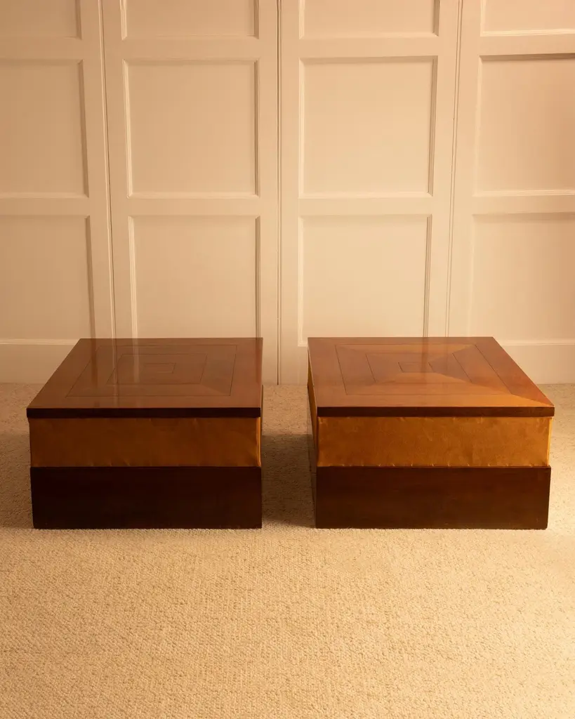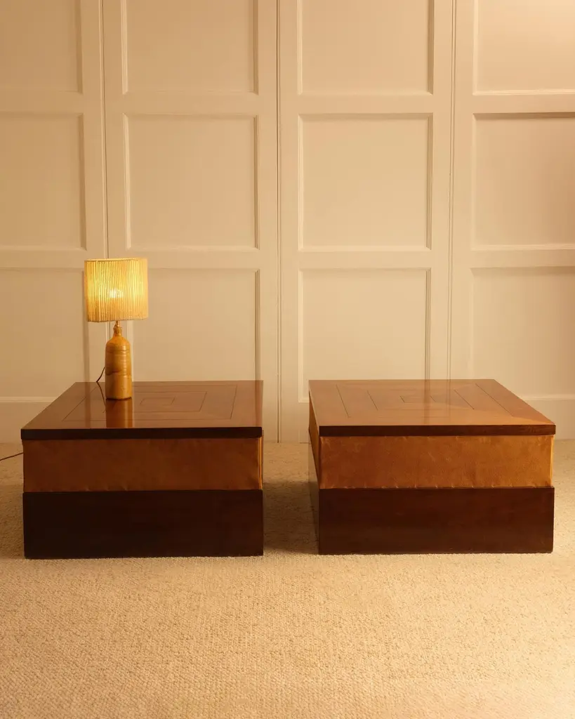 Pair of large side tables by Paolo Buffa - Italy, 1940sEach table features a geometric design on the top. The edges are reupholstered with fawn-colored suede.These tables can be used as end tables, coffee tables, or side tables.