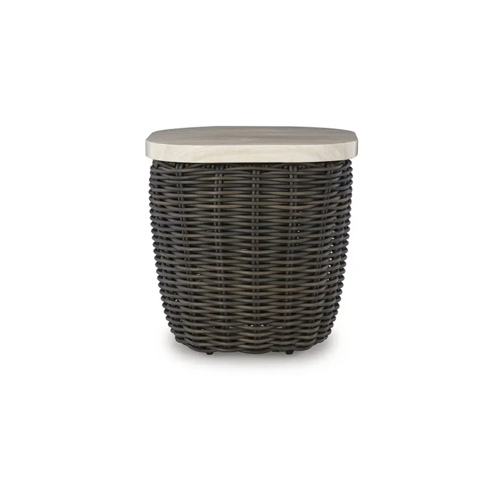 Bring resort-style elegance to your outdoor oasis with this expertly crafted wicker end table. Hand-woven all-weather resin wicker creates an intricate textural masterpiece, while the stunning marble-look aluminum top adds a touch of sophisticated luxury. This versatile piece seamlessly blends timeless design with modern durability, making it the perfect companion for your outdoor lounging and entertaining needs.