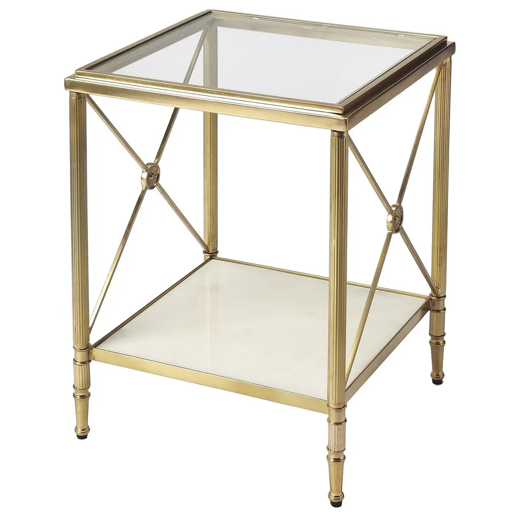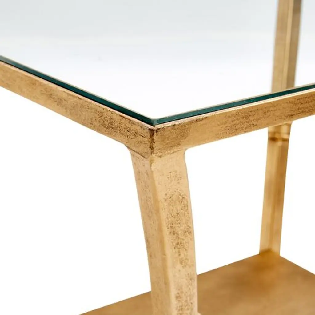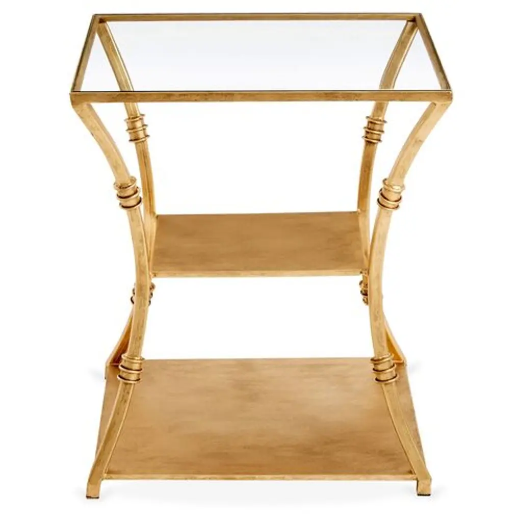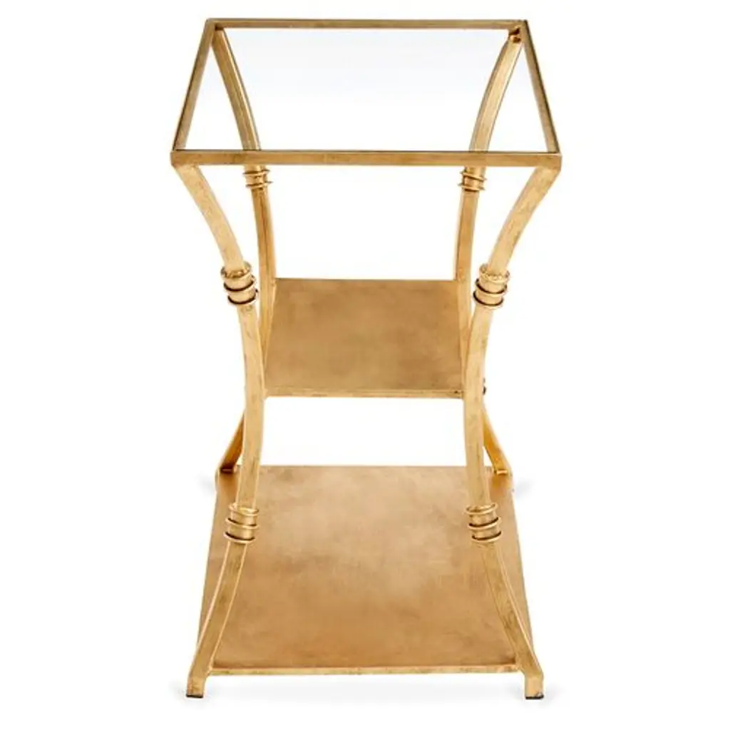 Designed by us and available only at One Kings Lane: With three shelves, a clear glass top, and open framework, this iron side table provides plenty of room to store and display books, entertainment components, and favorite accents alongside the sofa or bed. A golden finish gives it warm, elegant appeal.