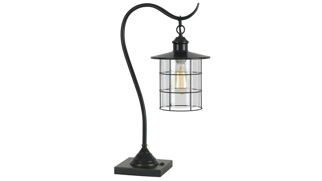 Nautical charm meets industrial edge in our Silverton Desk Lamp, a striking silhouette that adds character and clarity to your space.Inspired by coastal dock lights and vintage street lanterns, this lamp features a graceful swooping arm and a clear glass shade encased in a sturdy metal cage. The matte black finish with bronze accents adds timeless appeal, while the exposed bulb design brings a touch of retro flair—perfect for showing off a vintage Edison bulb. Whether anchoring your home office, brightening a side table, or adding ambiance to a reading nook, this lantern-style lamp offers both style and substance.