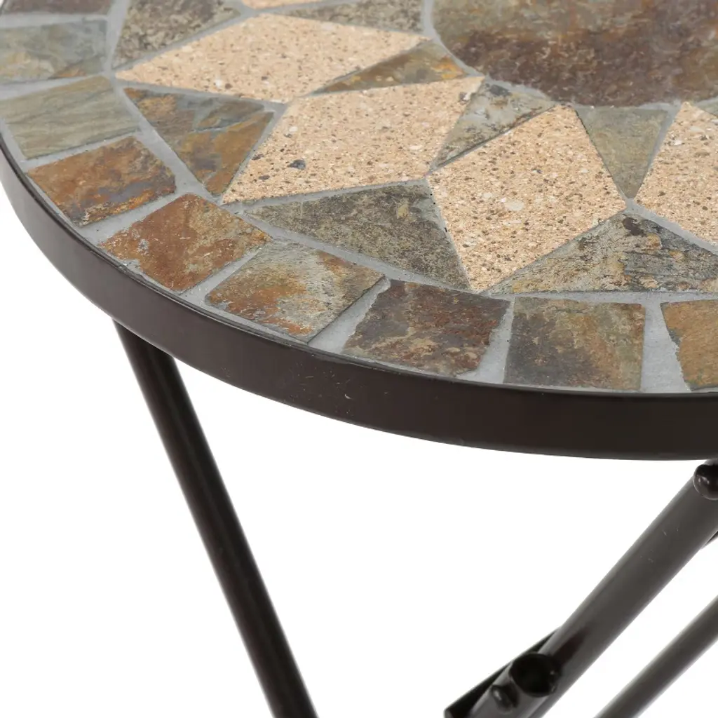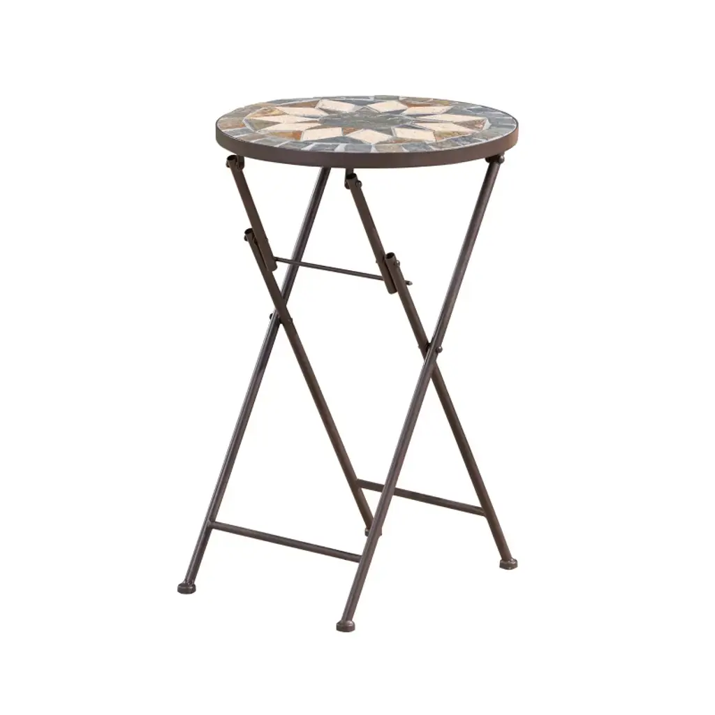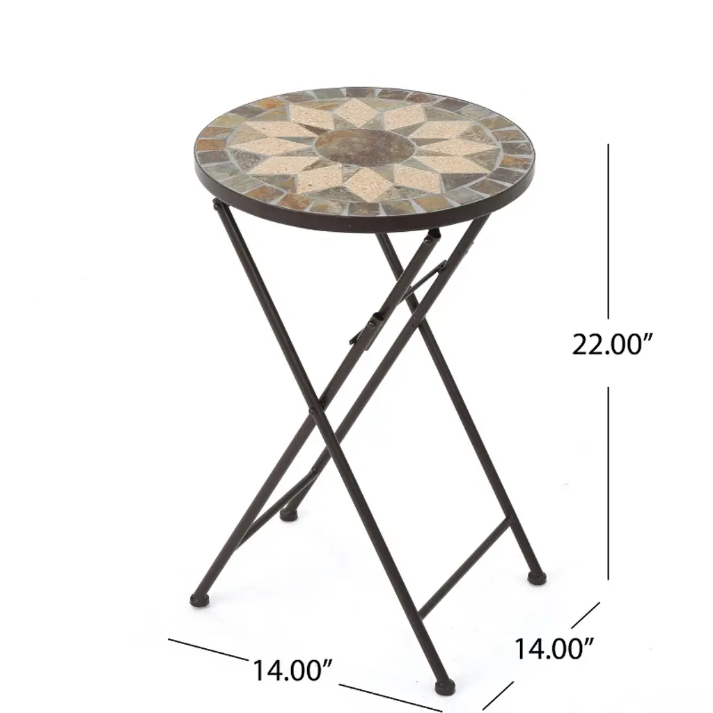 Transitional: The transitional style of this accent table is sure to give your outdoor space a minimalistic yet classic look that will match seamlessly with any arrangement you currently have. With a simple folding frame topped with a stone mosaic, this table will give your backyard or patio space an instant upgrade in style. Stone mosaic: The top of this accent table is completed with a gorgeous stone mosaic that features a beautiful sunburst design. Foldable: Designed to be compact, this side table can fold for easy storage or transport. Simply unlock the hinge and fold the tabletop flush against the frame. Dimensions: Choose an accessory that is the perfect size for you and your furniture. This accent table is 14.00" W x 14.00" D x 22.00" H. You will love how much your space can transform with the simple addition of this charming table. Assembly required: Some assembly is required for this accent table. All of the instructions and tools needed for assembly are included.