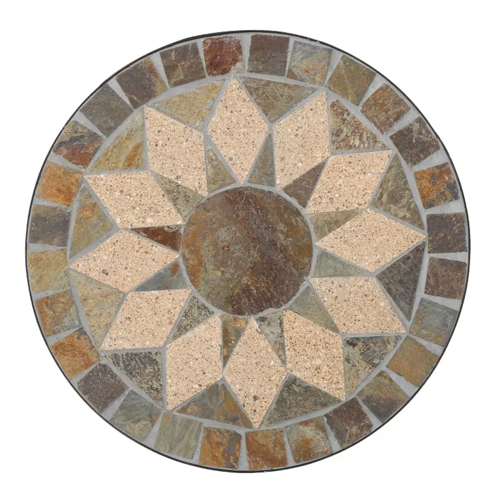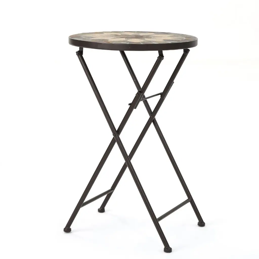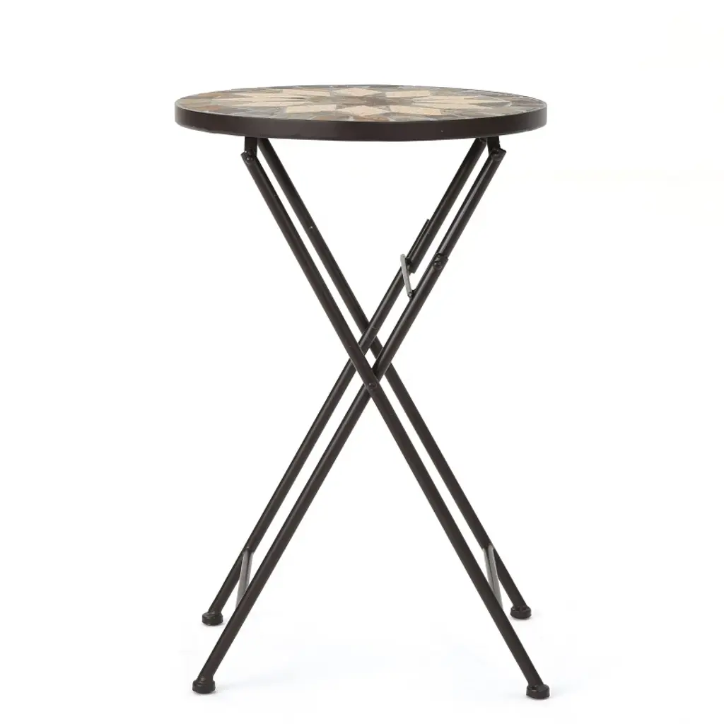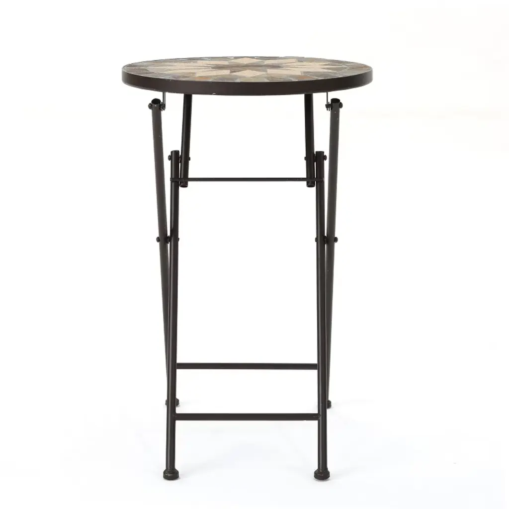 Transitional: The transitional style of this accent table is sure to give your outdoor space a minimalistic yet classic look that will match seamlessly with any arrangement you currently have. With a simple folding frame topped with a stone mosaic, this table will give your backyard or patio space an instant upgrade in style. Stone mosaic: The top of this accent table is completed with a gorgeous stone mosaic that features a beautiful sunburst design. Foldable: Designed to be compact, this side table can fold for easy storage or transport. Simply unlock the hinge and fold the tabletop flush against the frame. Dimensions: Choose an accessory that is the perfect size for you and your furniture. This accent table is 14.00" W x 14.00" D x 22.00" H. You will love how much your space can transform with the simple addition of this charming table. Assembly required: Some assembly is required for this accent table. All of the instructions and tools needed for assembly are included.