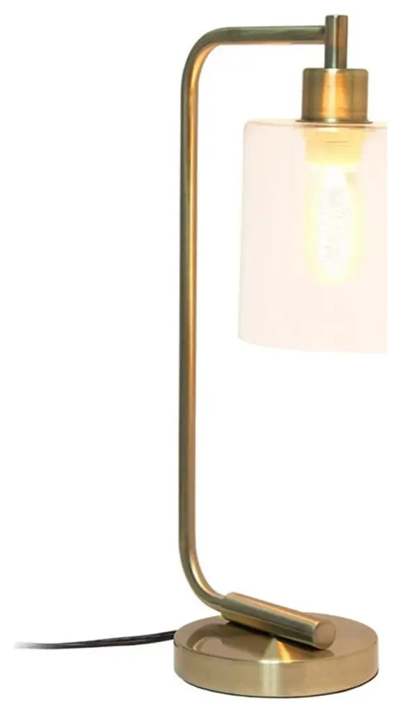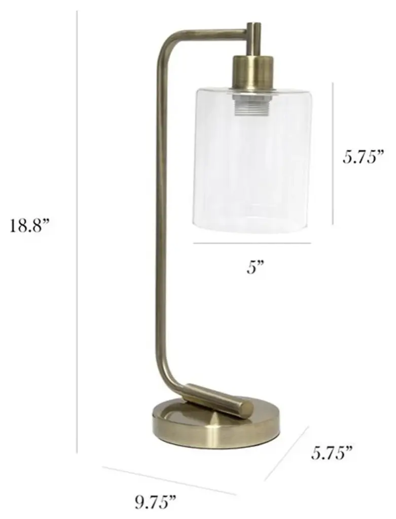 The sophistication of industrial accents gleams in this beautifully crafted iron desk lamp. The humble design combines a simple base with a curved arm and a clear glass shade for the perfect ensemble. Place on a desk or bedside table for a modest, refined look in fashion lighting. • • HELPFUL TIP: To get the complete industrial look, we recommend using a decorative Edison/Vintage bulb (not included). • • Features: • INDUSTRIAL STYLE: A lovely antique brass finish styles the base of this lamp, paired with a clear cylinder glass shade to inspire a simple or vintage style look equipped to light your space. • ACCESSIBLE SWITCH: An easily accessible on/off rocker switch is located on the cord of this desk lamp to allow a quick and easy on/off function as needed. Lamp is also equipped with a 5 foot black plug in cord rooted at the base. • PRODUCT SIZE: Overall product size is L: 9.75" x W: 5.75" x H: 18.8" and weighs 3.2 lbs. The shade of this lamp measures Dia: 5" x H: 5.75". • ASSEMBLY & USE: Product ships mostly assembled and will only require you to secure the lamp shade to the base using the provided socket nut prior to use. • This desk lamp uses 1 x 40 watt equivalent type A19 standard E26 medium base bulb, which is not included in your purchase but can be easily found online or your local hardware store. For a full vintage look, a type T45 Edison bulb is recommended. • ADDITIONAL OPTIONS AVAILABLE: Additional metal finishes are available. If this finish doesn''t perfectly match your space, make sure to check out other options!Specifications: • Color/Finish: Antique brass • Assembly Required: No • Certifications and Listings: ETL
