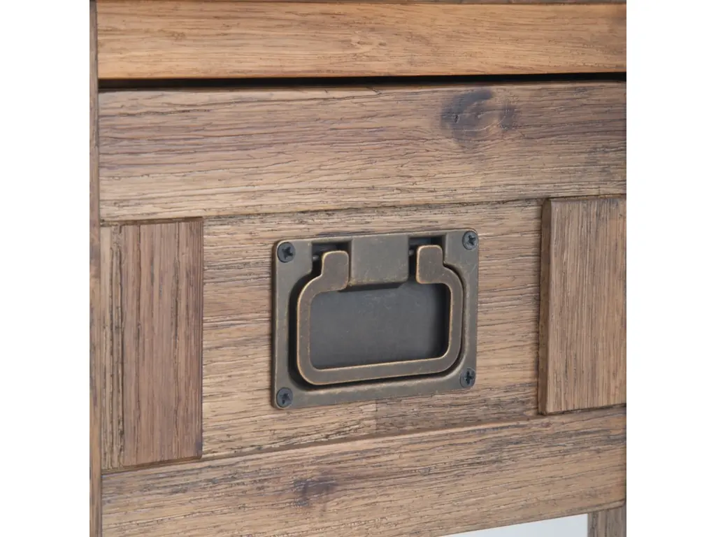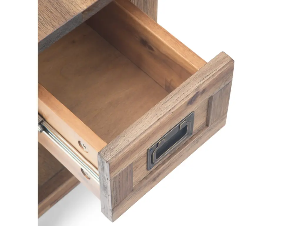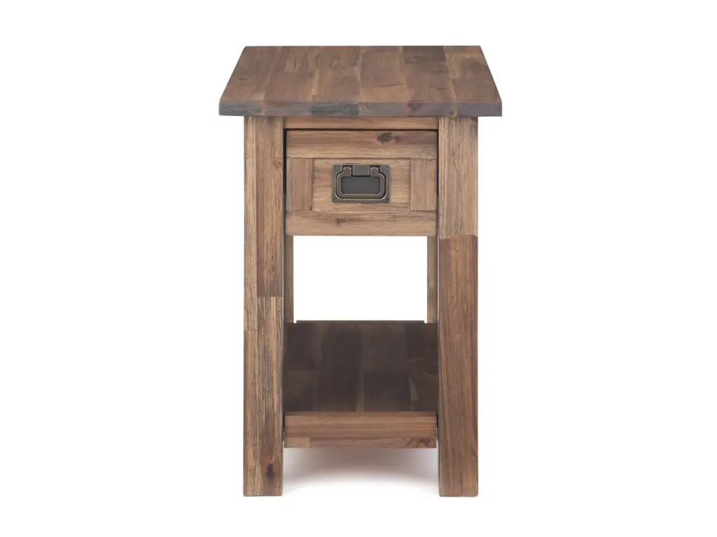Pair your sofa, accent chair or bed with the rustic contemporary Monroe Narrow Side Table. It features a single drawer and open bottom, perfect for storing and displaying treasured mementos. This striking table is made from beautiful and distinct acacia solid wood. With its clean lines, shaker style paneling and antique brass pulls, the Monroe Narrow Side Table will enhance your room decor. The Monroe collection includes a matching coffee table.
