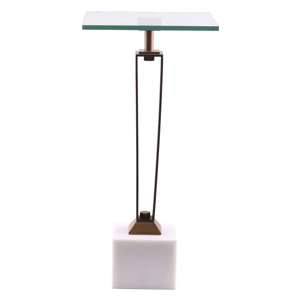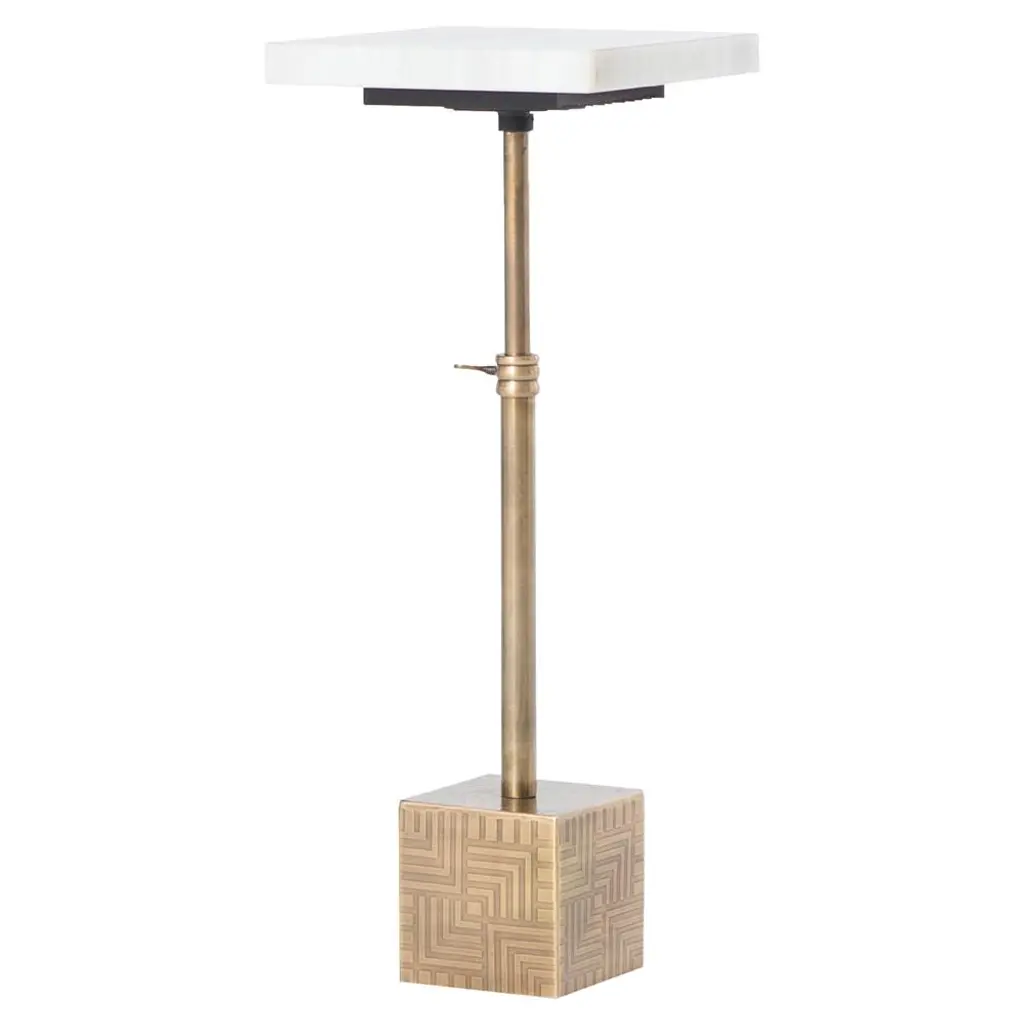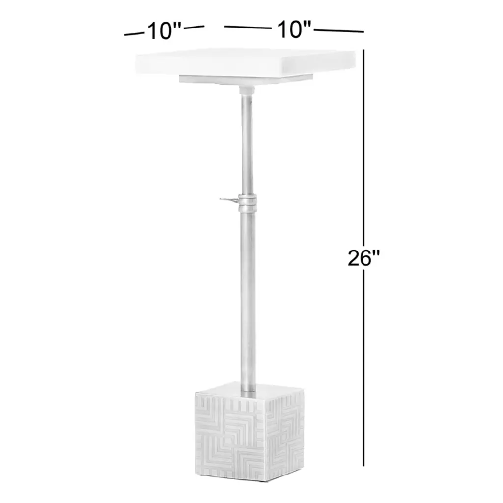 A heavy, acid-etched steel block anchors a telescoping base and a gleaming white marble top. Adjust up or down to hold drinks beside a sofa, or as a pedestal for a treasured object. Unique marks and slight variations in the design may occur as part of the etching process.
