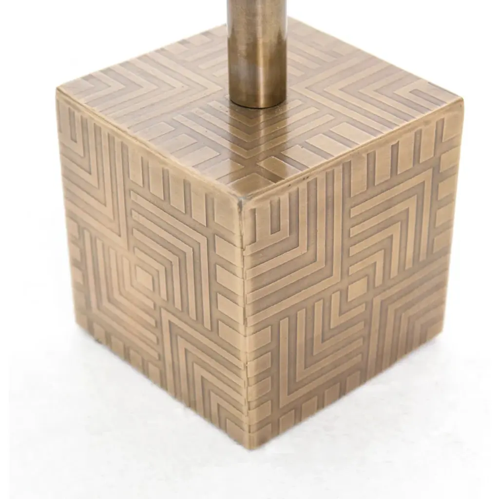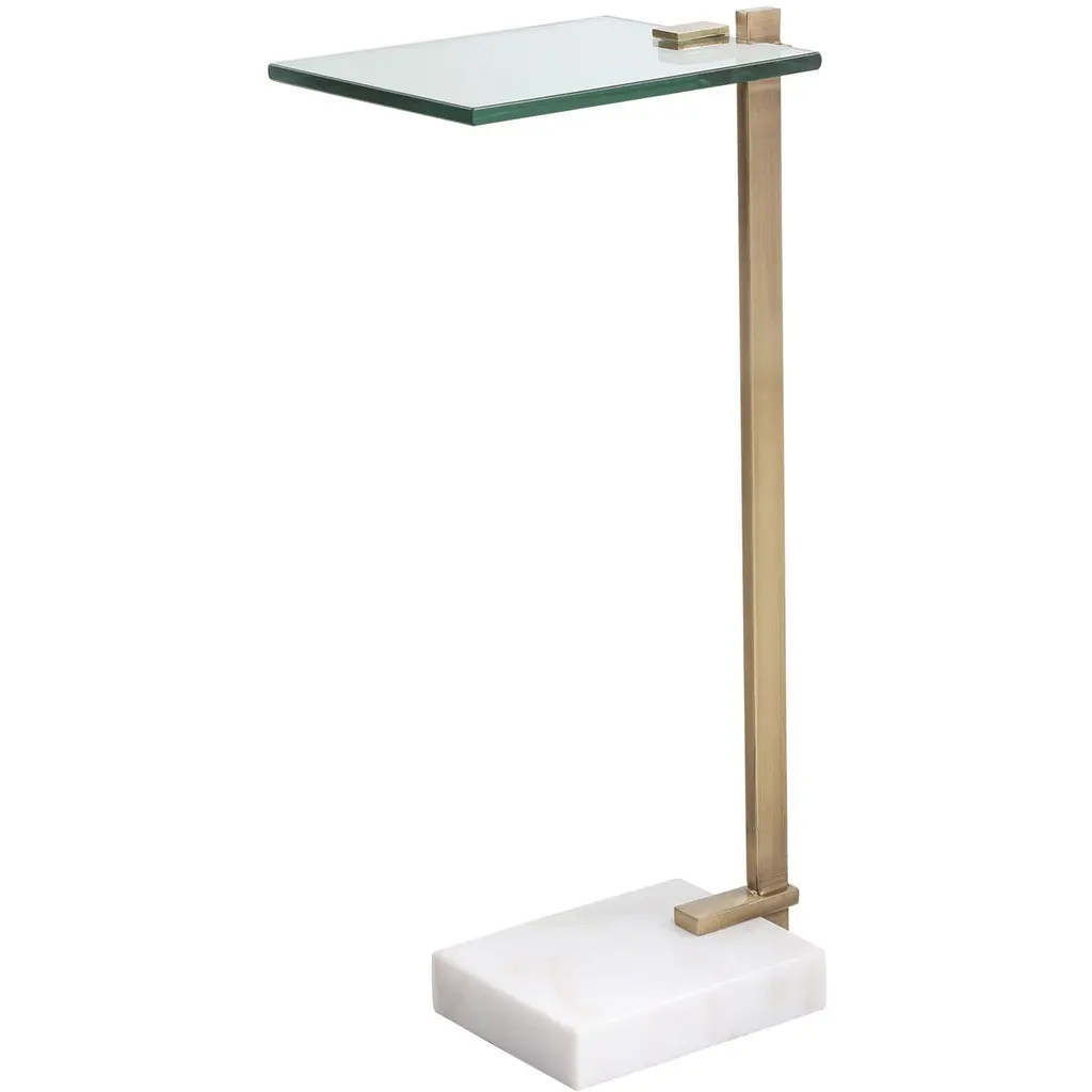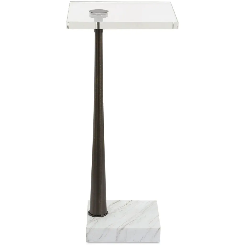 A heavy, acid-etched steel block anchors a telescoping base and a gleaming white marble top. Adjust up or down to hold drinks beside a sofa, or as a pedestal for a treasured object. Unique marks and slight variations in the design may occur as part of the etching process.